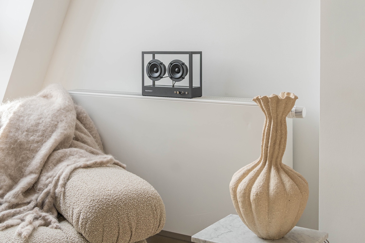 SMALL TRANSPARENT SPEAKER(スモール トランスペアレント スピーカー)は、インテリアとの親和性を最大限に高めた上、本気で環境問題に向き合った世界初のスピーカーです。アルミニウムフレームと強化ガラスで覆われた強靭な筐体は、永きにわたりあなたのそばを離れることなく、常に最新のデジタル技術に進化し続けることが可能です。スピーカーの底面のコンパートメントにモジュールが完全に隠れるように設計されています。あらゆる空間にパワフルでバランスの取れたクリアなサウンドを解き放ちます。