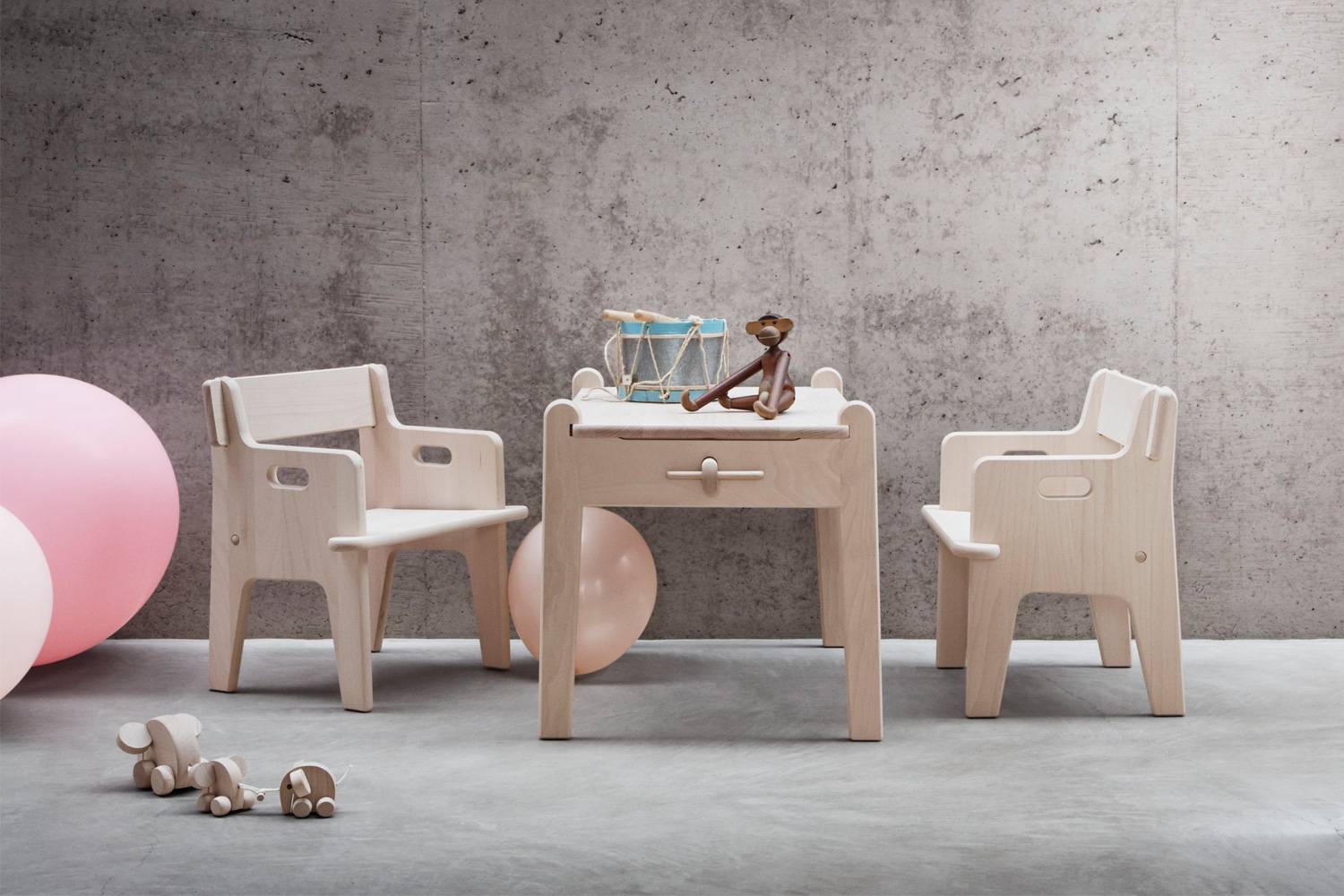 優れた家具職人でもあったウェグナーは、簡素ながら楽しいテーブルと椅子を作成しました。 家具として機能するばかりでなく、同時に玩具としても楽しめる子供用家具です。 道具を一切使用せずに、組み立てと分解ができる椅子。それはまるで実寸大の3次元ジグソーパズル、しかも安全を考慮し鋭角な部分は全くありません。素材は無塗装のビーチ材。安心してご使用頂ける子供用家具です。コーディネートテーブルはこちら