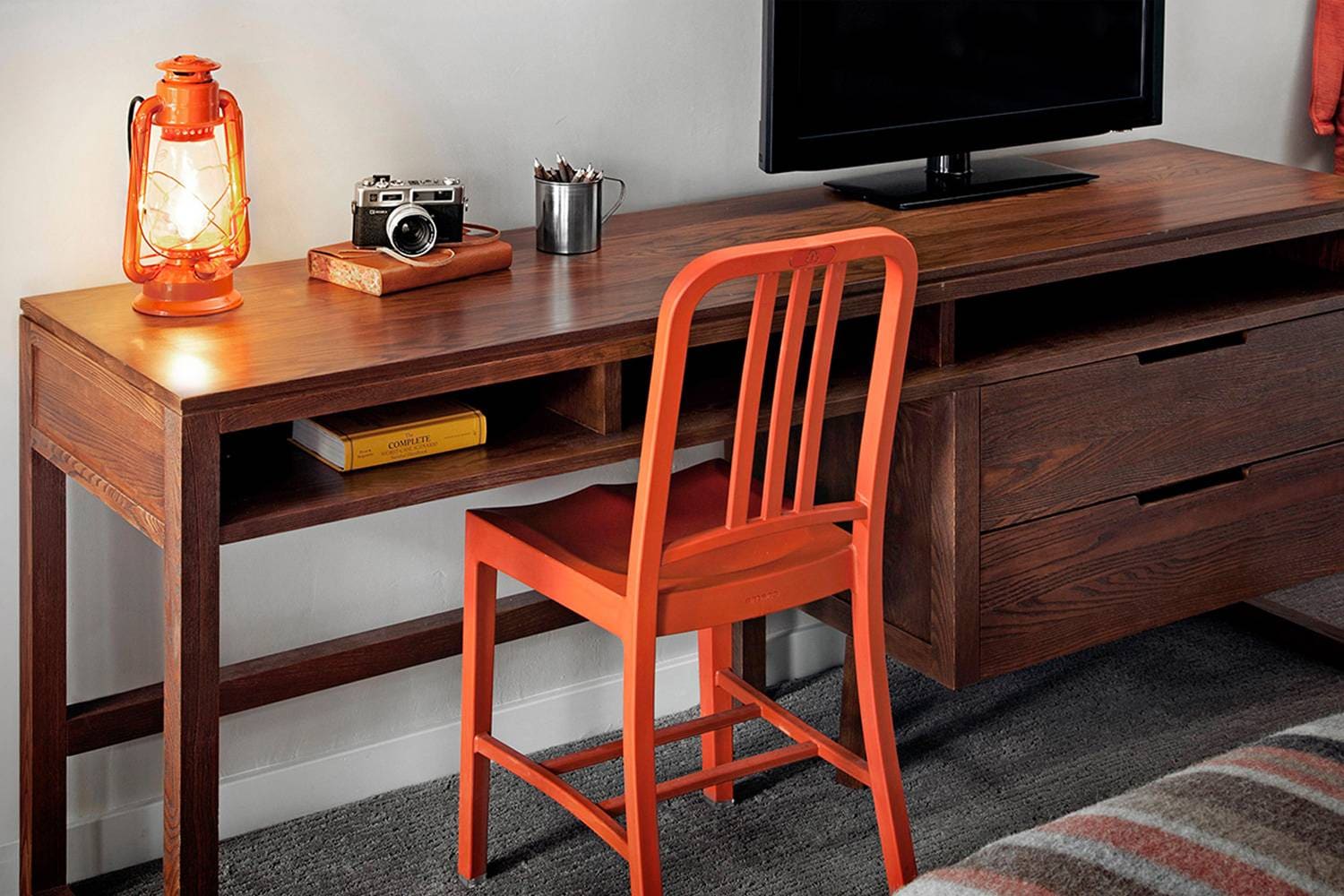 Emeco(エメコ)は第二次世界大戦中の1944年、アメリカ、ペンシルバニア州のウィルトン・カーライル・ディンギスによって設立された家具メーカー。当時、アメリカ政府から、アメリカ海軍の船と潜水艦で使用できる椅子を作るよう要請されました。耐久性に優れ、軽く錆びにくい椅子を作るため、選ばれた材料は良質なアルミニウムでした。エメコはこの椅子を「1006(テンオーシックス)」と名づけましたが、現代では「海軍」の「Navy」から「ネイビーチェア」という名称が定着しています。工業的な見た目とは裏腹に、ハンドメイド製品であるネイビーチェアは、77もの工程を経て生まれています。近年はリサイクル製品の生産にも乗り出し、高い品質と信頼があります。