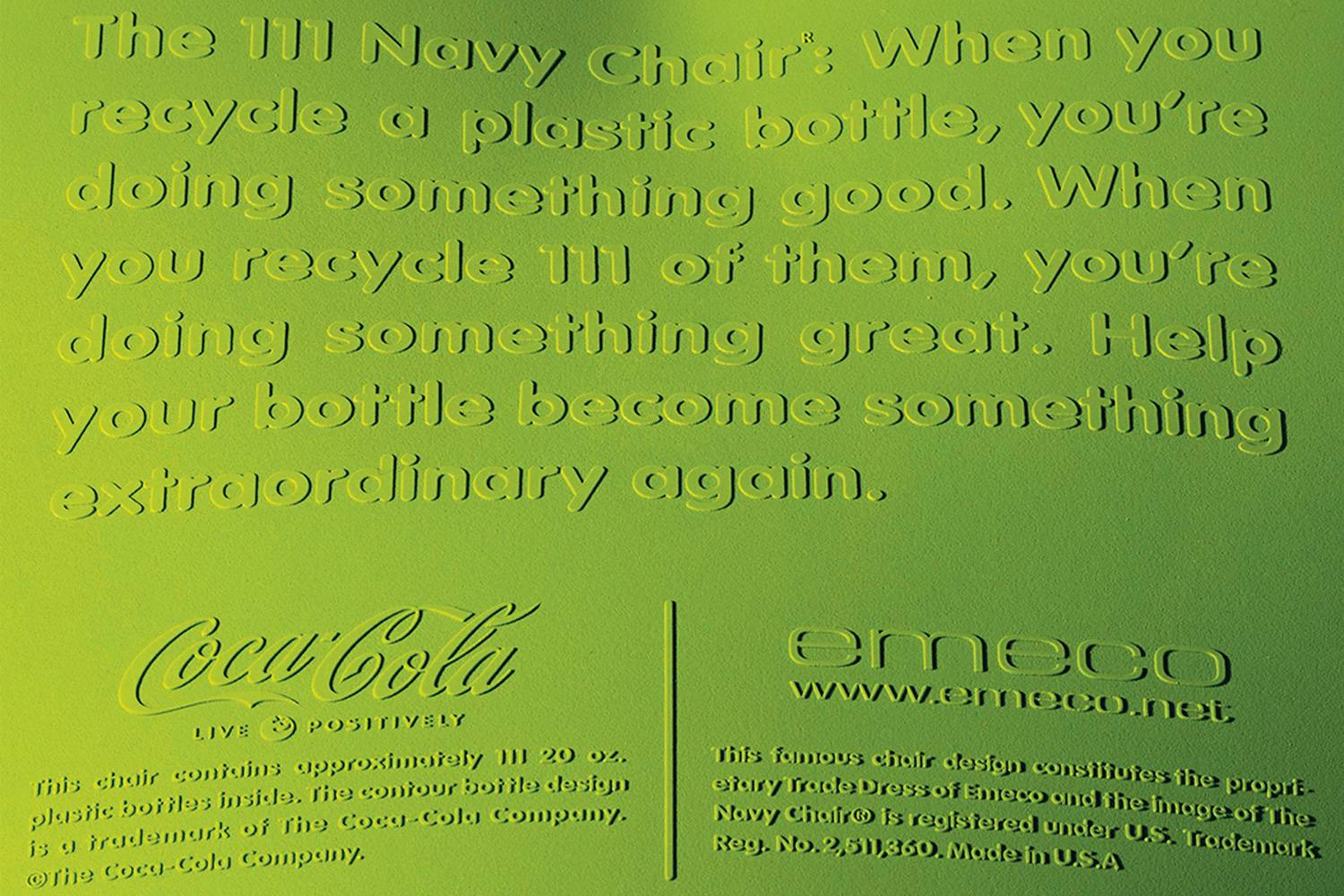 エメコ社とコカコーラ社との共同開発された111本の再生ペットボトルを原材料としたプラスチックチェアです。 地球環境のために、プラスチックボトルを再利用するのはすばらしい試みです。 約111本のプラスチックボトルをリサイクルして、1脚の椅子が生まれました。