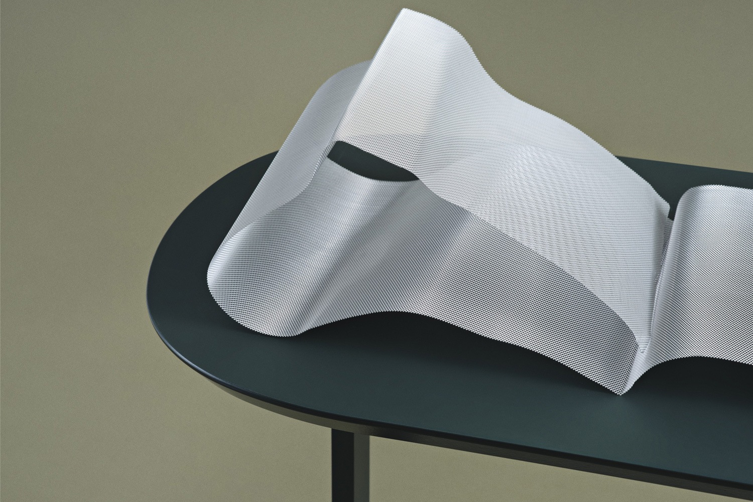 スチールフレームに施された粉体塗装は、上品な艶を見せながら、腐食の防止や耐久性を高める役割を果たします。テーブルの表面は、ラッカー仕上げのリノリウムになっており、マットな質感が特徴です。