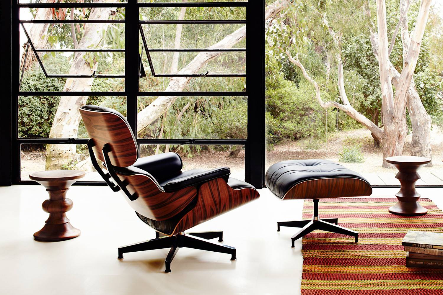EAMES TURNED STOOL(イームズターンドスツール)は、チャールズ&レイ・イームズが1960年にニューヨークのロビー用にデザインした、芸術性あふれるスツールです。全体を無垢のウォールナット材から削り出した、彫刻作品のような美しいフォルムは、家具としての機能性とオブジェのような存在感を兼ね備えています。座面は座るための適度な安定感があり、来客用の補助椅子としても活躍します。また、高さやサイズ感がちょうど良く、ソファ横やベッドサイドのサイドテーブルとしても最適です。花器や雑誌、アートピースを飾る台として使用すれば、部屋全体の印象が一段と引き締まります。