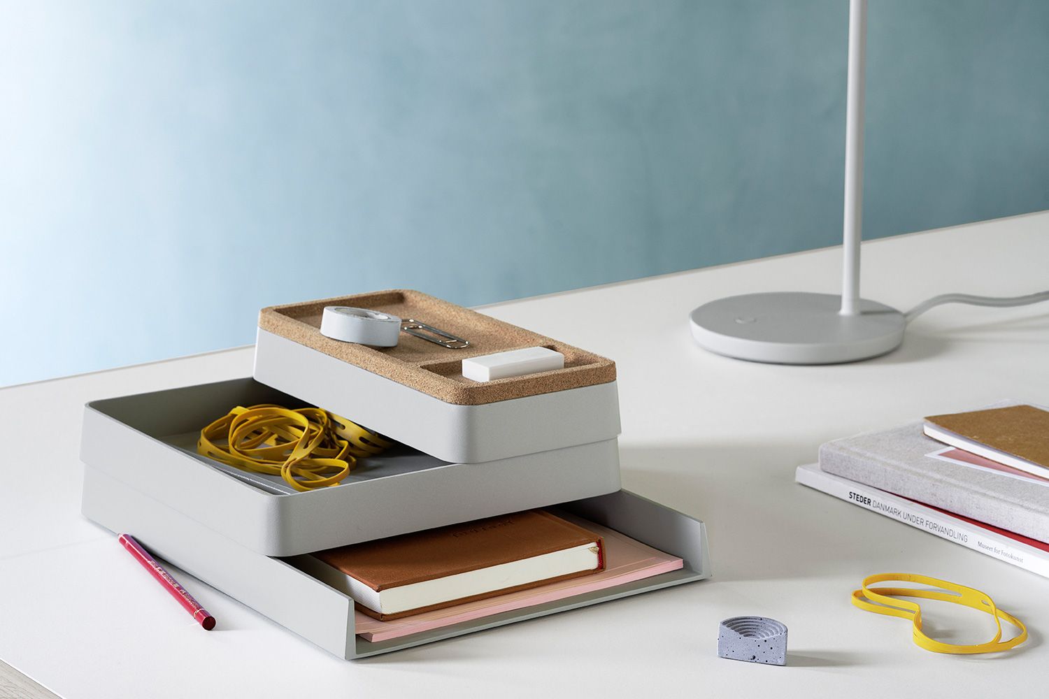 書類やステーショナリーをリサイクルプラスチック素材のトレイで机上を美しく整えることができます。 各トレイは固定されていないため、個別に使用することができます。