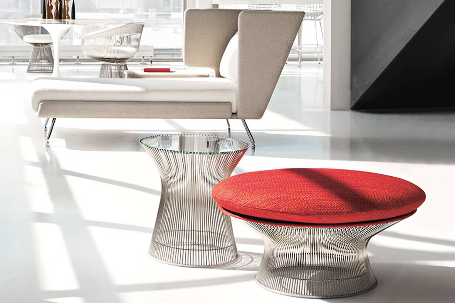 1966年にデザイナーのWarren Platner (ウォーレン・プラットナー)は「ルイ15世様式のような、装飾的で、優美なデザインをする余地がある」と話し、モダニズム家具にルイ15世様式のエッセンスを加えることで、新たな家具コレクションを生み出しました。プラットナーコレクションは、日本の竹細工のようにスチールロッドを連続して使用した、優雅でデコラティブなフォルムを見事に表現したシリーズです。光があたると、床にスチールロッドの影が映し出され、また違った魅力を見せてくれます。プラットナーコレクション特有の、スチールフレームの重なりによって発生する「モアレ」は意図したもの。