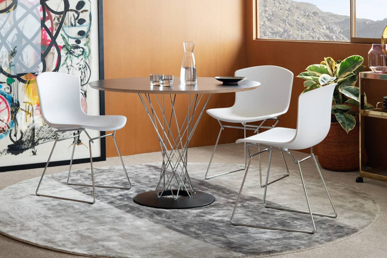 彫刻家でもあるハリー・ベルトイアは、当時活躍していたエーロ・サーリネンやミース・ファン・デル・ローエと同様に、工業用素材に崇高な美しさを見出しました。プラスチックならではの質感と細身の脚部によって、全体的に軽やかな印象を見せます。