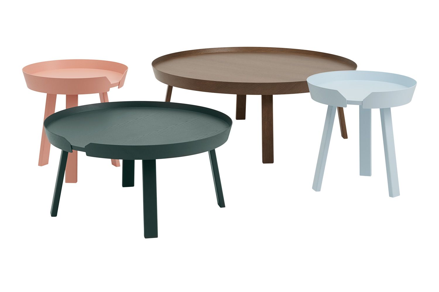 アラウンドコーヒーテーブルは、天板の縁を薄いベニア板のフレームで囲った、軽やかでユニークなデザインが特徴です。天板に施されたラッカー塗装は、木目や木の肌触りを残しつつも、北欧らしい落ち着いた色合いを見せます。