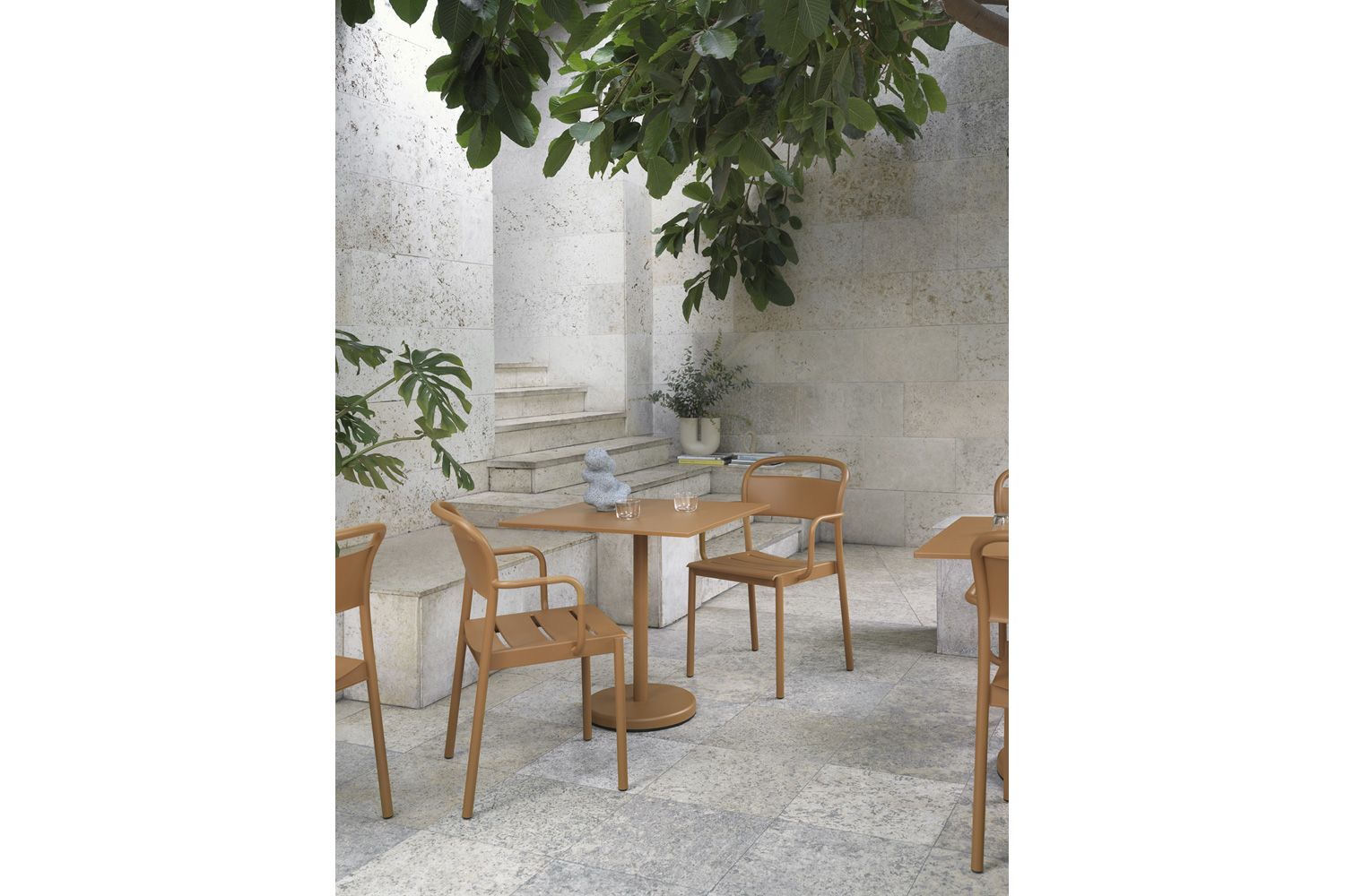 テーブルトップとベースは亜鉛メッキスチール製で、UVカットかつ耐候性に優れた深みのあるマットな粉体塗装仕上げとなっており、屋外での使用にも適しています。