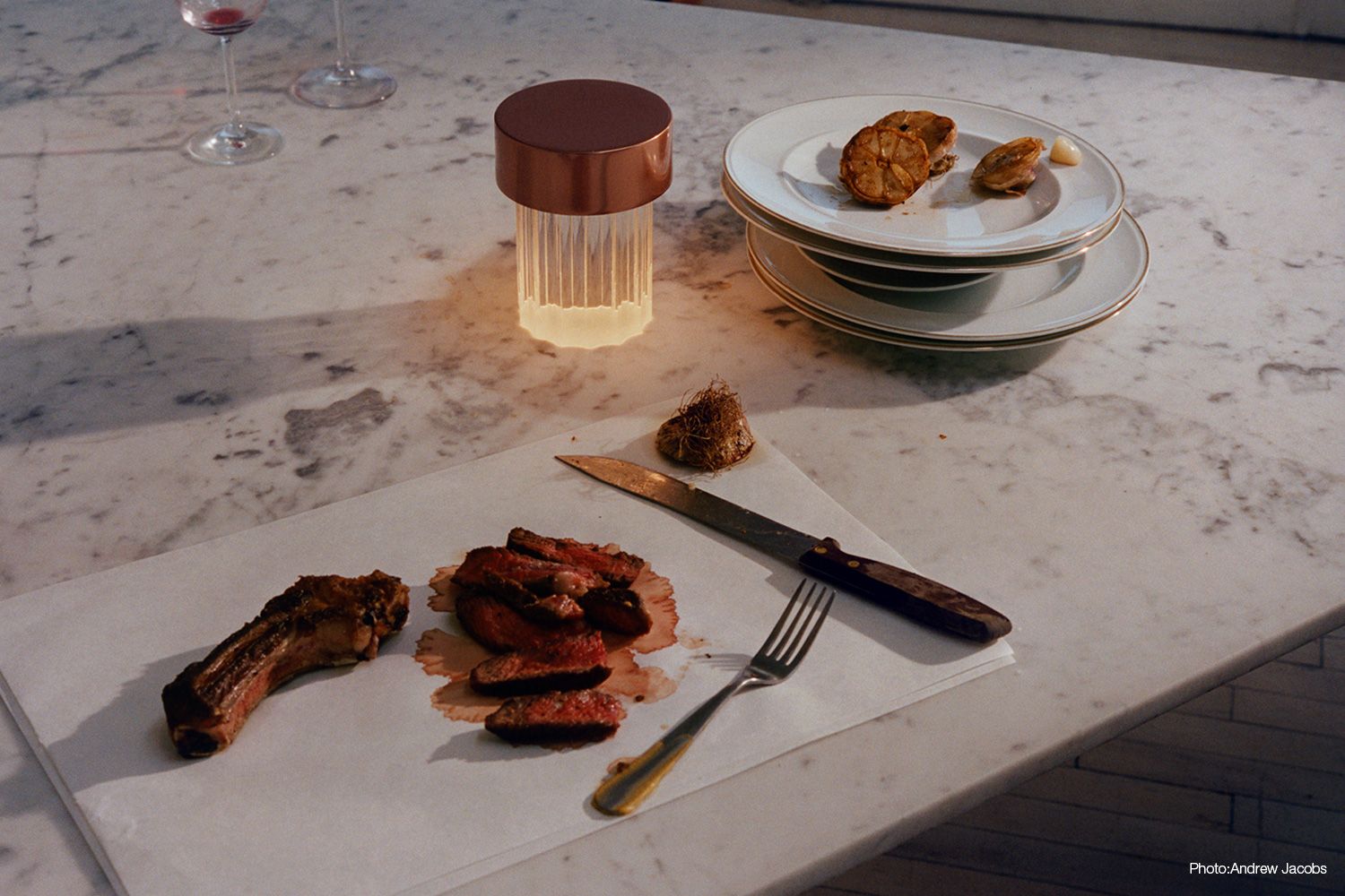 この小さくて優美なテーブルランプはUSB充電式で持ち運び可能です。 ガラスは彫刻的でタイムレスなFLUTED。トップカバーは、艶やかな仕上がりのゴールドとクローム、マットな仕上がりのコッパーとグリーンをラインナップしています。