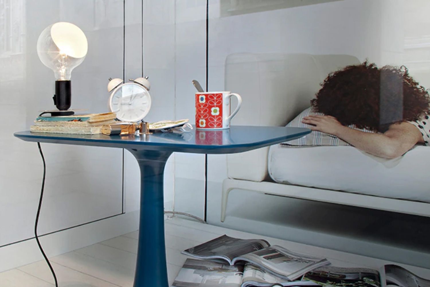 ランパディーナは、1972年にトリノのフロスストアのオープ二ングのために限定版として生産されました。トリノでの大成功をおさめた後、工業生産に移すことが決定されました。やがてこの小さなオリジナルのテーブルランプは、アッキレ・カスティリオーニの最も象徴的なオブジェクトの1つになりました。電球を意味するランパディーナは、シンプルで独創的なデザインにちなんで名付けられました。大きな電球はまぶしさを軽減するため、部分的にフロスト加工に仕上げています。余分な電源コードは、スイッチが組み込まれたアルミニウムベースのホルダーに格納されます。 近年ランパディーナの白熱電球はLED光源に置き換えられました。特殊技術により、フィラメントだけでなく白熱電球のような暖かな光も再現します。
