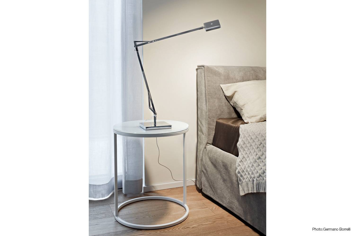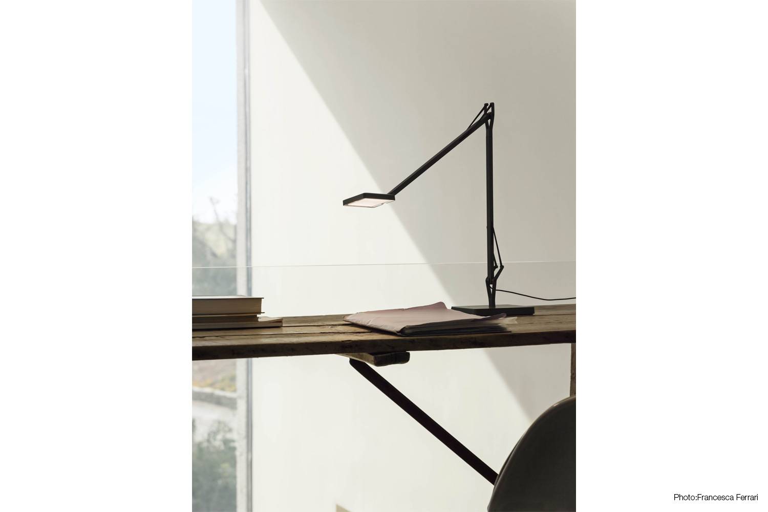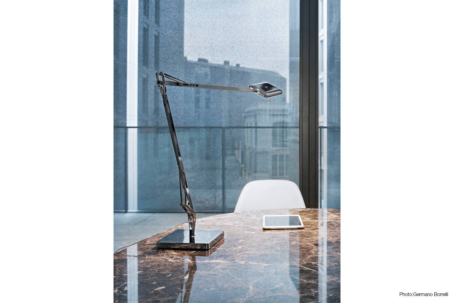 建築家・インテリアデザイナーのAntonio Citterio(アントニオ・チッテリオ)によるタスクライトKELVIN LED(ケルヴィン LED)は、新しいLED EDGE技術により、 発光効率は同じままでサイズはひとまわりコンパクトになりました。 スイッチはヘッド部分に設置され 、3段階調光 (100%・70%・40%) と 調色(2700K / 3200K)機能が備わっています。
