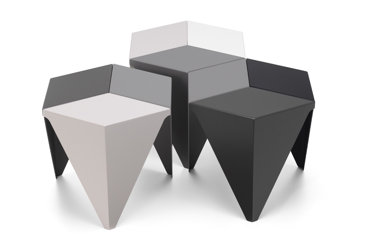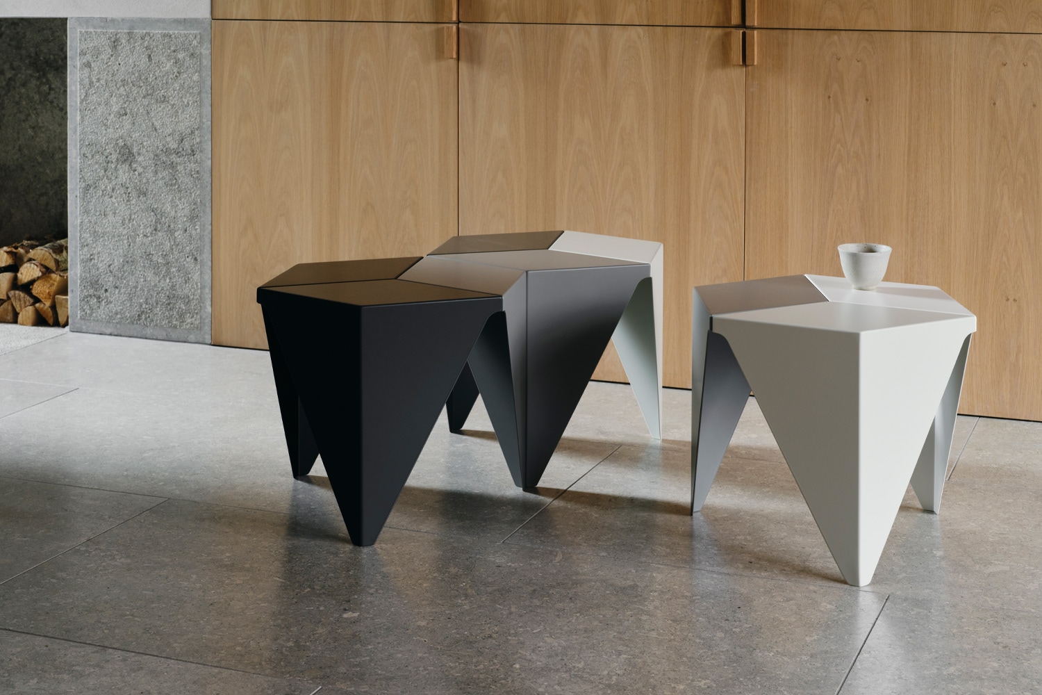今回の復刻では、イサム・ノグチがデザイン当初に思い描いていた濃淡ある3 つのグレーが組み合わされ、まさしく万華鏡のようです。1台でも目を引きますが、複数台組み合わせると立体的なモザイクのように見え、アート作品としても楽しめます。