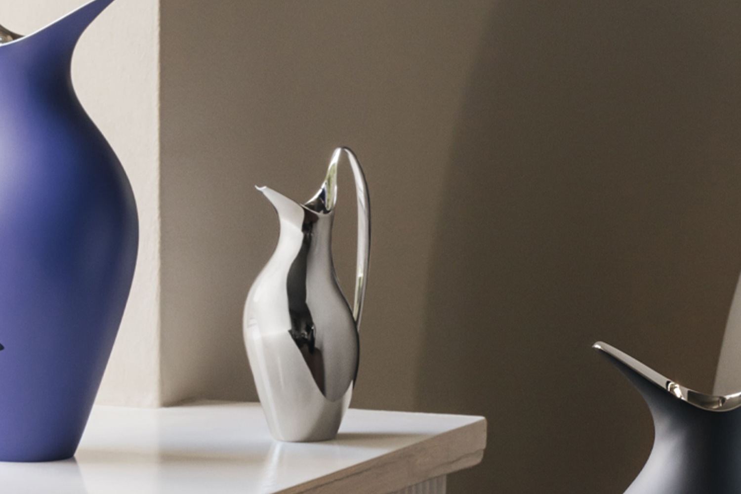 スリムで優美なフォルムのこのピッチャーは、GEORG JENSEN(ジョージ ジェンセン)を象徴する作品のひとつと言われるほどの名作。発表された当時の素材はシルバー素材でしたが、Henning Koppel(ヘニング・コッペル)の90歳の誕生日に合わせて2008年に復刻した際は素材をステンレスに変えて登場しました。水差しとしてはもちろんですが、アート作品のごとく、その美しい佇まいはただ置いておくだけでもオブジェとして存在感を放ちます。