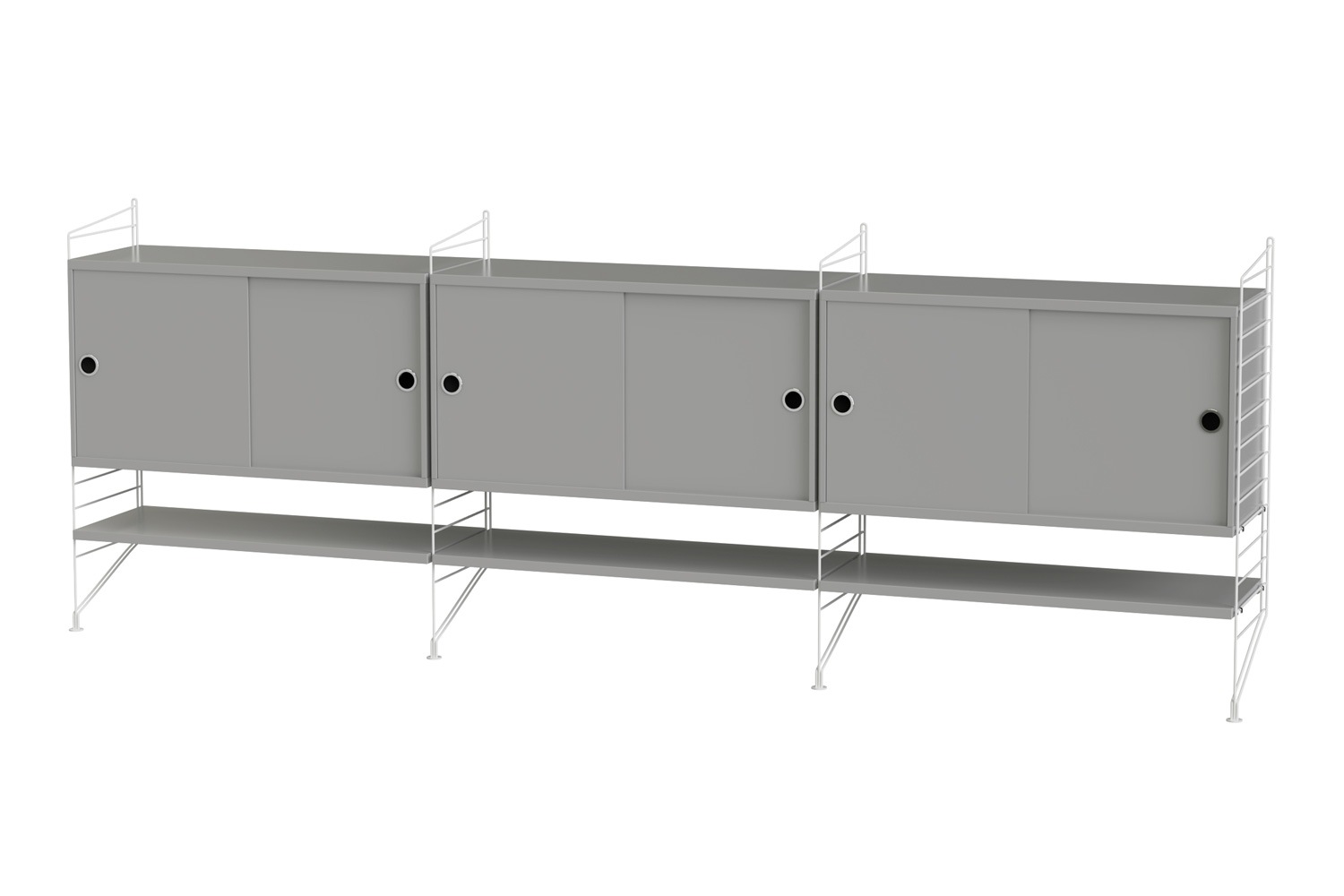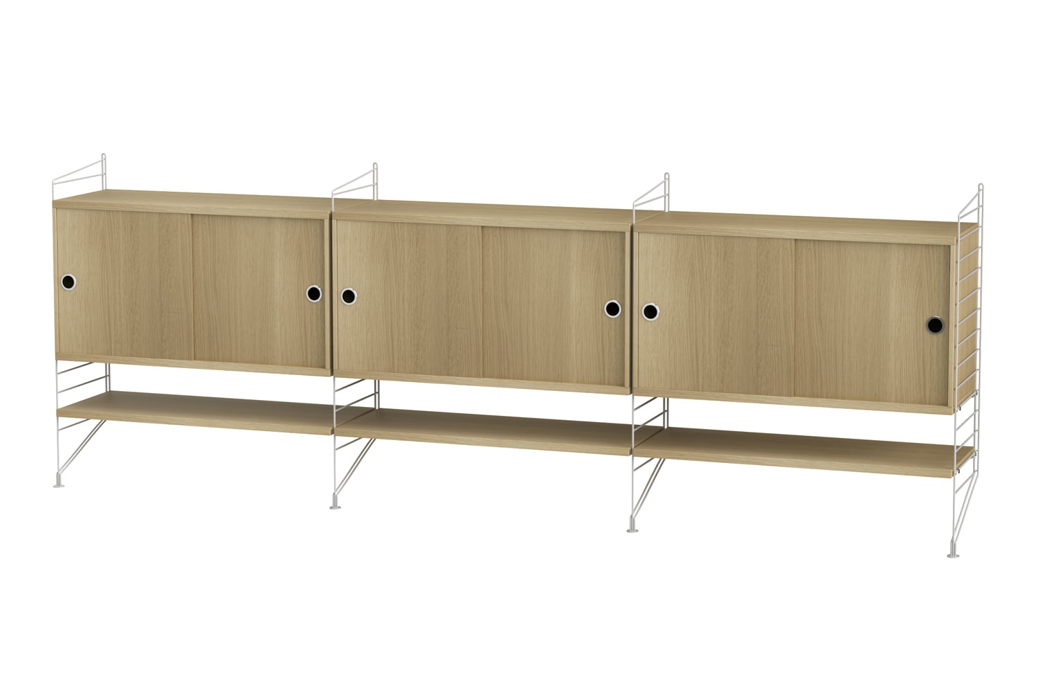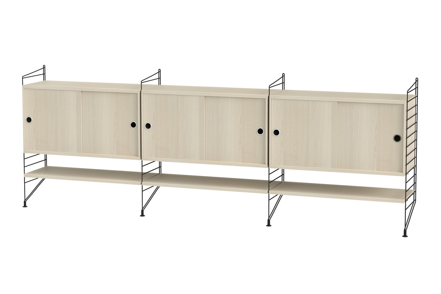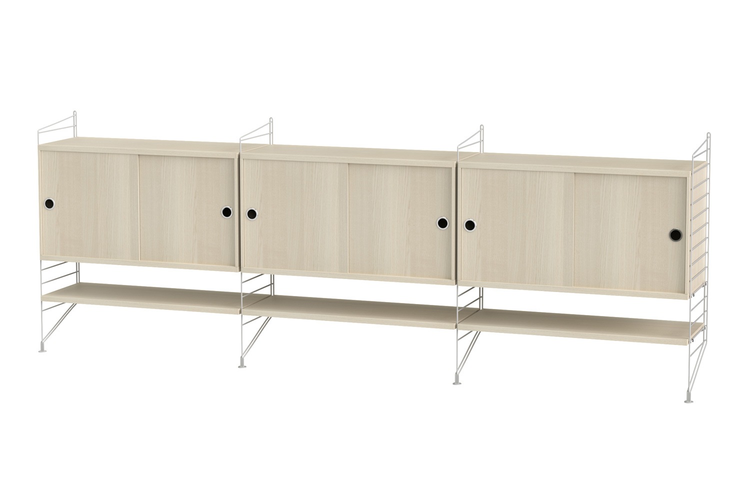 String®(ストリング)は、スウェーデンの建築家 Nils Strinning(ニルス・ストリニング)がデザインを手掛けた、モジュール式シェルフ。 こちらのBUNDLE LF(バンドル LF)は、壁付けタイプのサイドボードです。キャビネットと棚板が3連連結しており、収納力に優れています。