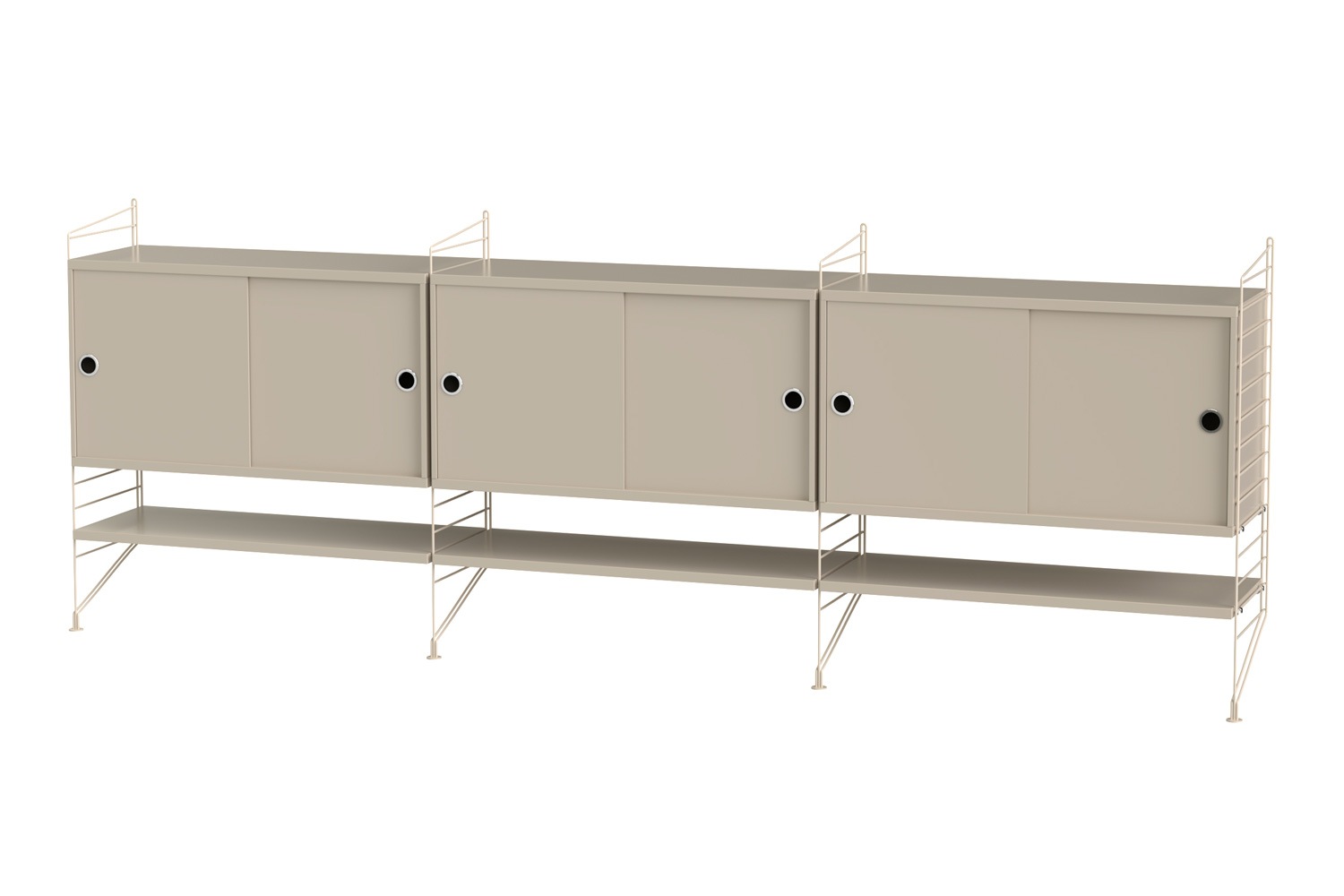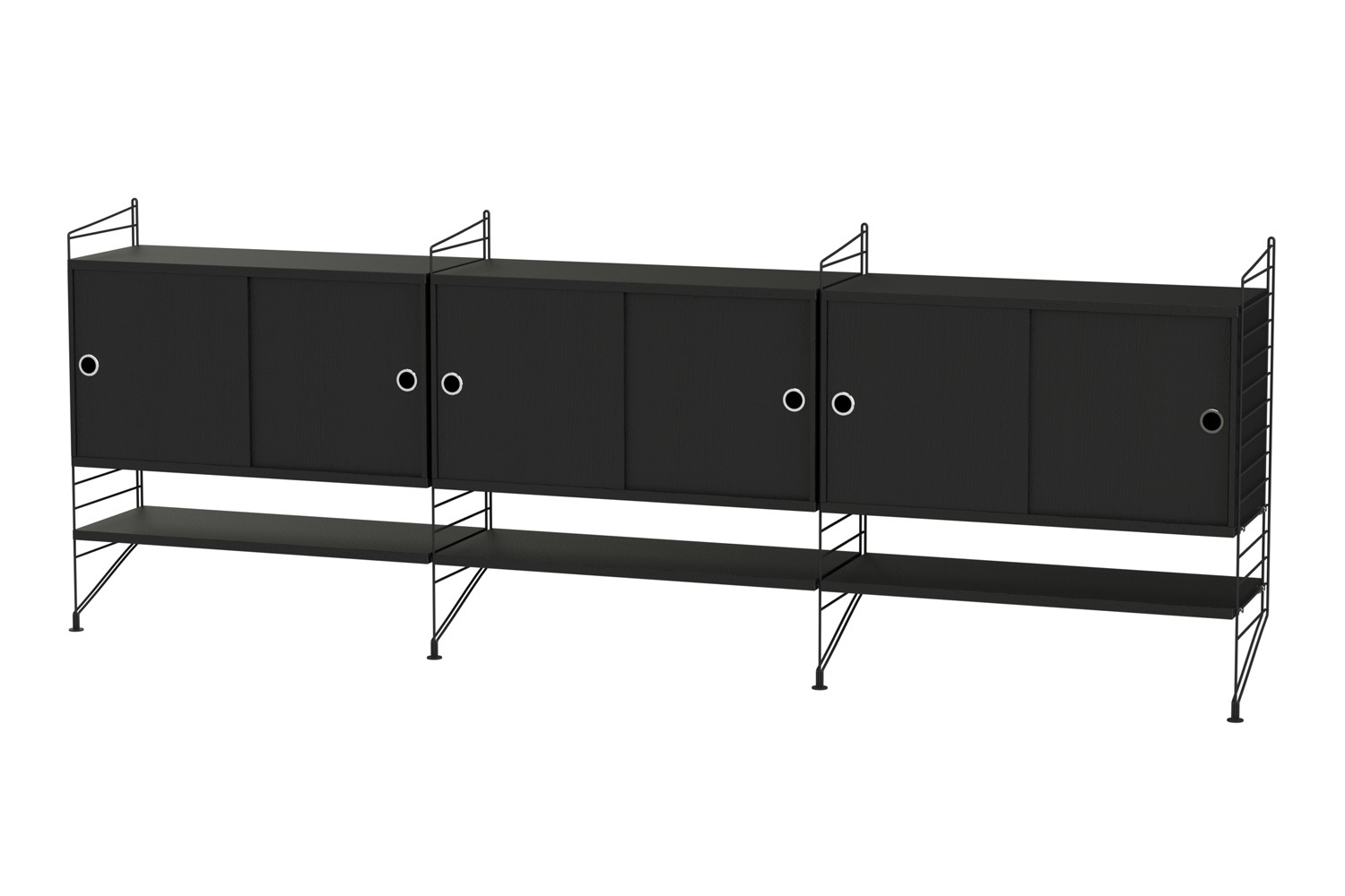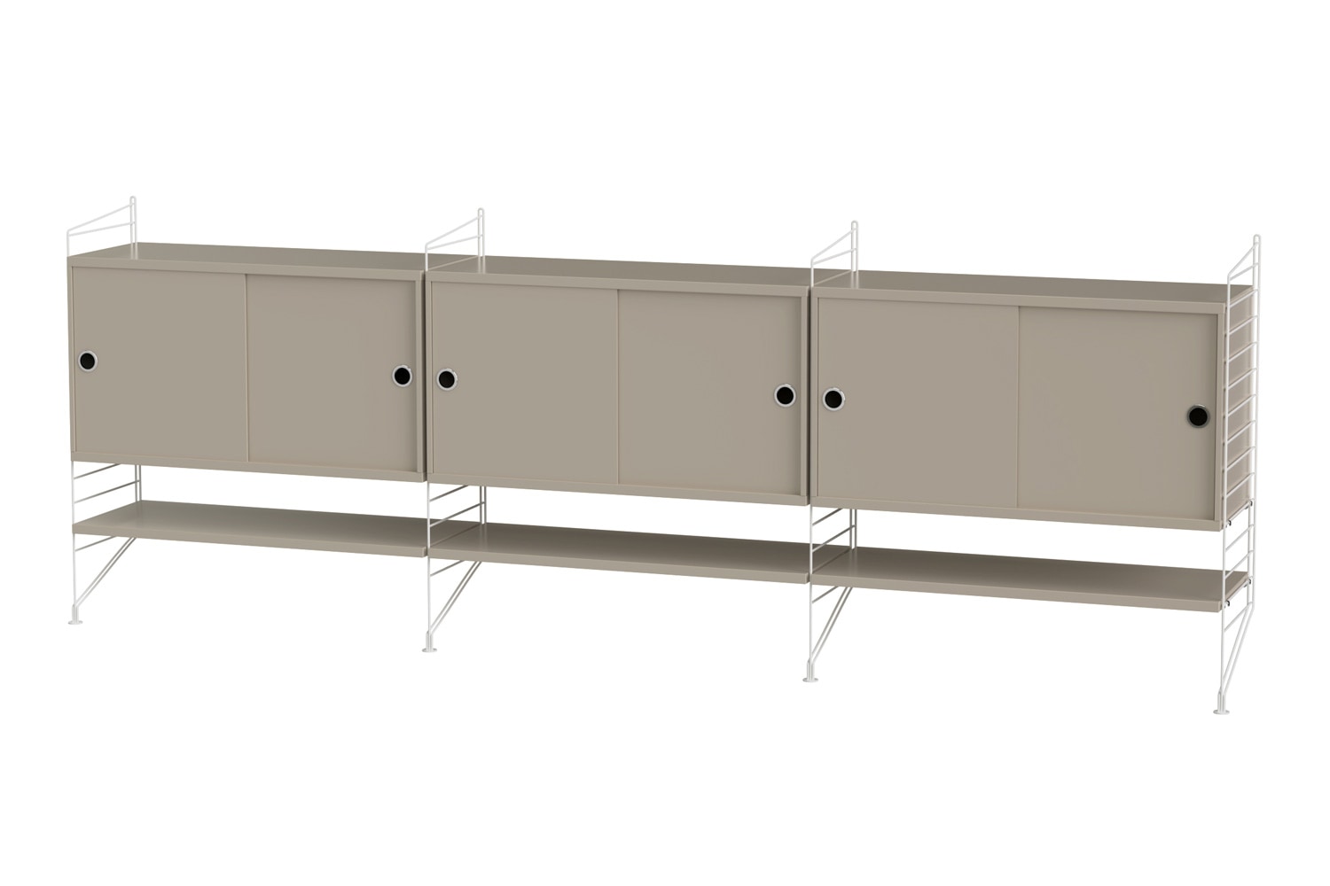 String®(ストリング)は、スウェーデンの建築家 Nils Strinning(ニルス・ストリニング)がデザインを手掛けた、モジュール式シェルフ。 こちらのBUNDLE LF(バンドル LF)は、壁付けタイプのサイドボードです。キャビネットと棚板が3連連結しており、収納力に優れています。
