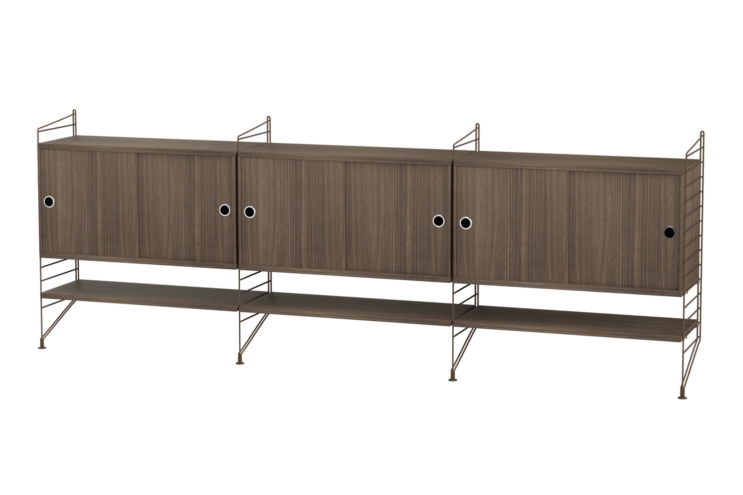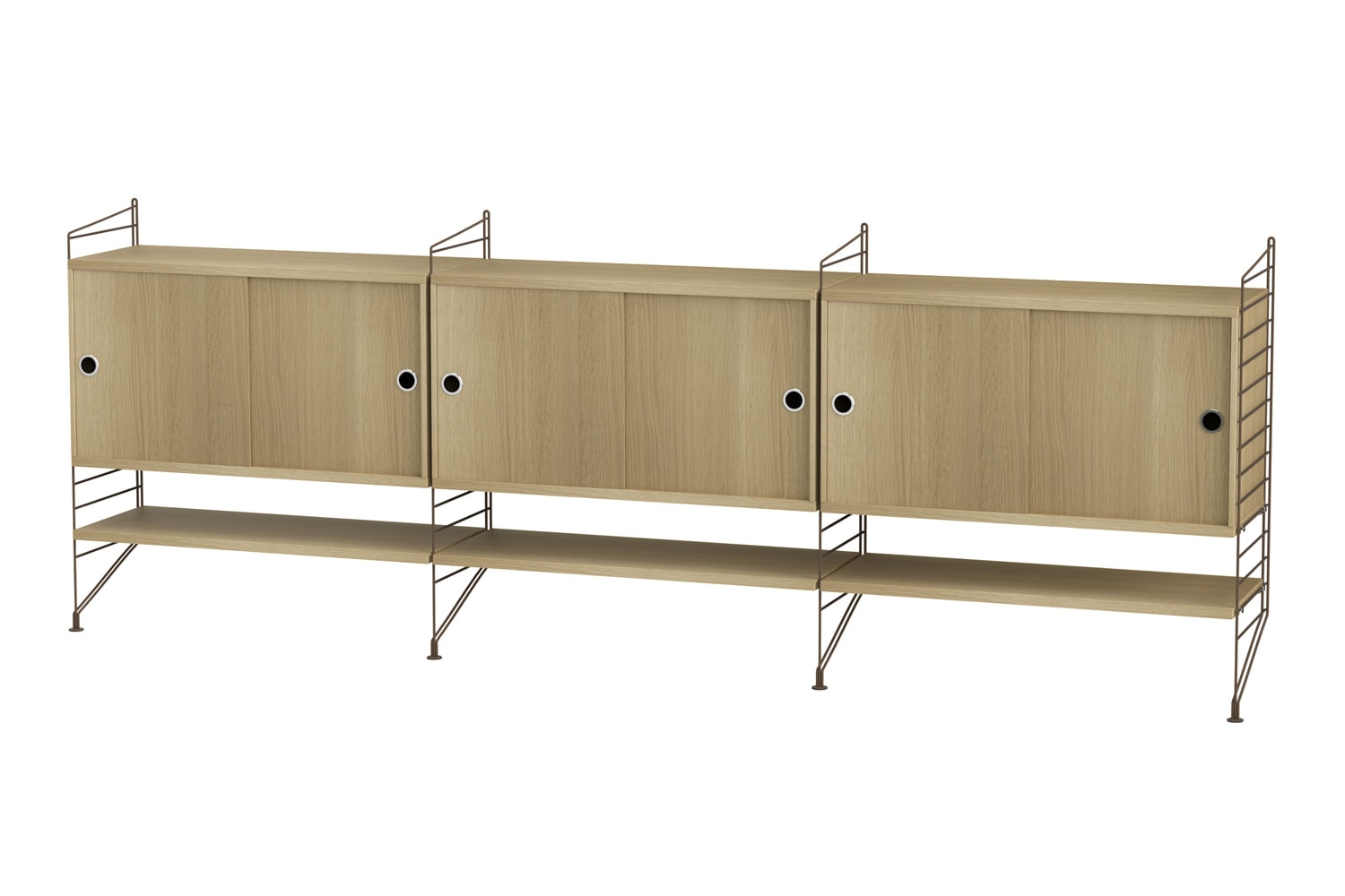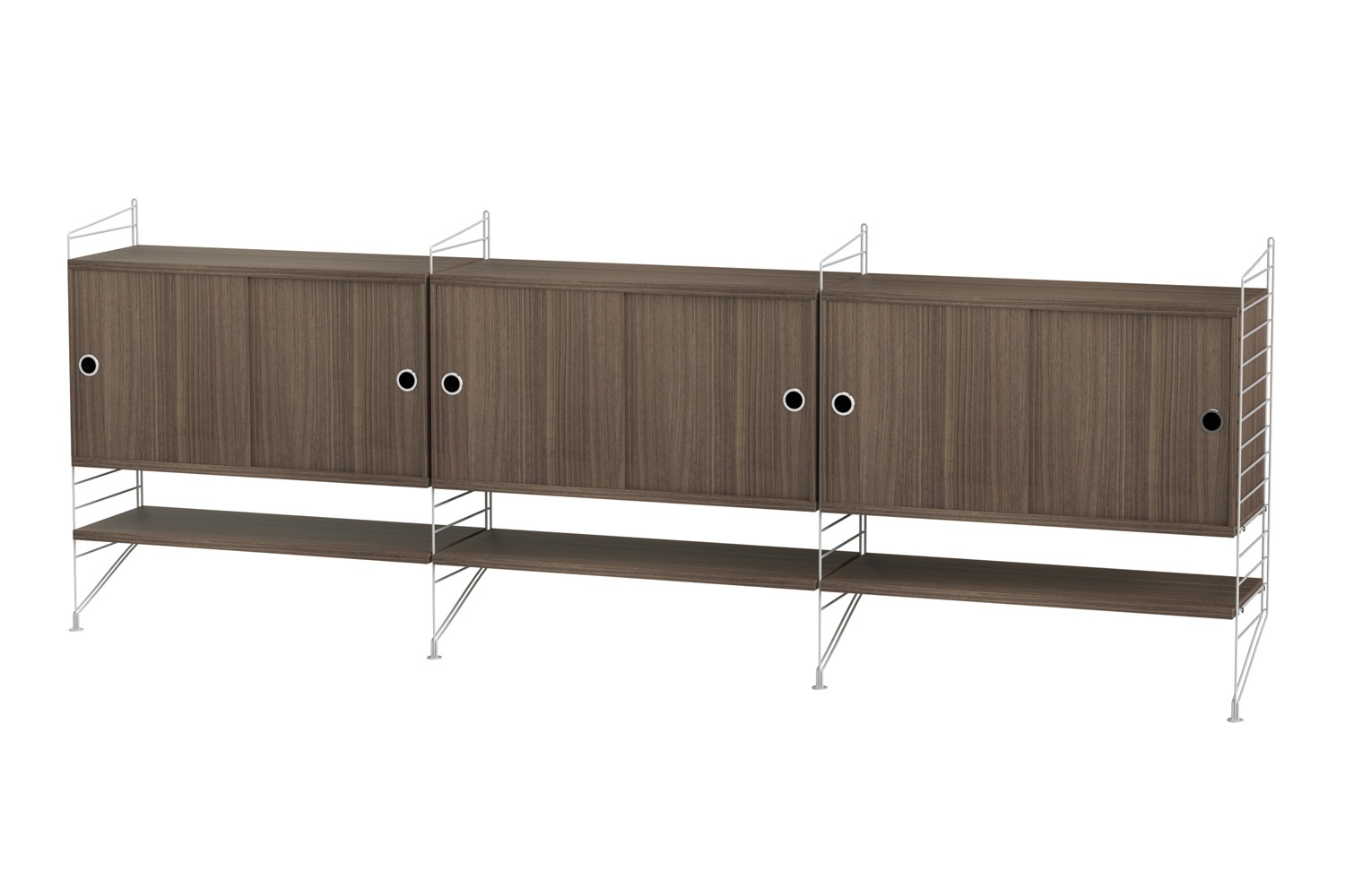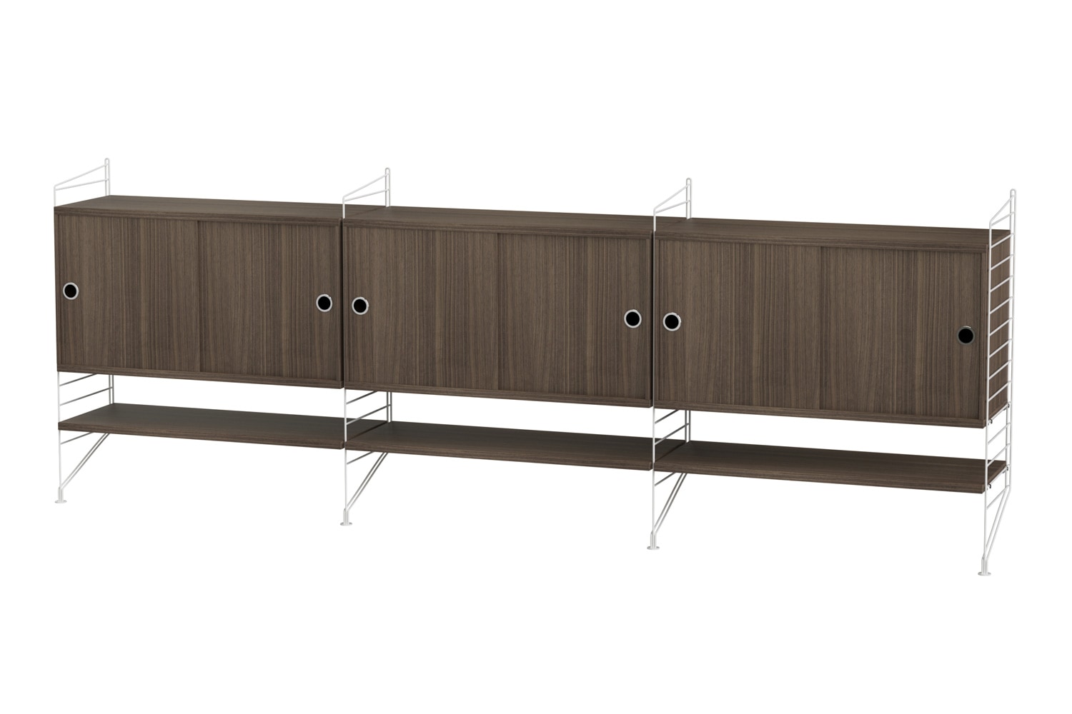 String®(ストリング)は、スウェーデンの建築家 Nils Strinning(ニルス・ストリニング)がデザインを手掛けた、モジュール式シェルフ。 こちらのBUNDLE LF(バンドル LF)は、壁付けタイプのサイドボードです。キャビネットと棚板が3連連結しており、収納力に優れています。