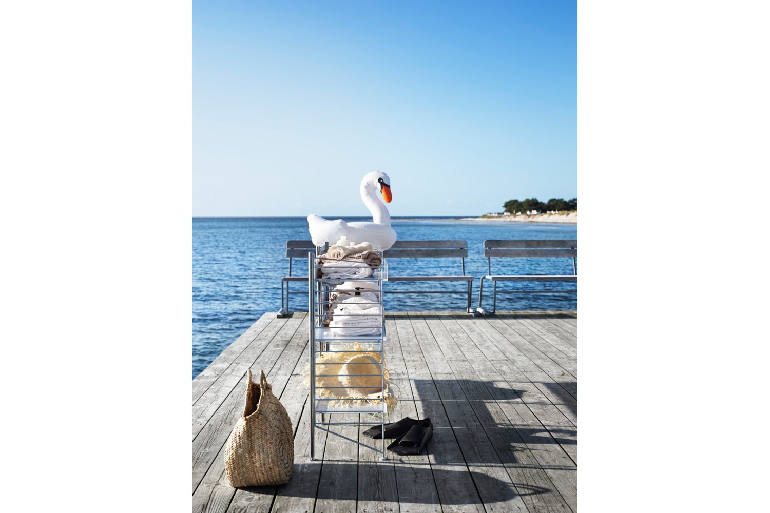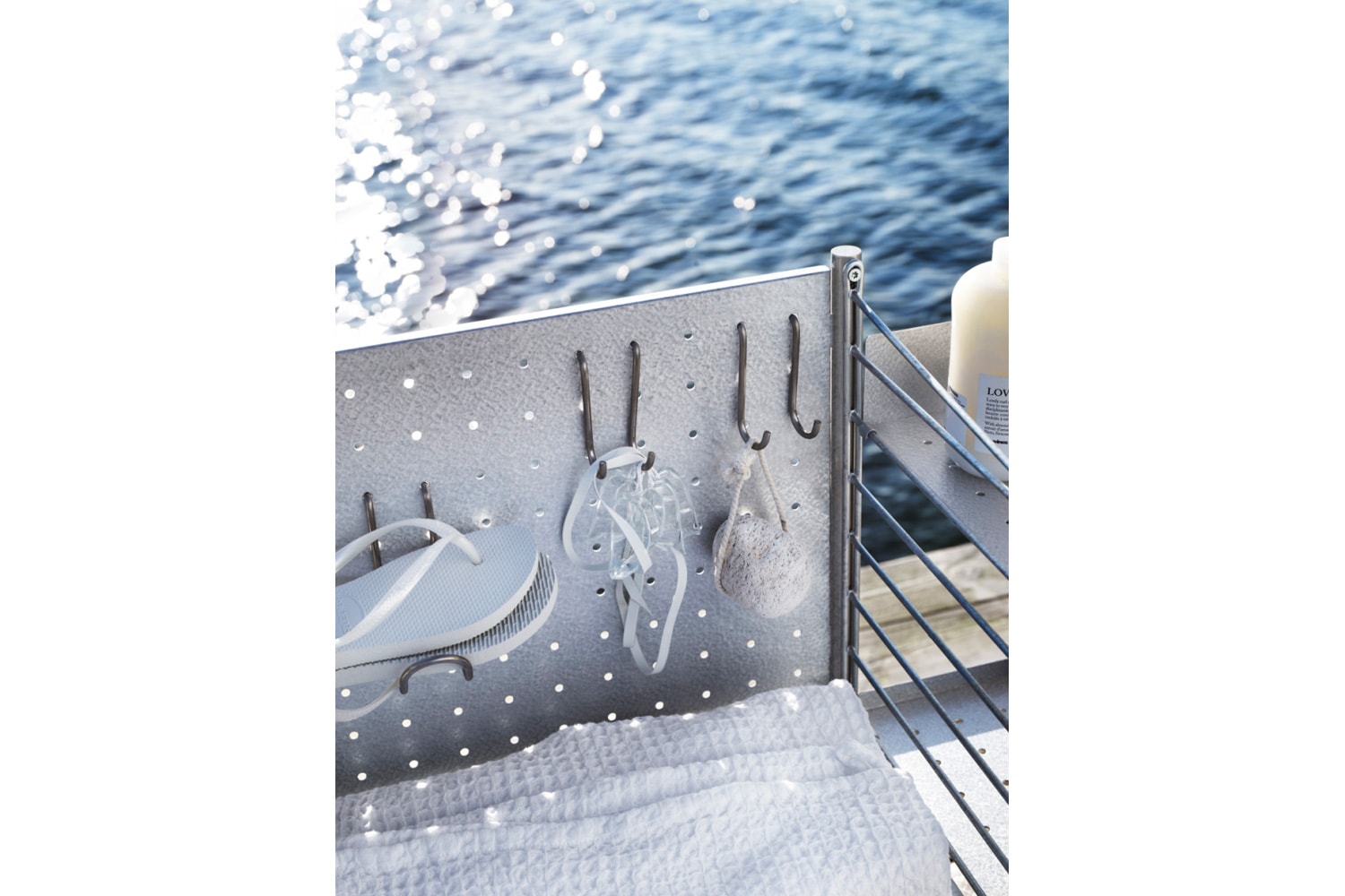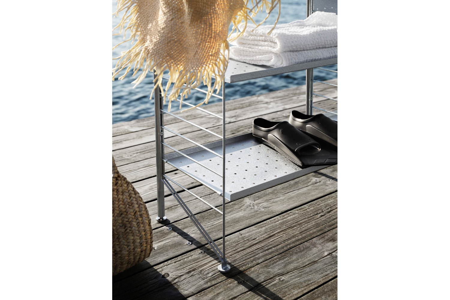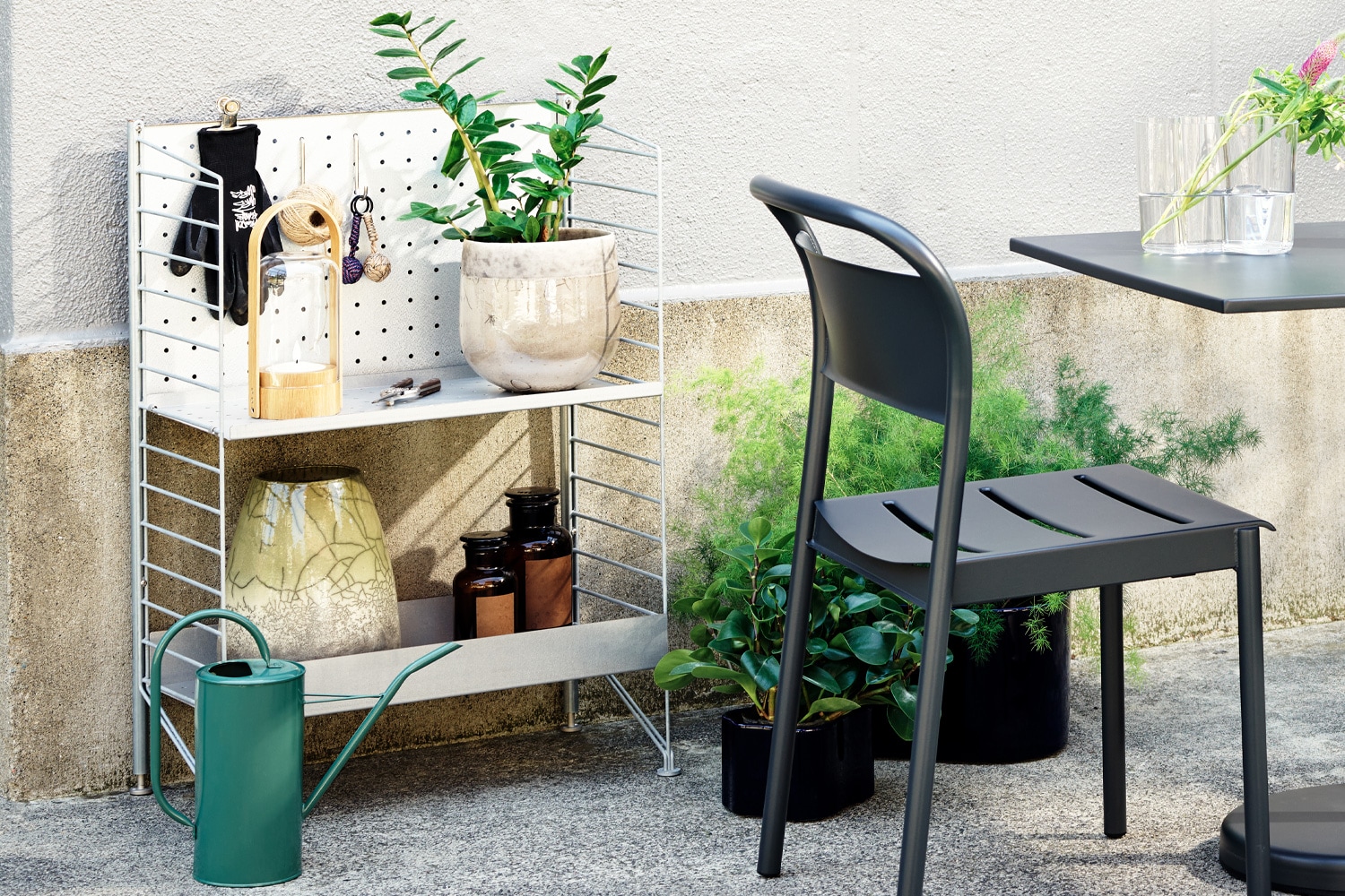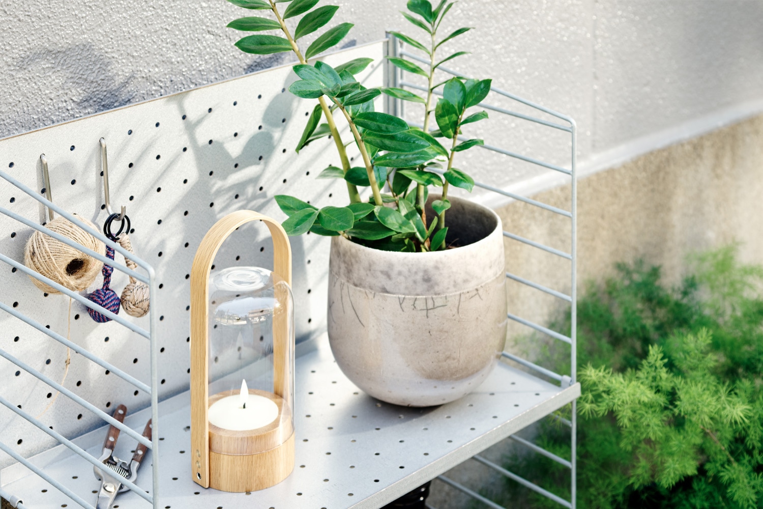 アウトドア Iは、バルコニーなどの狭い屋外空間にも最適なコンパクトなサイズ感が特徴的。 ハイエッジとローエッジのガルバナイズドメタルシェルフを組み合わせているので、大小様々なモノを飾ることができます。