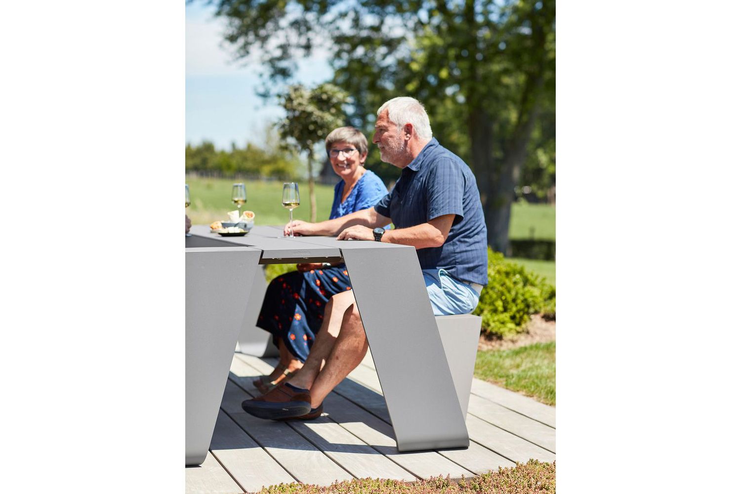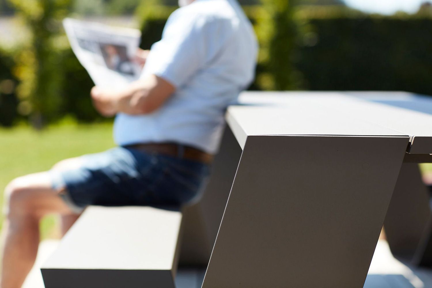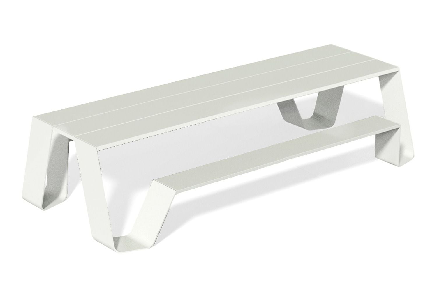 またぐ必要がなく、ロングスカートの女性でもスムーズにベンチに座ることができます。 アルミの天板は汚れがついても水拭きだけできれいになります。