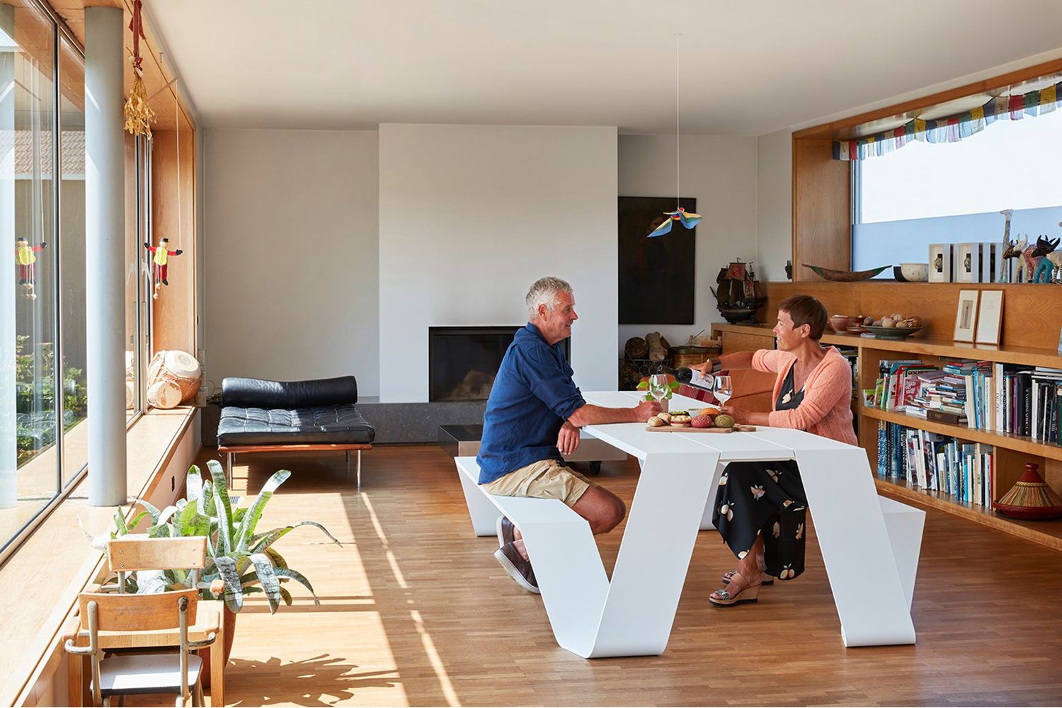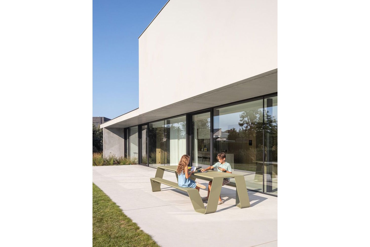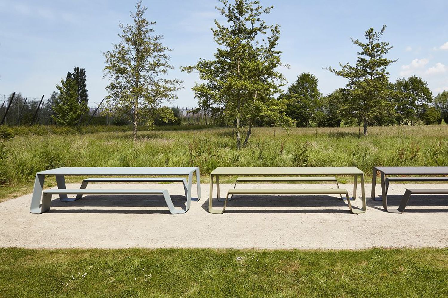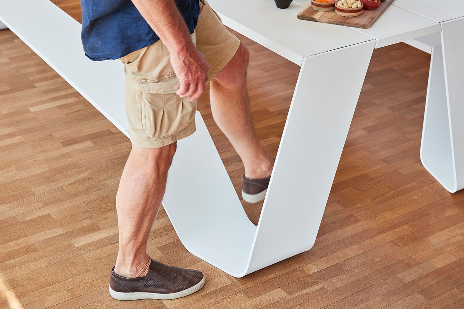 またぐ必要がなく、ロングスカートの女性でもスムーズにベンチに座ることができます。 アルミの天板は汚れがついても水拭きだけできれいになります。