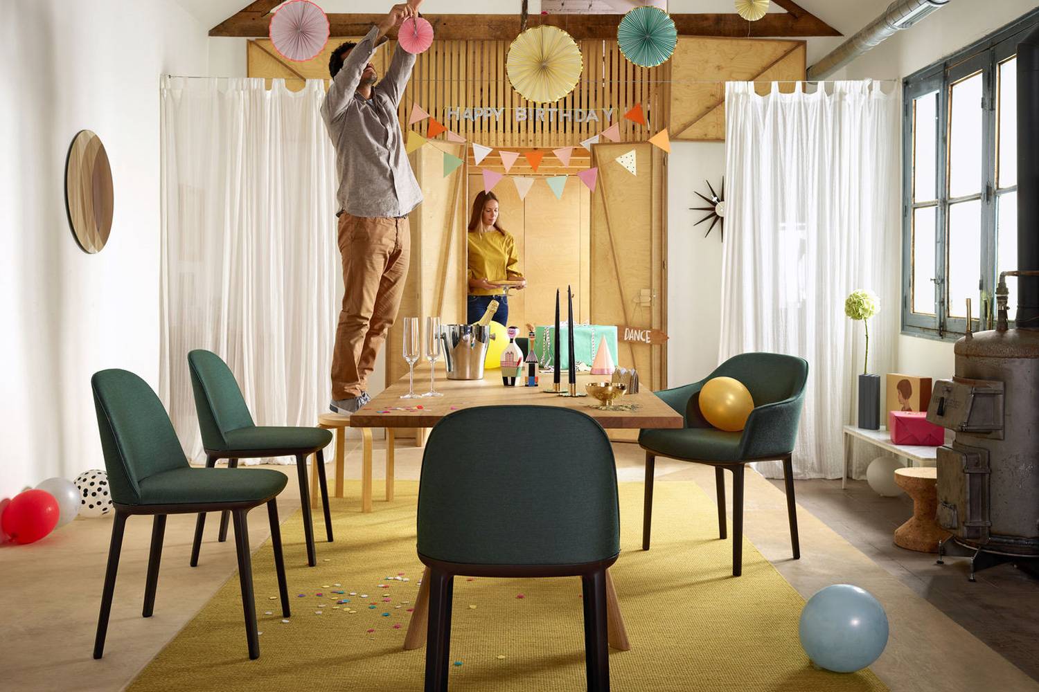 背もたれから座面、肘掛けまでが一体になった滑らかな輪郭と柔らかい張り地によって、穏やかで心地良く落ち着いた雰囲気をまとっています。 シンプルなプラスチック製の脚は、椅子全体をすっきりとエレガントな印象にまとめています。