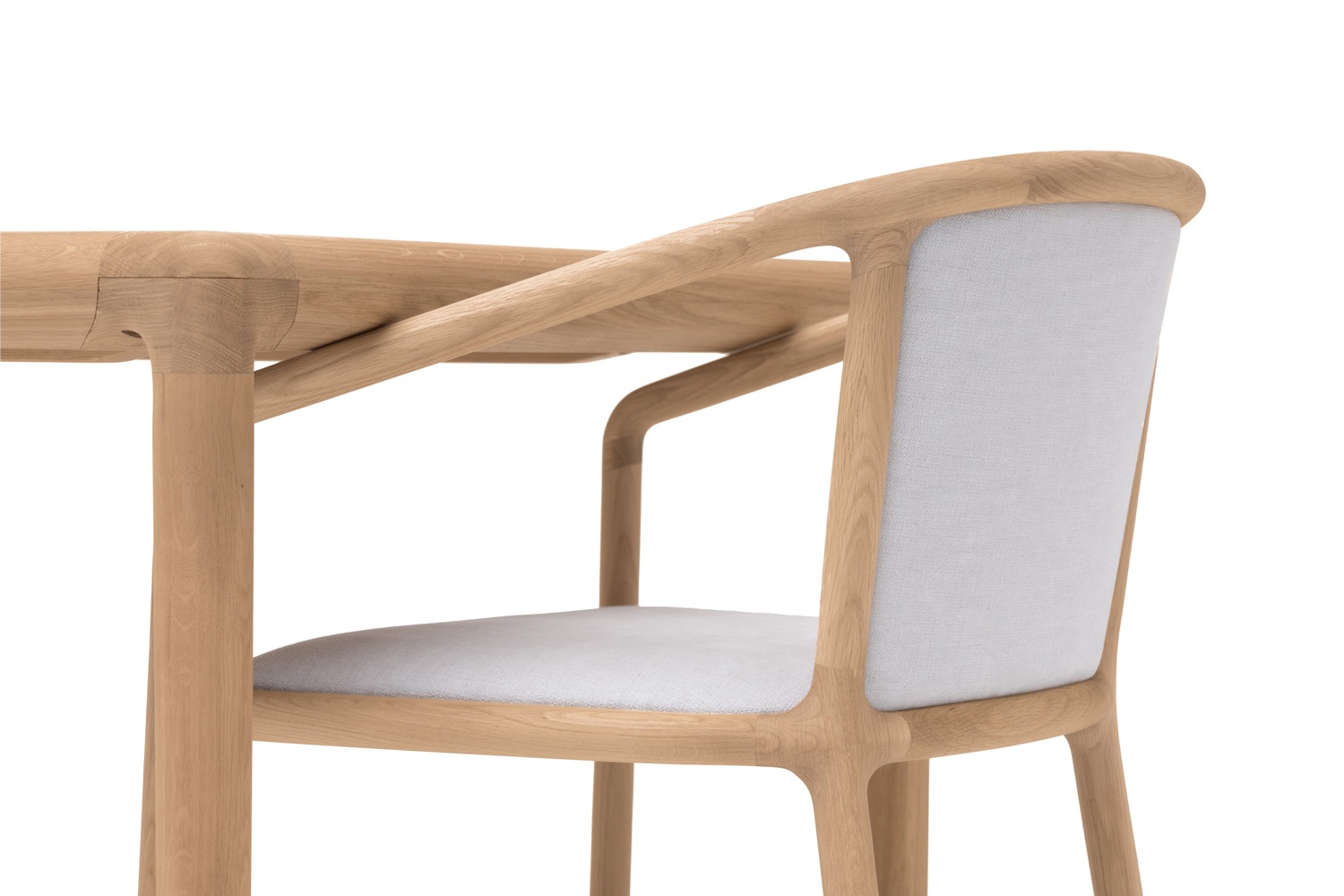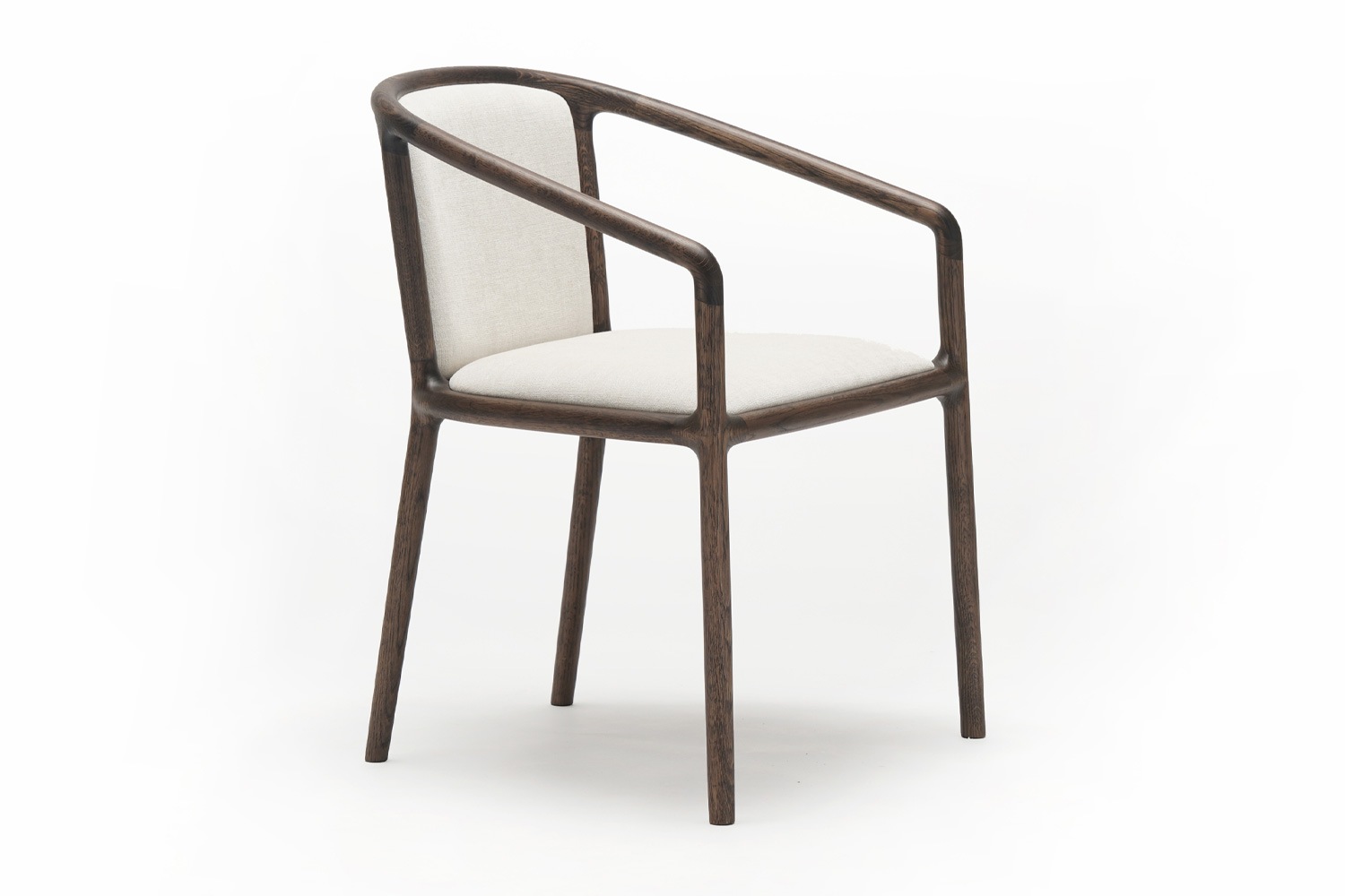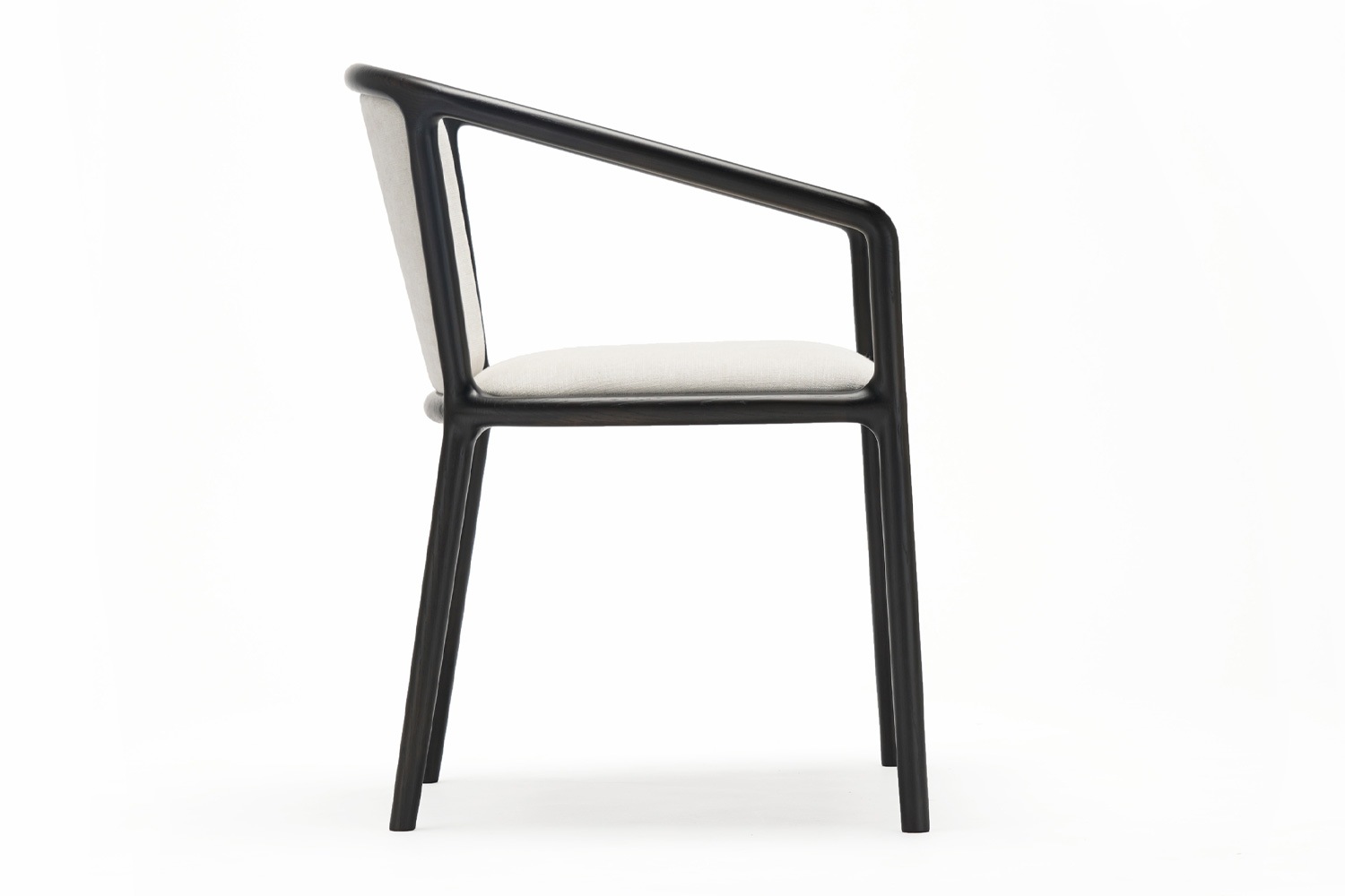 日本を拠点に設立されたライフスタイルブランド KARIMOKU CASE(カリモクケース)の NF-DC01(NF-DC01 ダイニングチェア)は、形状とエルゴノミクス、そしてその間にある絶妙なバランスを追求し続けることによりデザインされたダイニングチェアです。特徴的なフレームと有機的な切り替えが、洗練された、奥行きある複雑な表情をもたらします。スロープ状のアームレストは、NF-DT01ダイニングテーブル の裏面と同じ角度の傾斜を描いており、テーブルの下に美しく収まります。