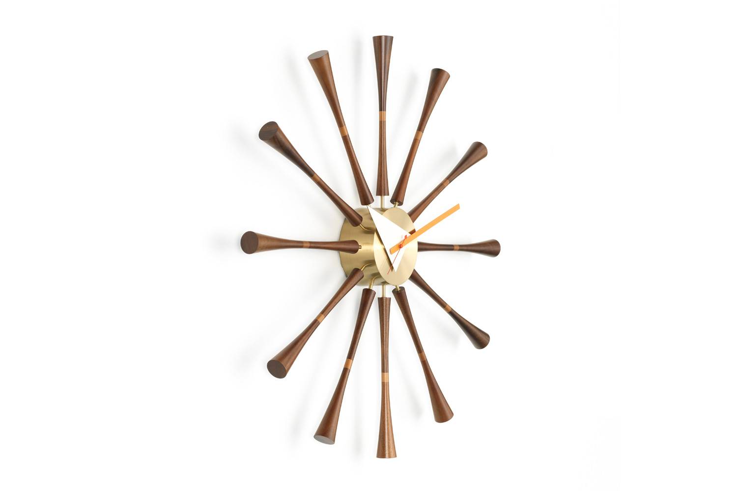 ミッドセンチュリーモダンを代表するアメリカ人デザイナー、ジョージ・ネルソン。彼がデザインした時計シリーズ「ネルソンクロック」は、文字盤や数字を排除したデザインが特徴です。ネルソンは人々が時計をどう見るか分析し、針の位置で時間を読み取ることができると考察しデザインしました。スピンドルクロックは12本の曲線的な支柱で時計盤を表現したウォールクロック。円柱の中心から先端に向かってカーブを描く独特な形状は、糸を紡ぐ際に使用する棒状の道具「Spindle(スピンドル)」を基にしており、それゆえ「Spool(スプール)=糸巻き」という愛称も付けられていました。