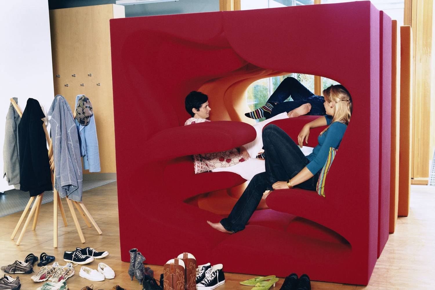 このタワーは、全体に柔らかなクッションと布張りが施されており、4つの空間に座ったり、寝転んだりと、コミュニケーションやリラックスの場として最適です。