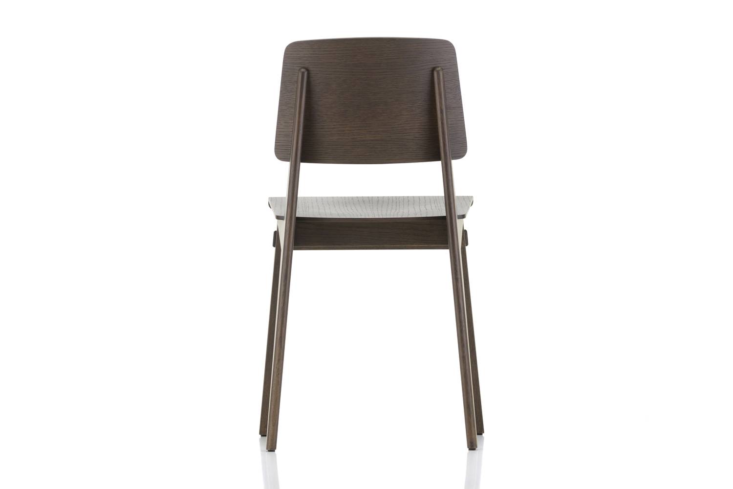 ジャン・プルーヴェの建築とも共通する彼の家具デザインの特徴はこの椅子にも反映されています。人が椅子に座った時、椅子の脚にかかる重さは一定ではなく、後部フレームと座面が結合する点に最大の負荷重量がかかるため、後脚を兼ねた頑丈なフレームで補強し、全体への荷重を支えるという極めて合理的な考えに基づいています。 ジャン・プルーヴェは構造的な強度、接合部、脚の位置や座面と背もたれの角度などのテストを重ね、戦時中にいくつかのプロトタイプを作りましたが、材料については入手可能な木材の中から選ばざるを得ませんでした。