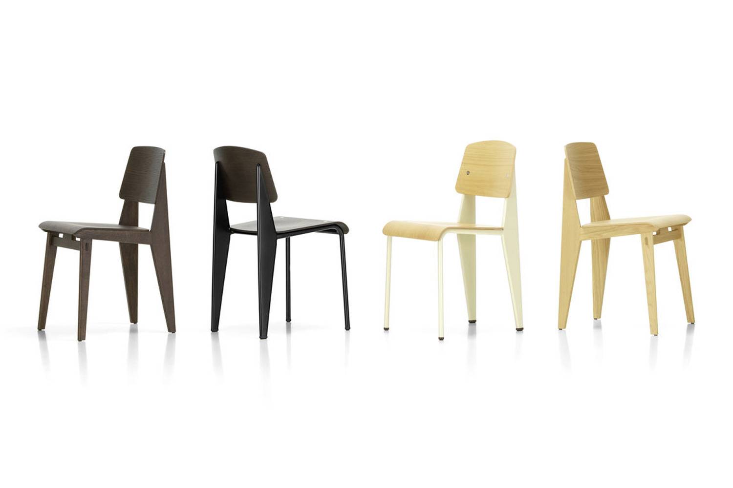 1947年、プルーヴェは「Meubles de France」というコンペティションにシェーズトゥボワを出品し、大賞を受賞しました。テーマは、戦後社会の需要に合わせ、住まいに困る人たちや若くして家をもつ夫婦のための魅力的で高品質、大量生産可能な家具、というものでした。その後、一部金属のパーツを用いた組立式や、今日「スタンダードチェア」として知られる金属のフレームに木製の背座を組み合わせたモデル「Metropole No.305」が作られました 。