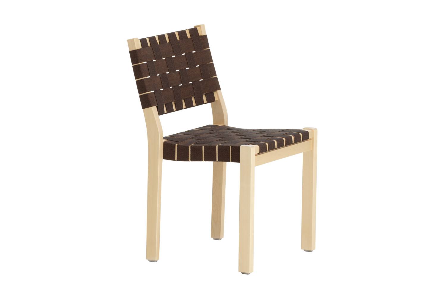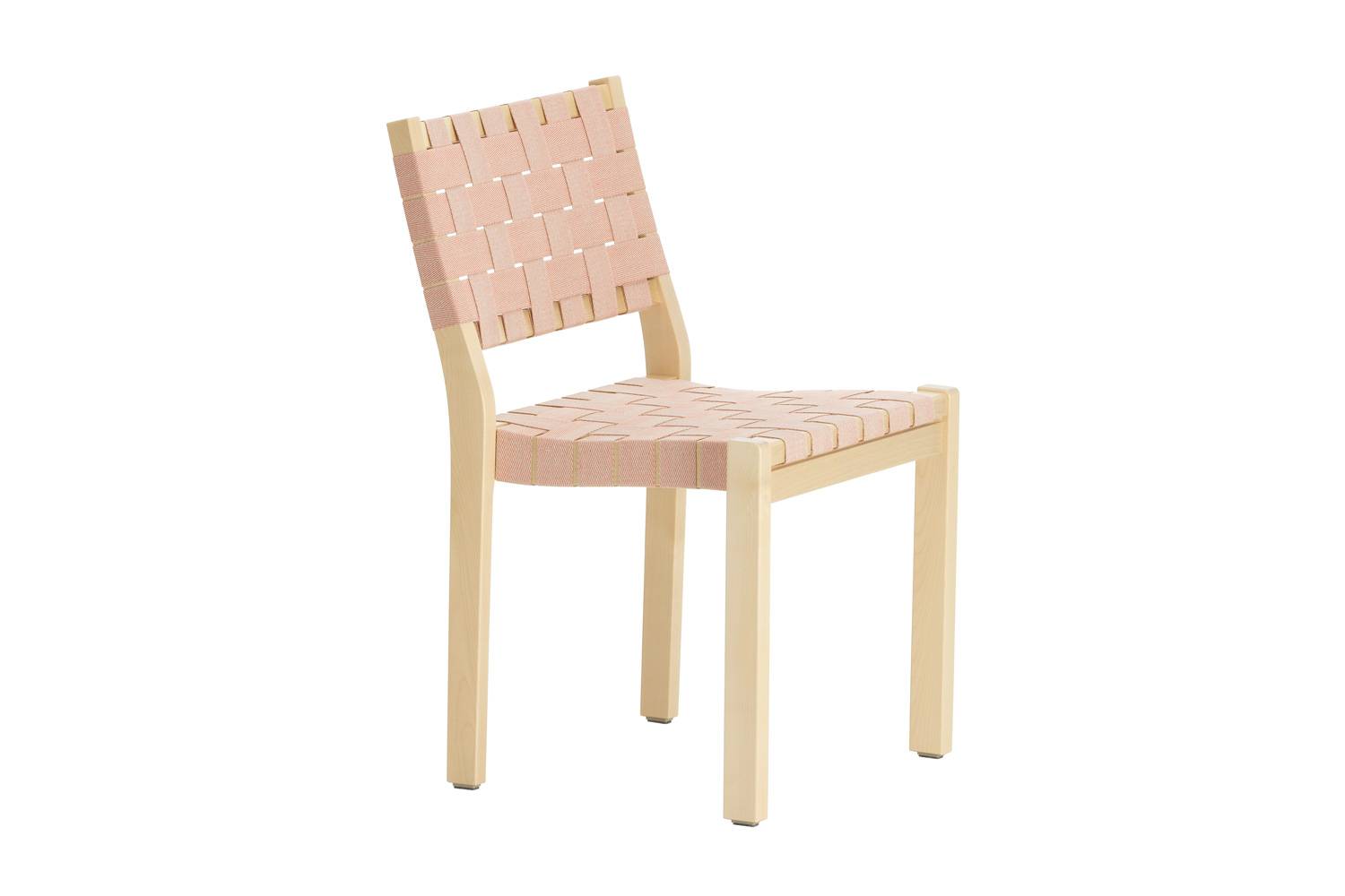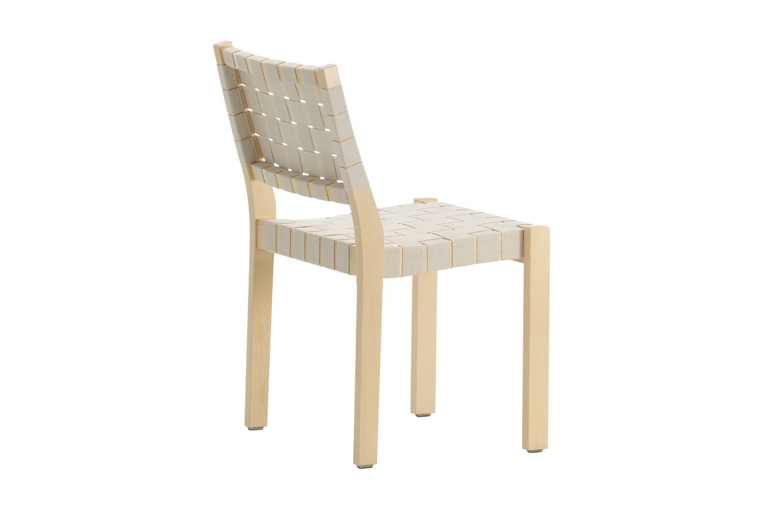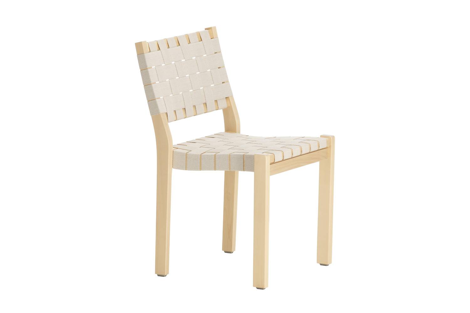 アルヴァ・アアルトによる611 チェアは、丈夫なバーチ材のフレームとリネンのウェビングテープによって形づくられています。 快適さと実用性を考えてデザインされたウェビングテープによる座面と背もたれが、座った人の重みを優しく受け止め、とても心地良く座ることができます。