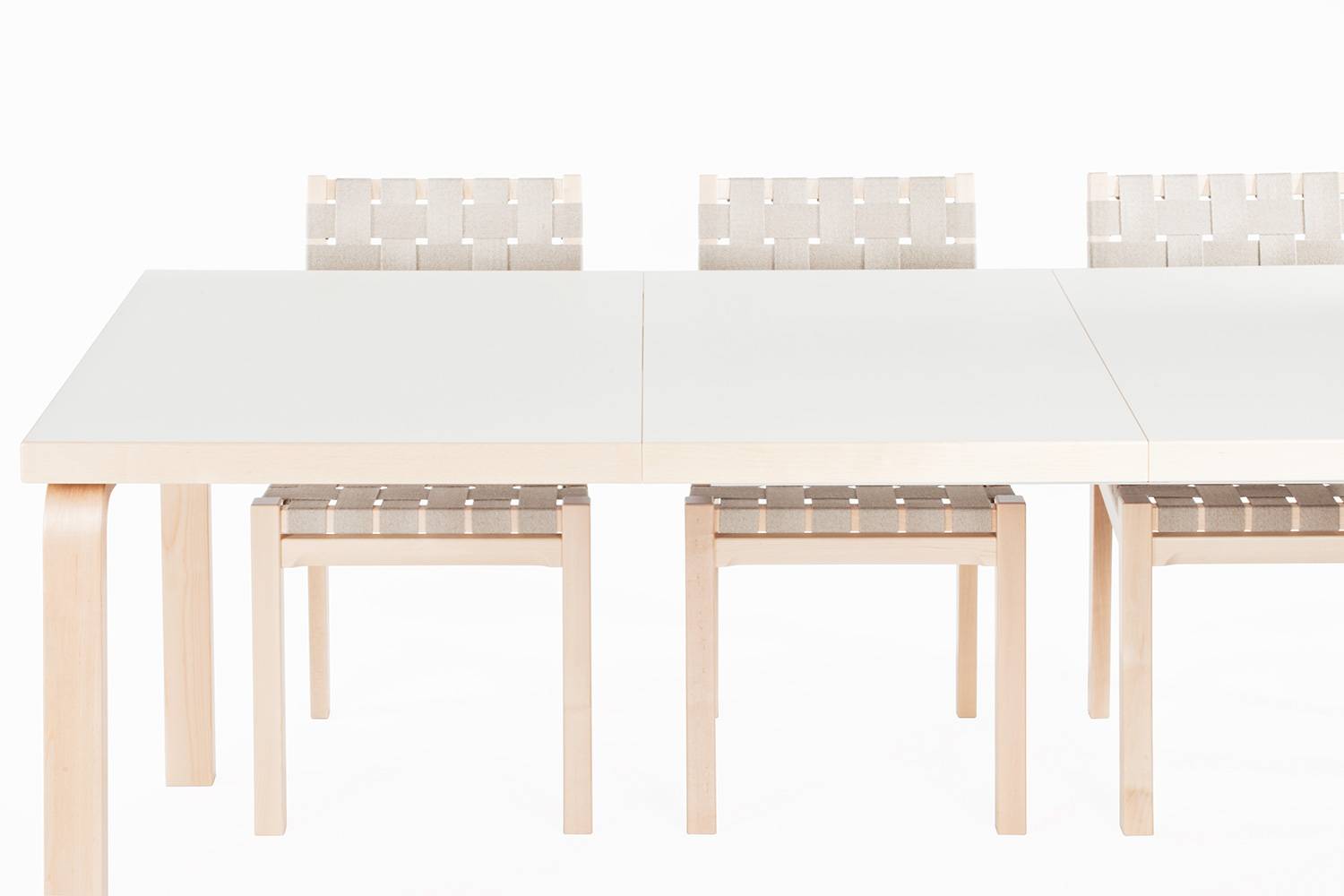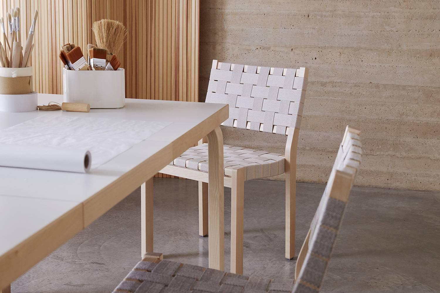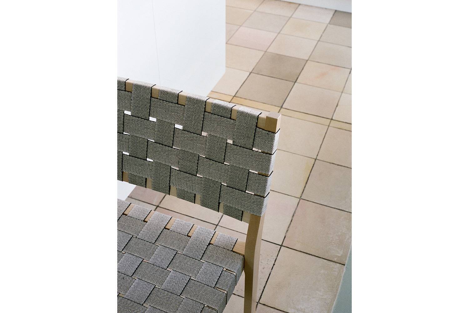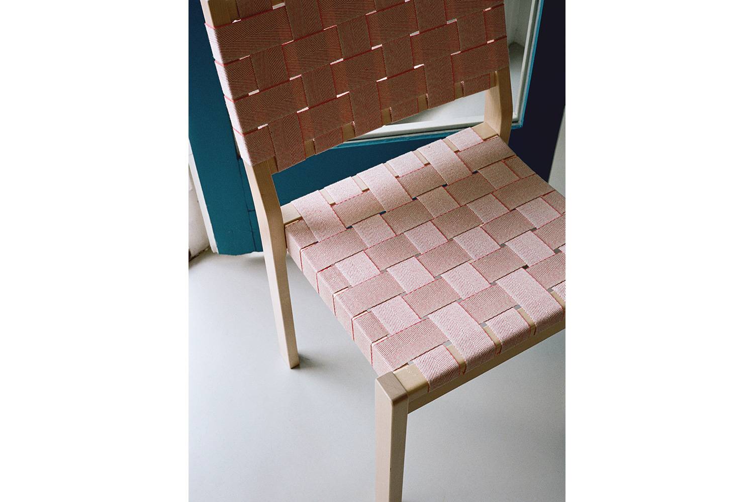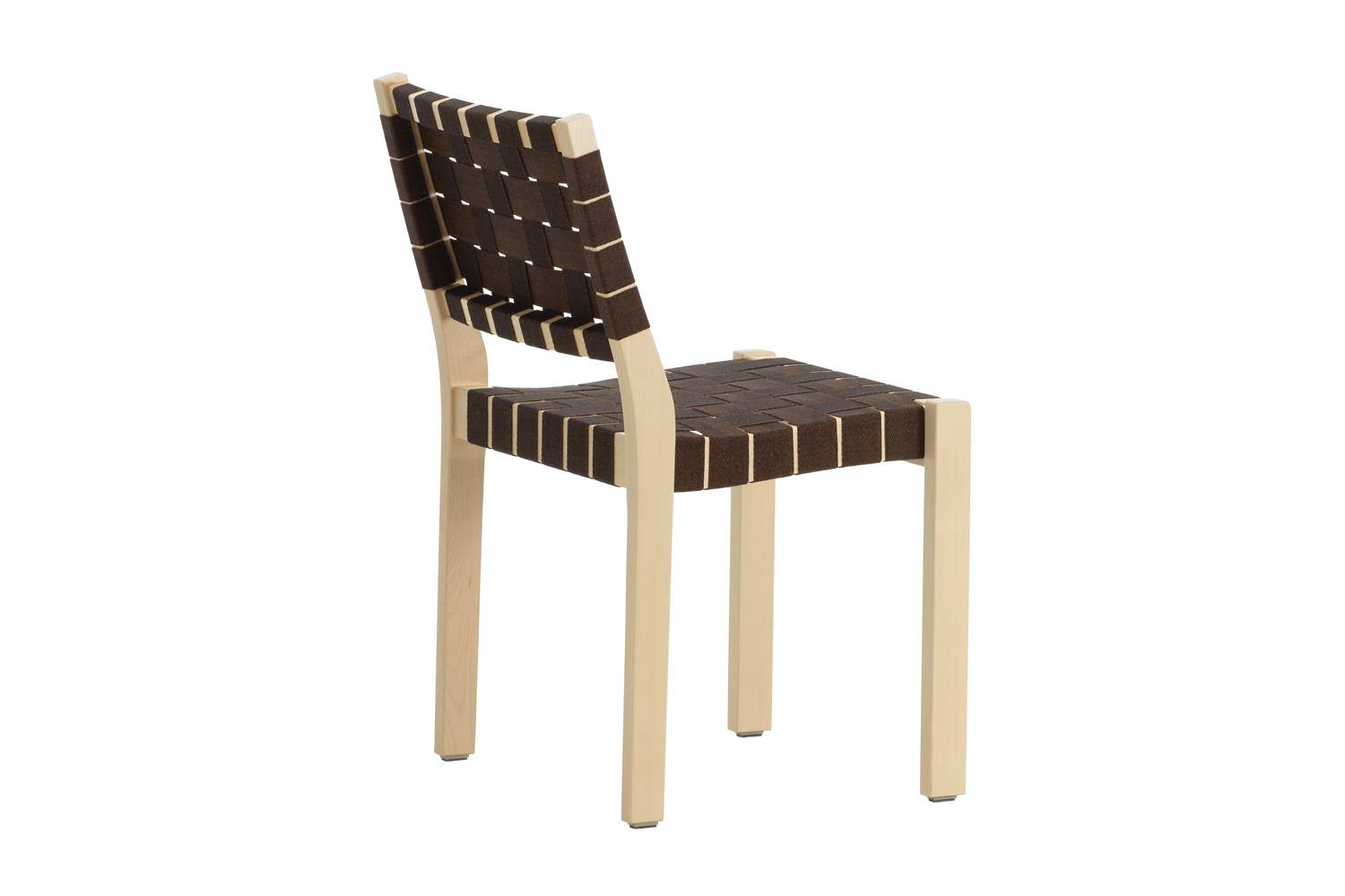 アルヴァ・アアルトによる611 チェアは、丈夫なバーチ材のフレームとリネンのウェビングテープによって形づくられています。 快適さと実用性を考えてデザインされたウェビングテープによる座面と背もたれが、座った人の重みを優しく受け止め、とても心地良く座ることができます。