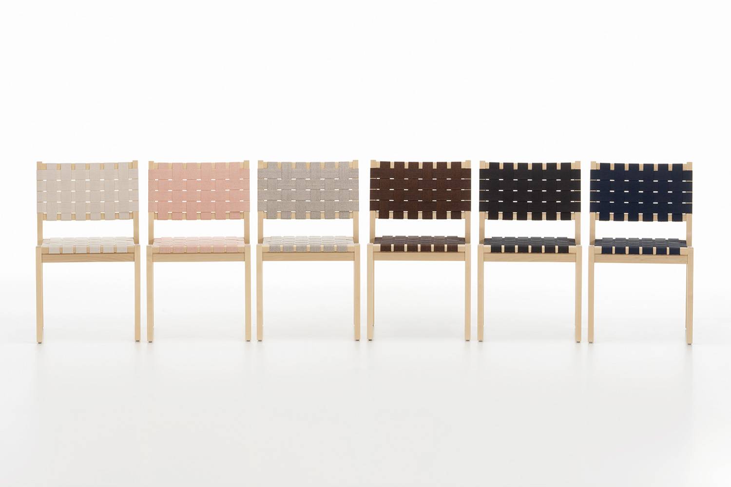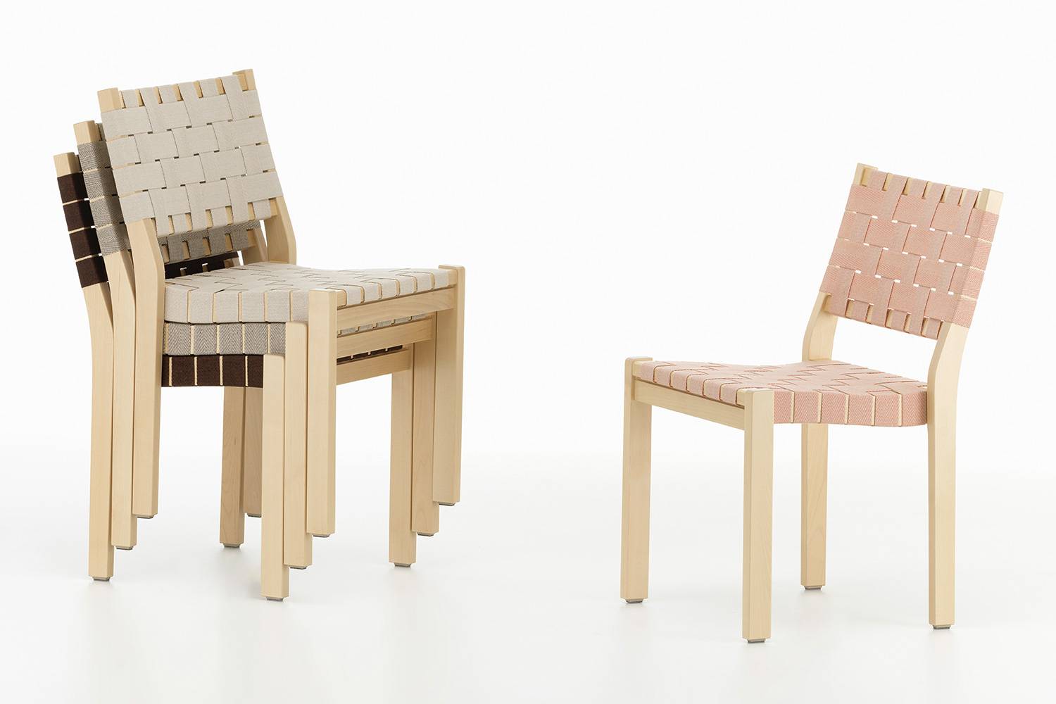 積み重ねて収納できる実用的な構造に加え、簡単にウェビングテープの交換が可能なため、何代にも渡り使い続けることができます。 アルヴァ・アアルトの初期の家具デザインのひとつである611 チェアは、アルテック創業から変わることなく生産され続けています。