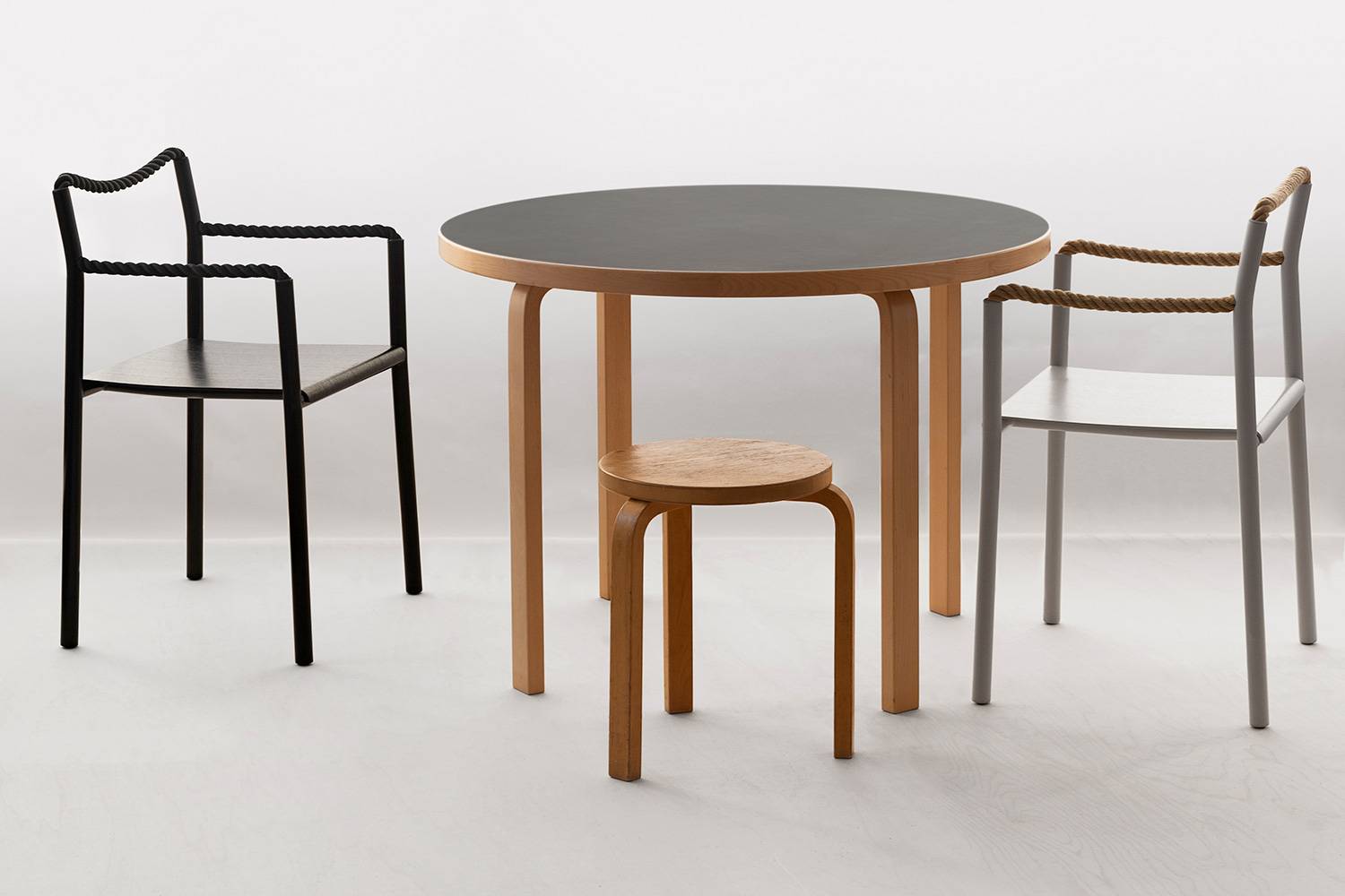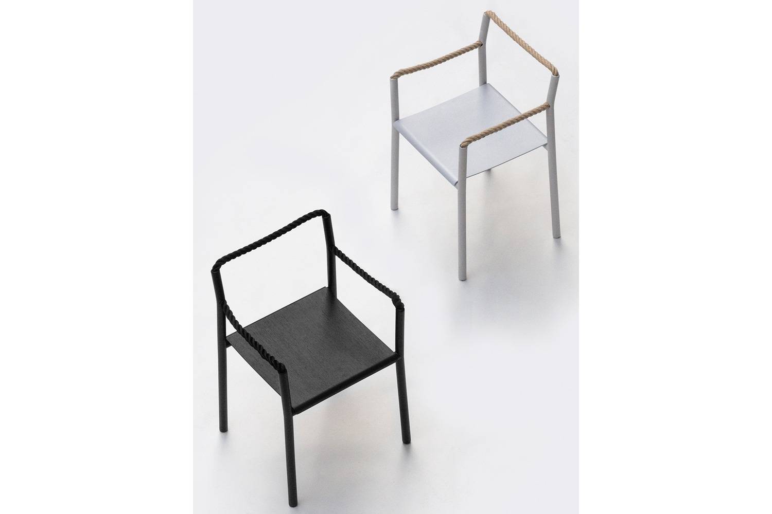 スチール製の本体とアッシュ材成形合板の座面で構成されるロープチェアは、ブラックとライトグレーの2色で展開します。 特徴的な背もたれと肘掛けのロープは、ブラックがポリエステル、ナチュラルはフラックス(亜麻)と、色に合う素材を選んでいます。