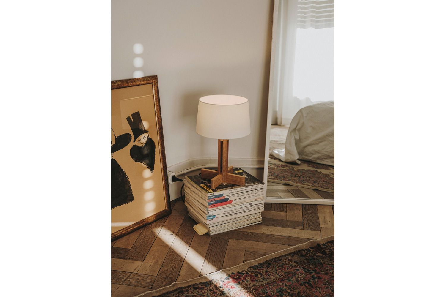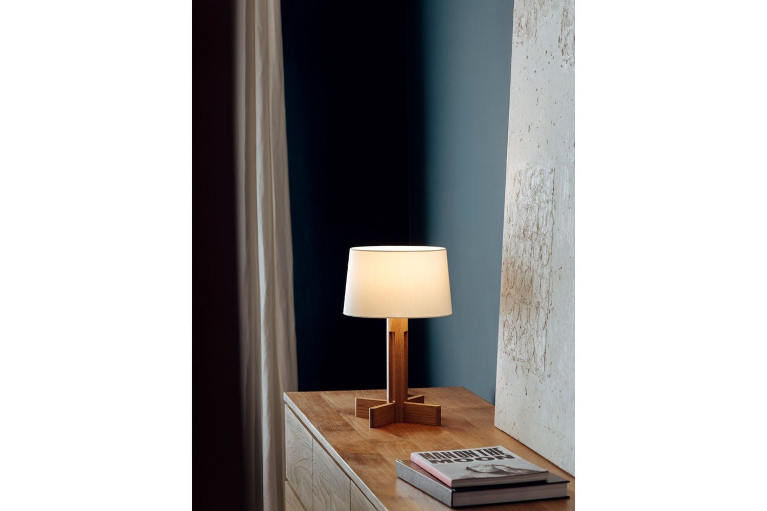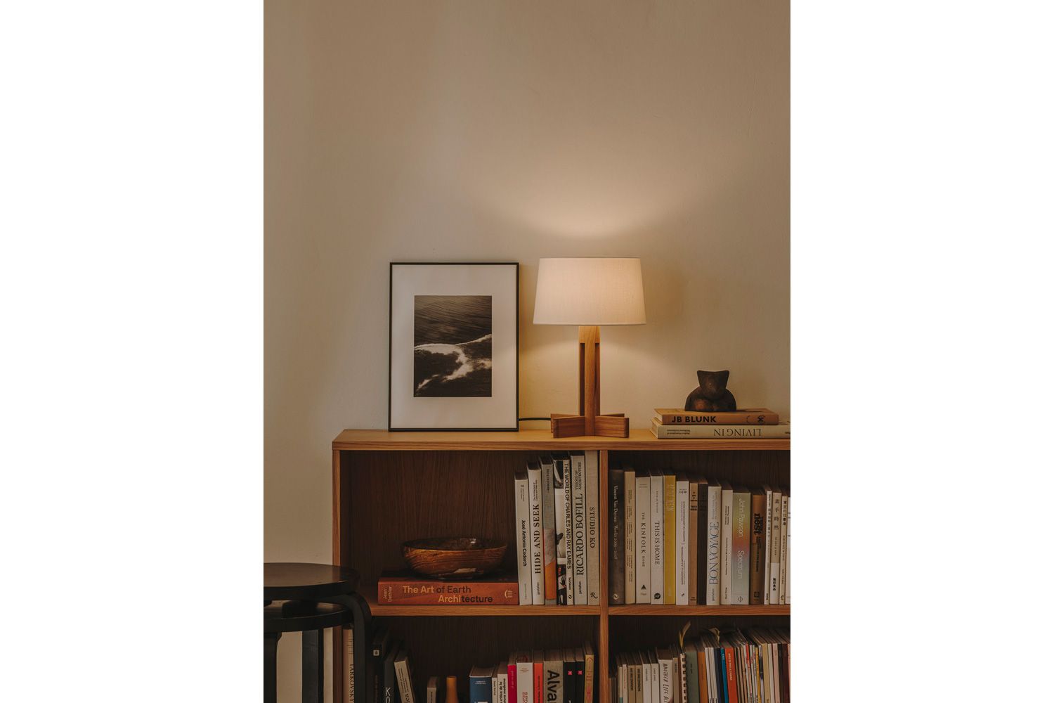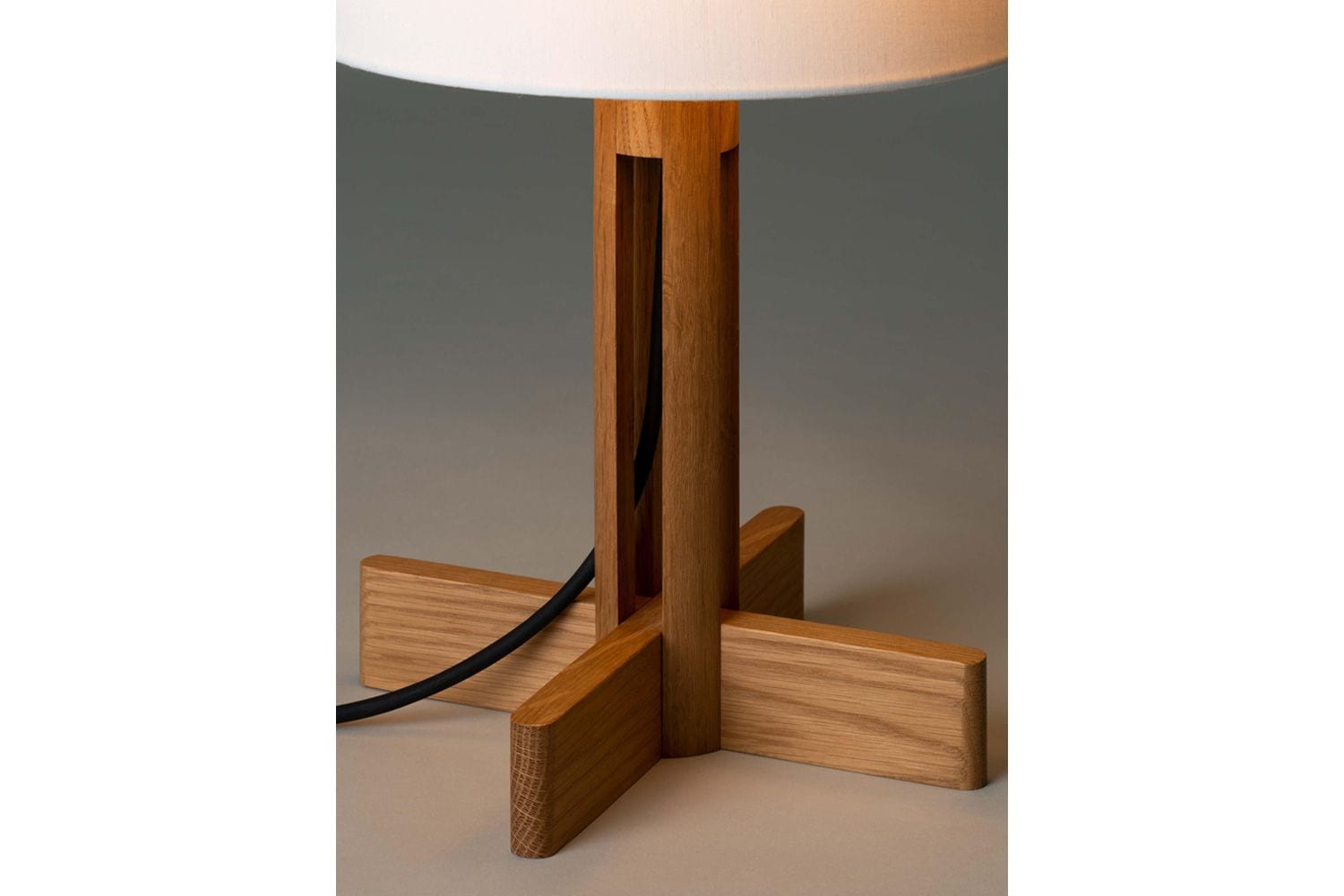 オリジナルのバージョンをより使いやすいサイズ、仕様に作り直した照明です。 ミゲル・ミラを象徴するクロスされたベース、空洞のオーク円柱スタンド、ホワイトパーチメント(紙)の組み合わせ。複雑な技巧があえて使われていないからこその究極のシンプルな美しさが感じられます。