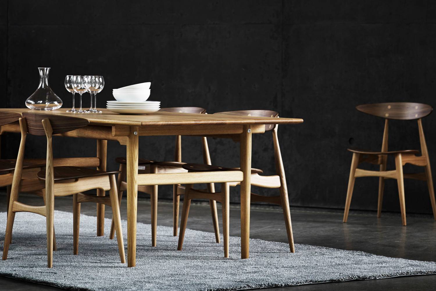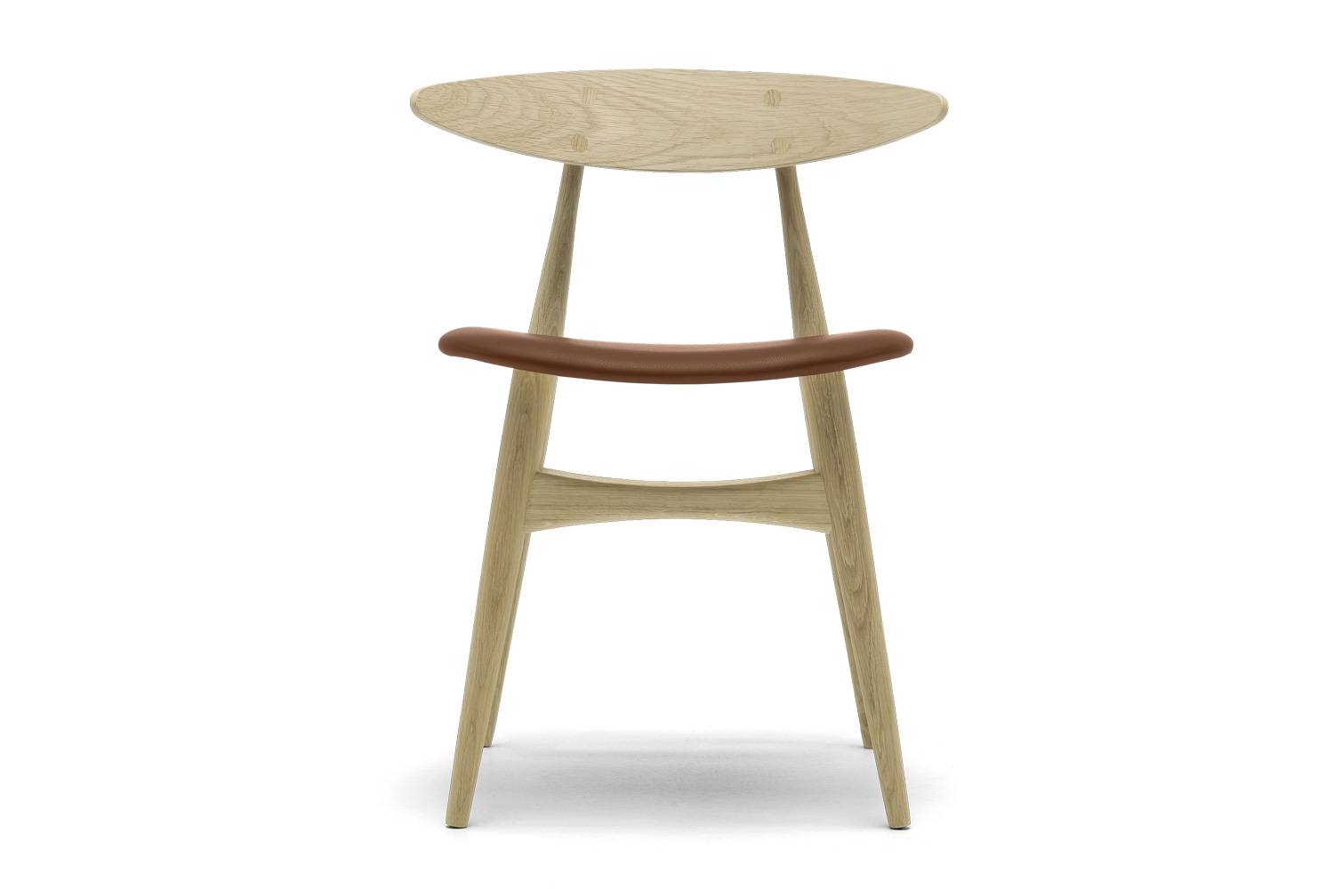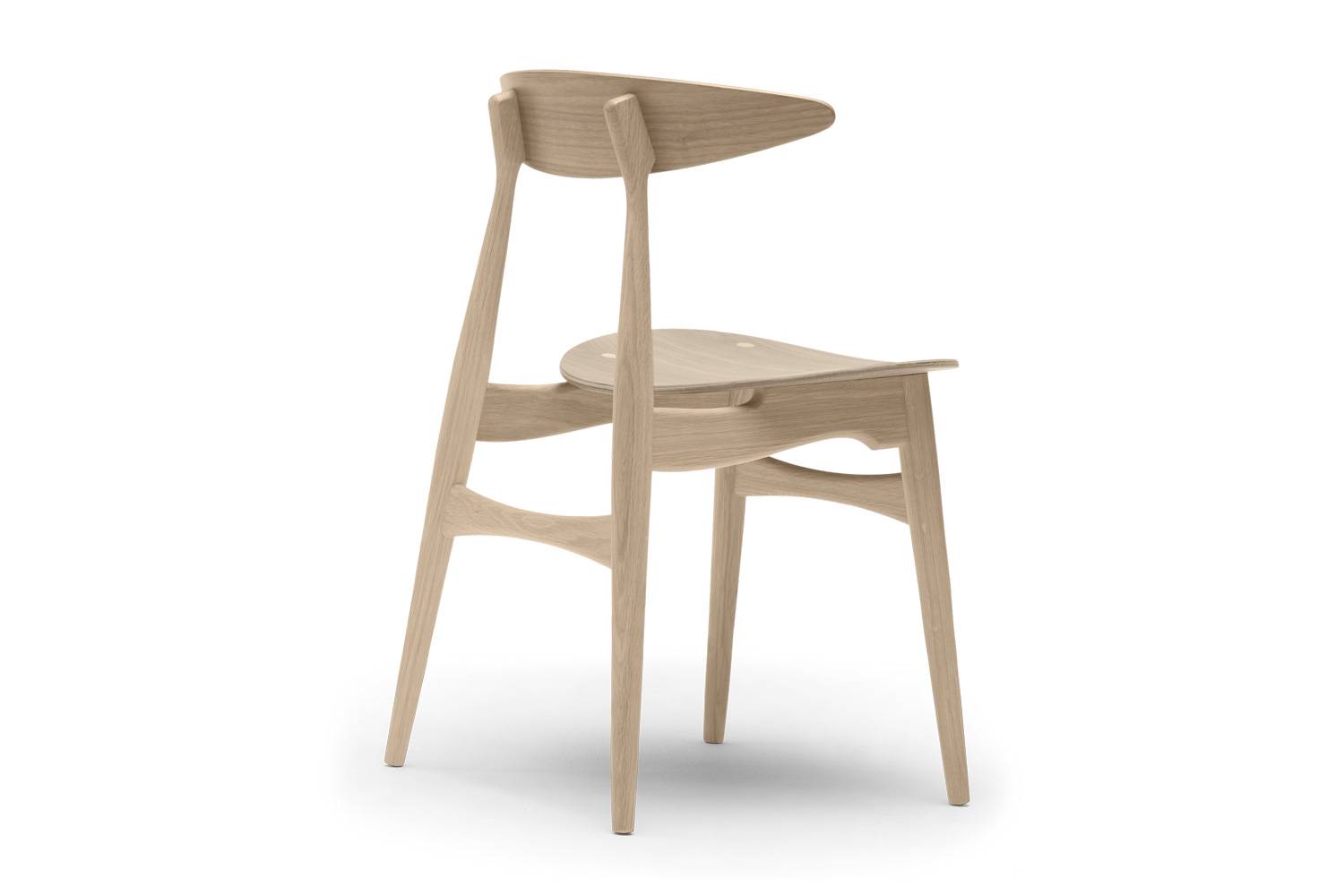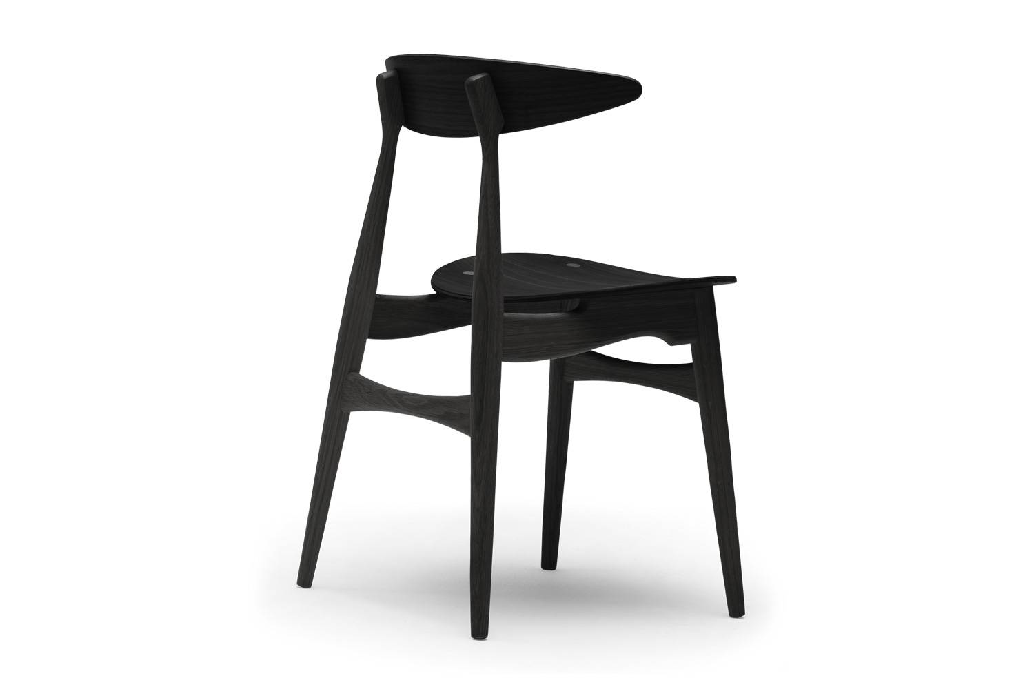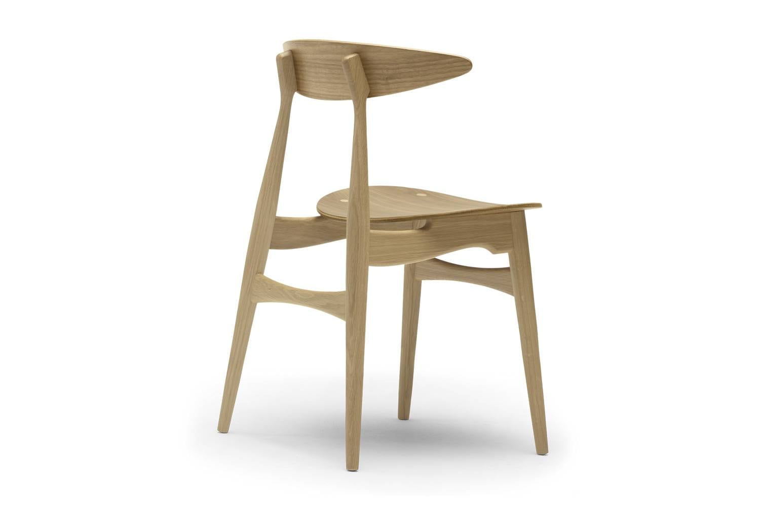 美しいオーク材、ウォルナット材を使用した木製のフレーム、そして50年代、60年代のデザインの典型ともいえるシルエット。 ウェグナーならではの意匠が随所に見られるデザインです。 各部分のエッジは丸く面取りすることで、柔らかいオーガニックな印象を強調。 テーパーのかかった脚は、椅子を軽快に見せるほか、クロス部分を太くすることで、椅子に荷重を支えるだけの十分な強度を与えています。 温かみに満ちたCH33T(板座)は、コンテンポラリーな空間に最適です。