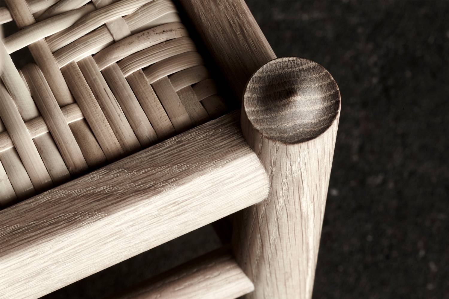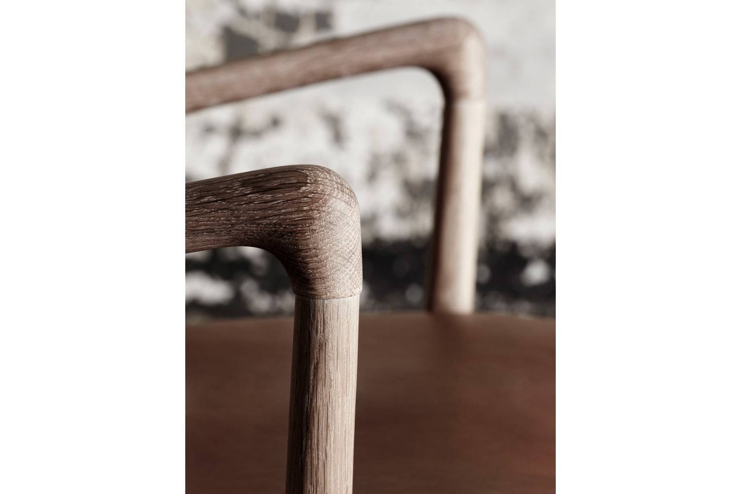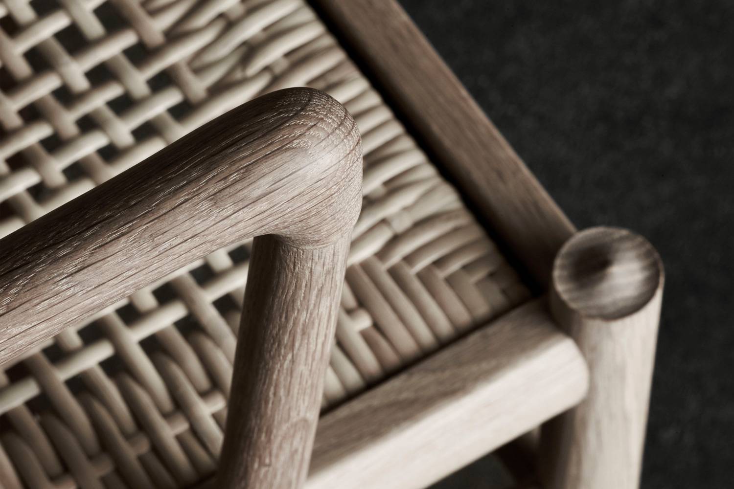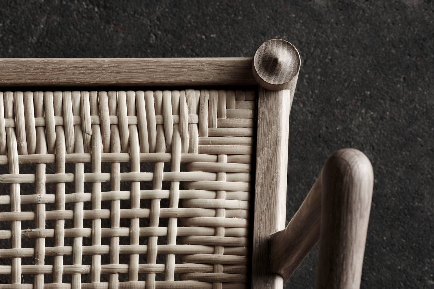 ミニマリスト、機能主義者と評価されるオーレ・ヴァンシャー、そのデザインには、洗練された細いラインが多く見られます。 コロニアルチェアもその一つ。細く優雅なフレームですが、考え抜かれた構造により、優れた強度を創りだしています。 洗練された曲線を描く特徴的なアーム。先端で真下にカーブさせる、ヴァンシャーらしい意匠となっています。 丸棒状の前脚と後ろ脚。後ろ脚を若干カーブさせることによって、椅子に安定性を与え、優雅な傾斜のあるシルエットを創り上げています。