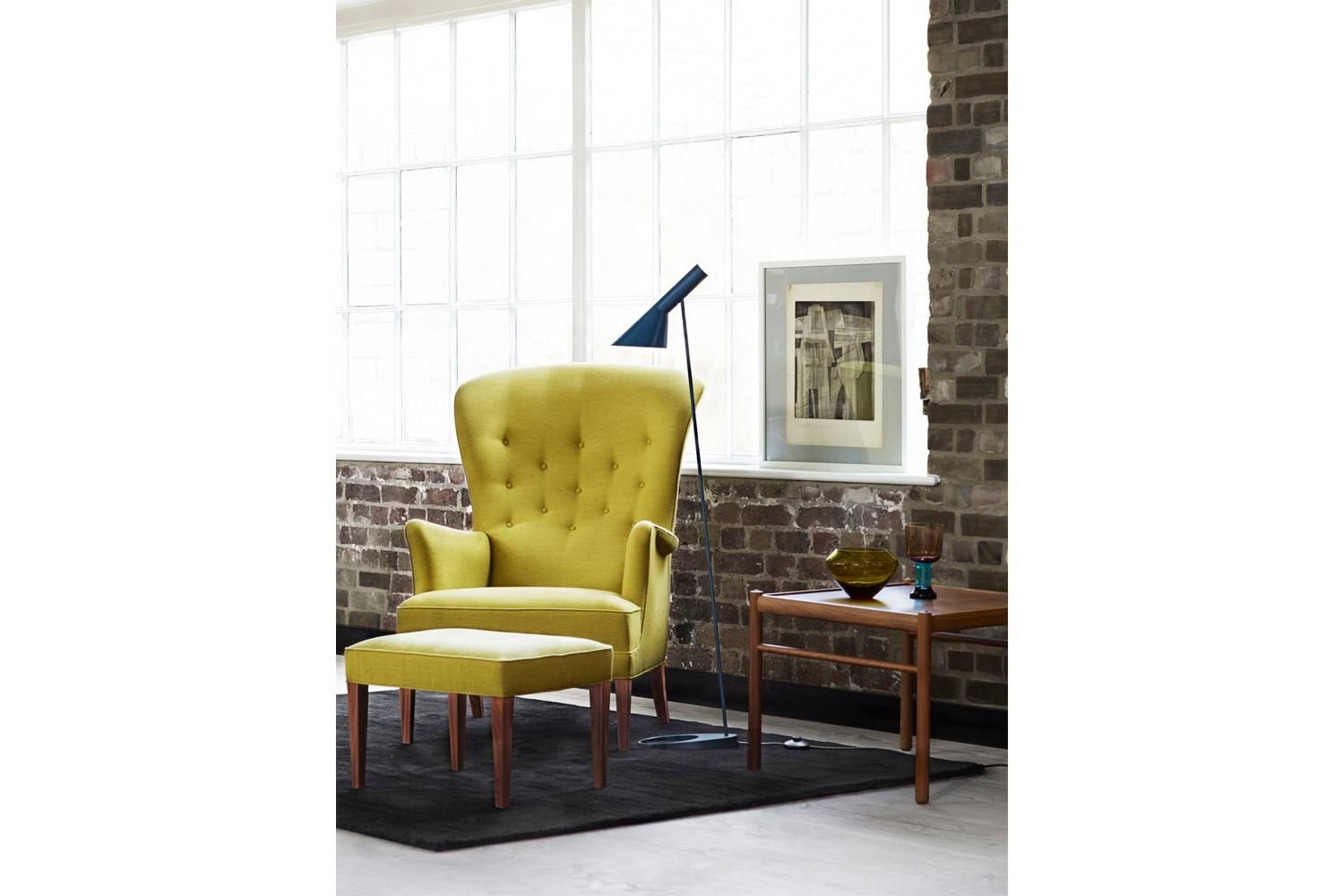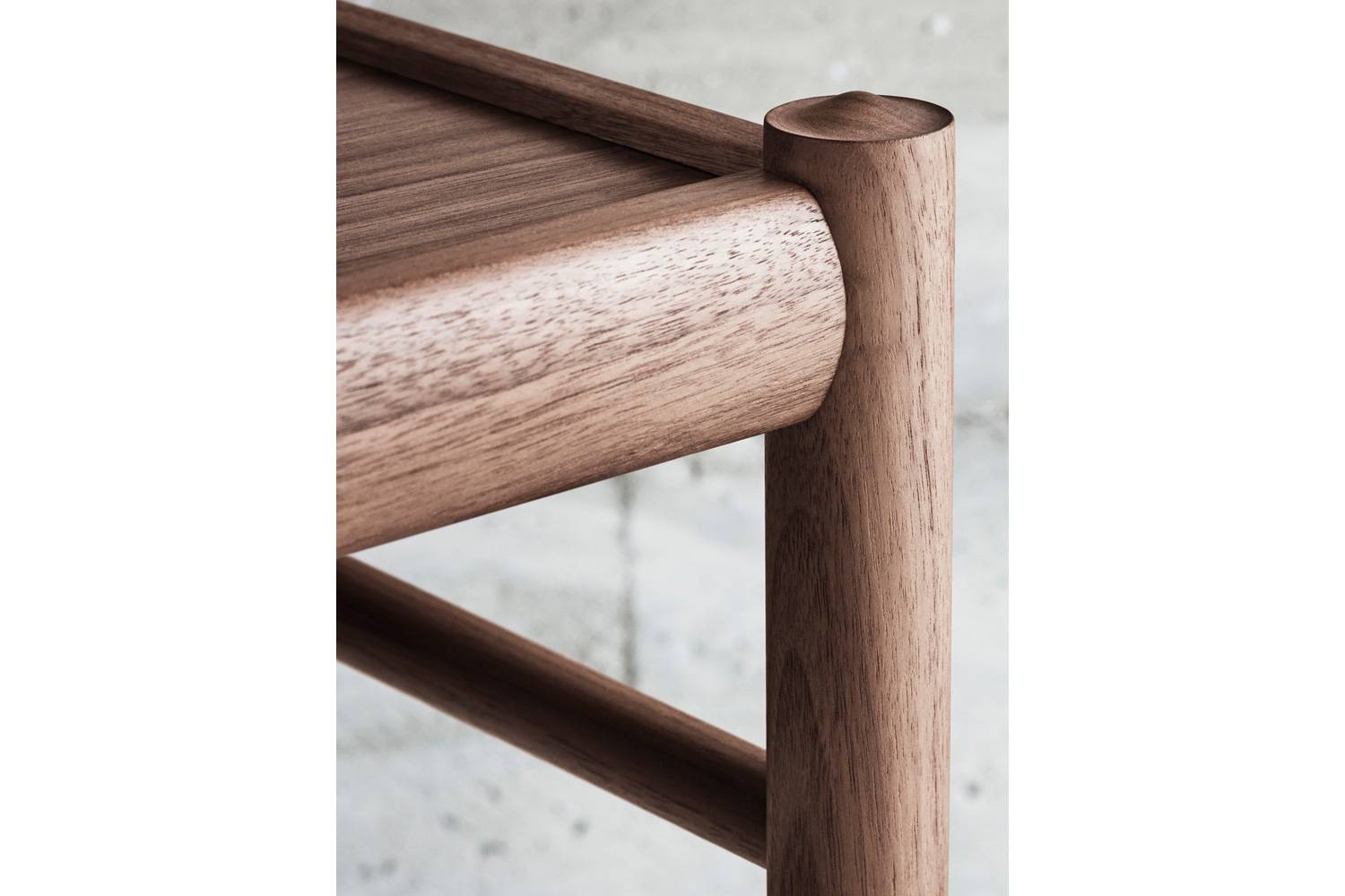 突板で製作された正方形の天板。コロニアルチェア、コロニアルソファを彷彿させるフレームが周りを囲んでいます。 コロニアルチェアの脚に通じるテーブルの角のディテール。直線的な美しさとさりげないモダンさを追求したフォルムとなっています。 コロニアル・コーヒーテーブルの素材は、ウォルナット材又はオーク材。オーク材のブラック塗装もご指定頂けます。