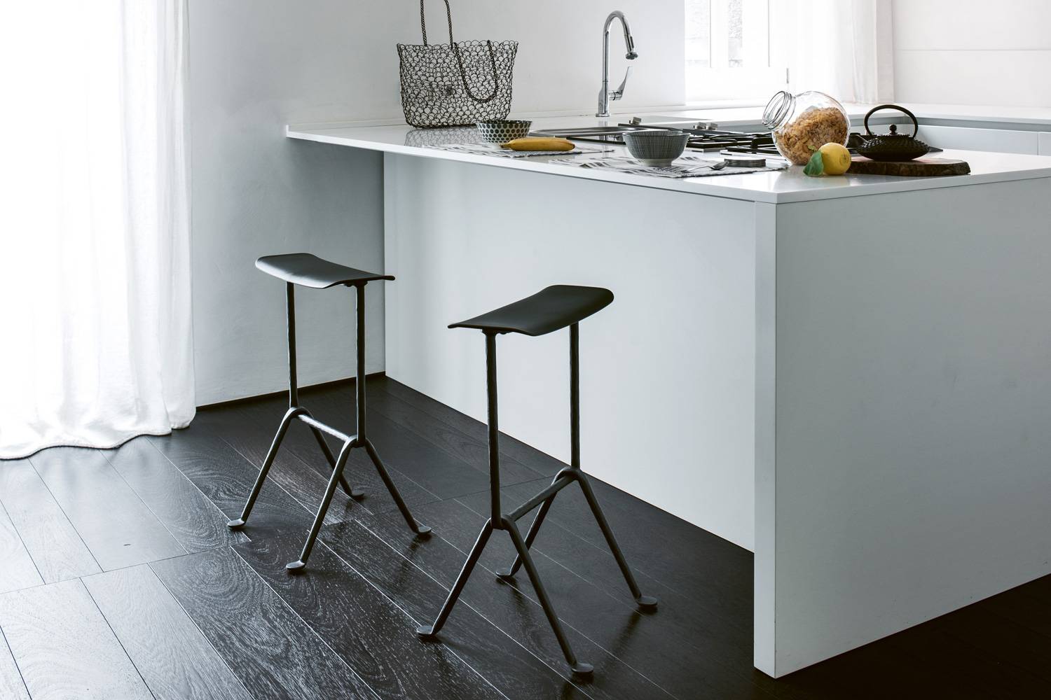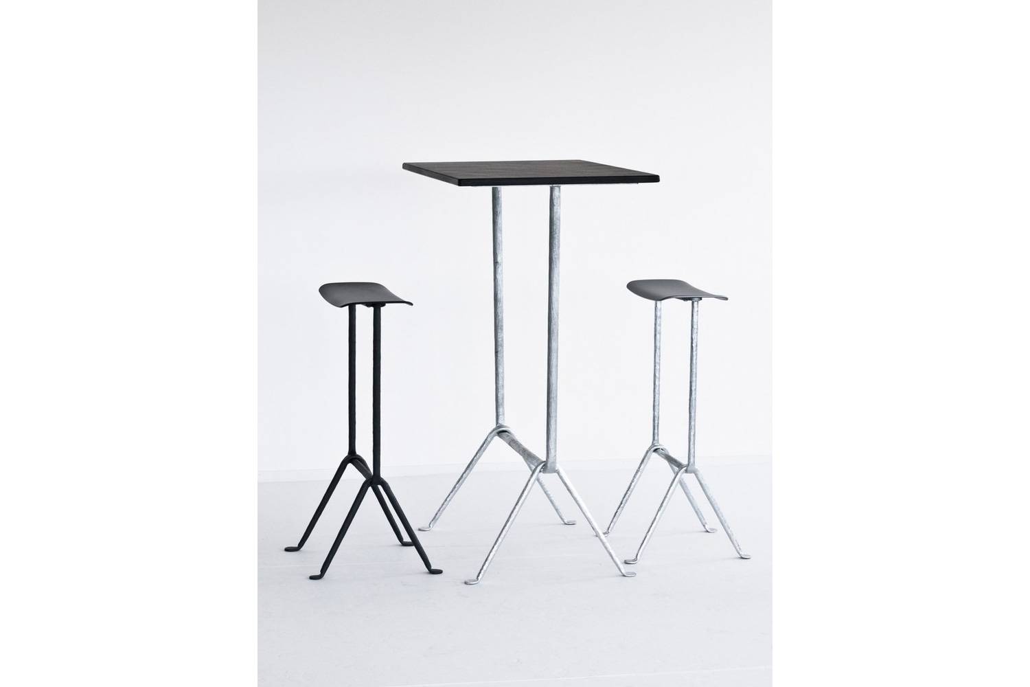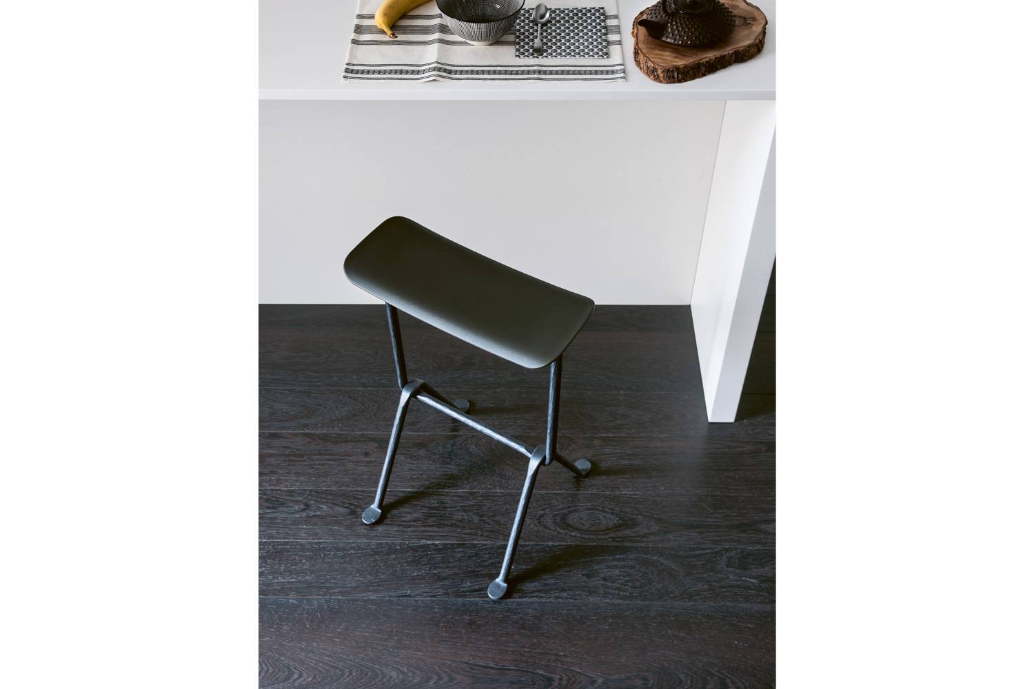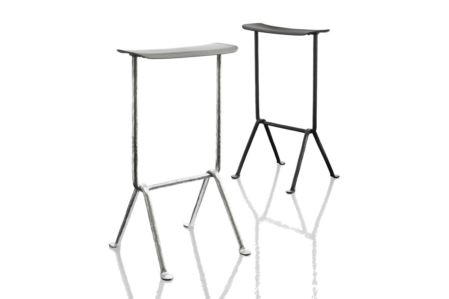 インダストリアルで質感豊かなフレームが、コンテンポラリーなスツールのシルエットに新鮮なコントラストを生み出しています。