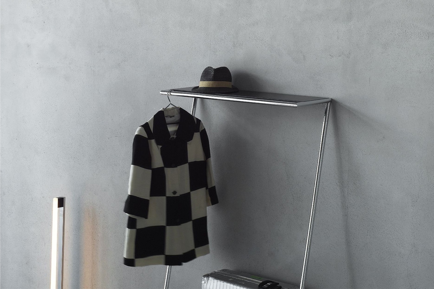 壁に立てかけることで、余計な構造体である側板をなくし、機能的でミニマルなデザインを生み出しています。天板には帽子やカバンなどを乗せることができるので、散らかりがちな衣類の一時置きなどに大変便利。壁面のスペースさえ空いていれば設置場所を問わないのもうれしいポイントです。
