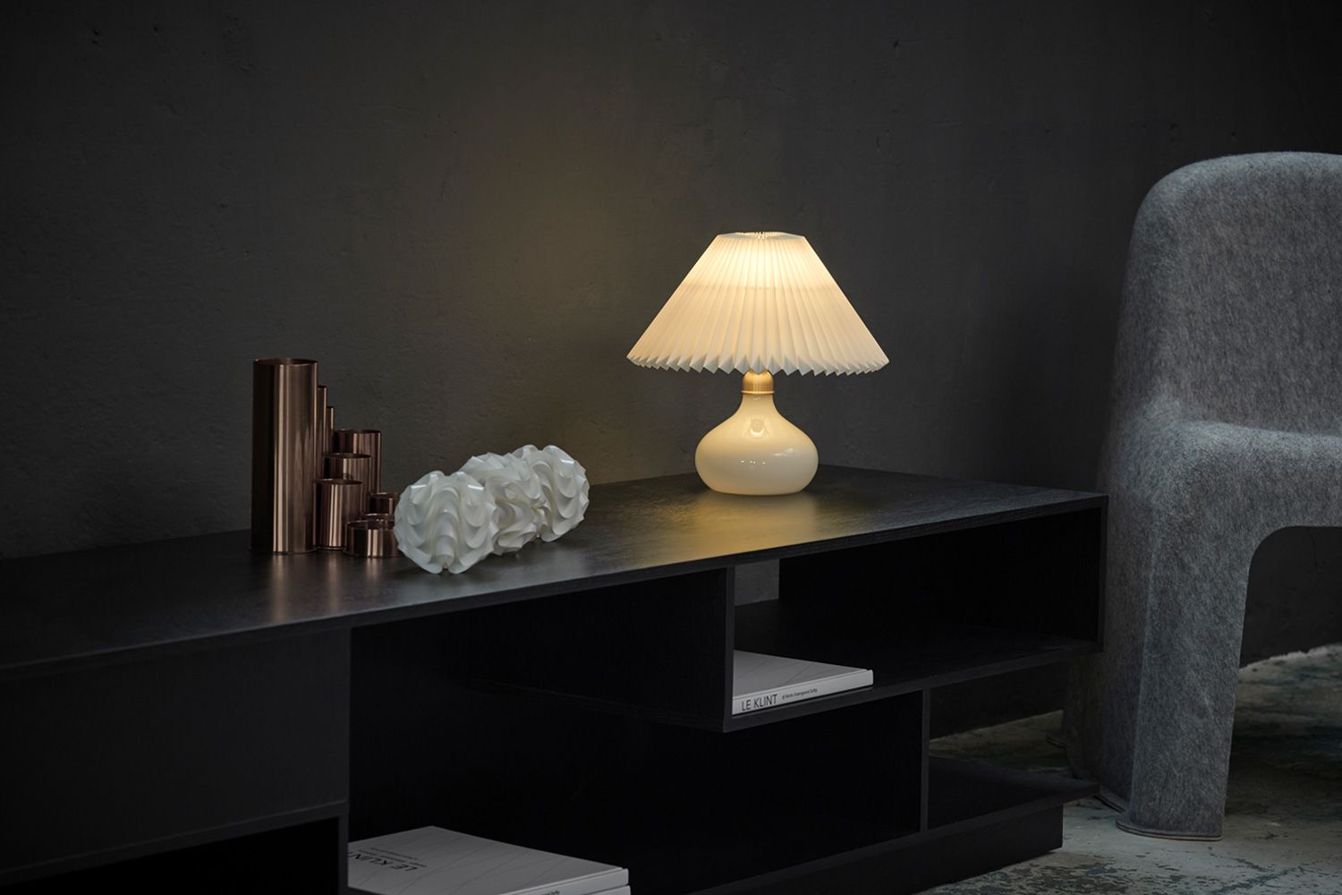 CLASSIC TABLE LAMP KT314(クラシック テーブルランプ KT314)は、日本の折り紙に着想を得た直線美が特徴のLE KLINT(レ・クリント)クラシックシリーズです。規則的に折り重なるプリーツが、やわらかな光と美しい陰影を生み出し、ブランドの原点を象徴しています。