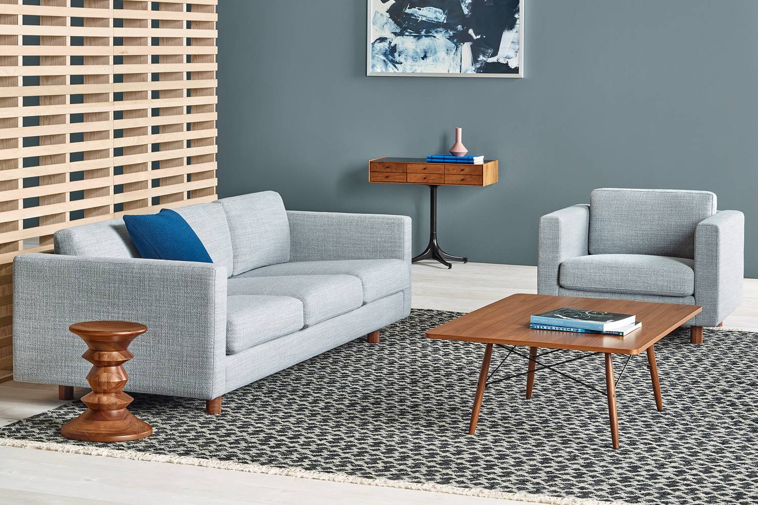 EAMES COFFEE TABLE(イームズ コーヒーテーブル)は、Charles & Ray Eames (チャールズ & レイ・イームズ)が1949年にパシフィック・パリセーズの自宅でデザインしたコーヒーテーブルを復刻したもので、木製ベースにメタルが斜めにかけられており、イームズシェルチェアの木製ダウエルベースを彷彿させます。 イームズオフィスと密接に連携してイームズのデザインを受け継いできたハーマンミラーが、この度、元々金箔で覆われていたレクタンギュラートップをより実用的な天板に変えました。