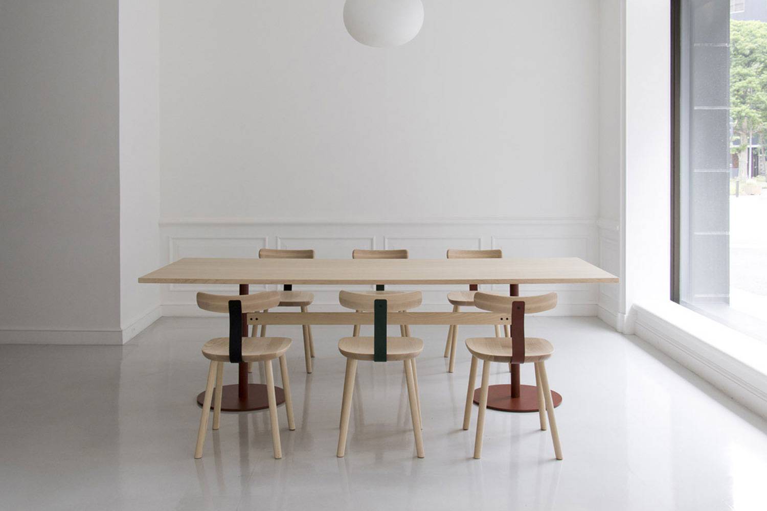 色のついたS字型のスチールは、木とのコントラストを引き立て、親しみやすさと新鮮さを与えています。