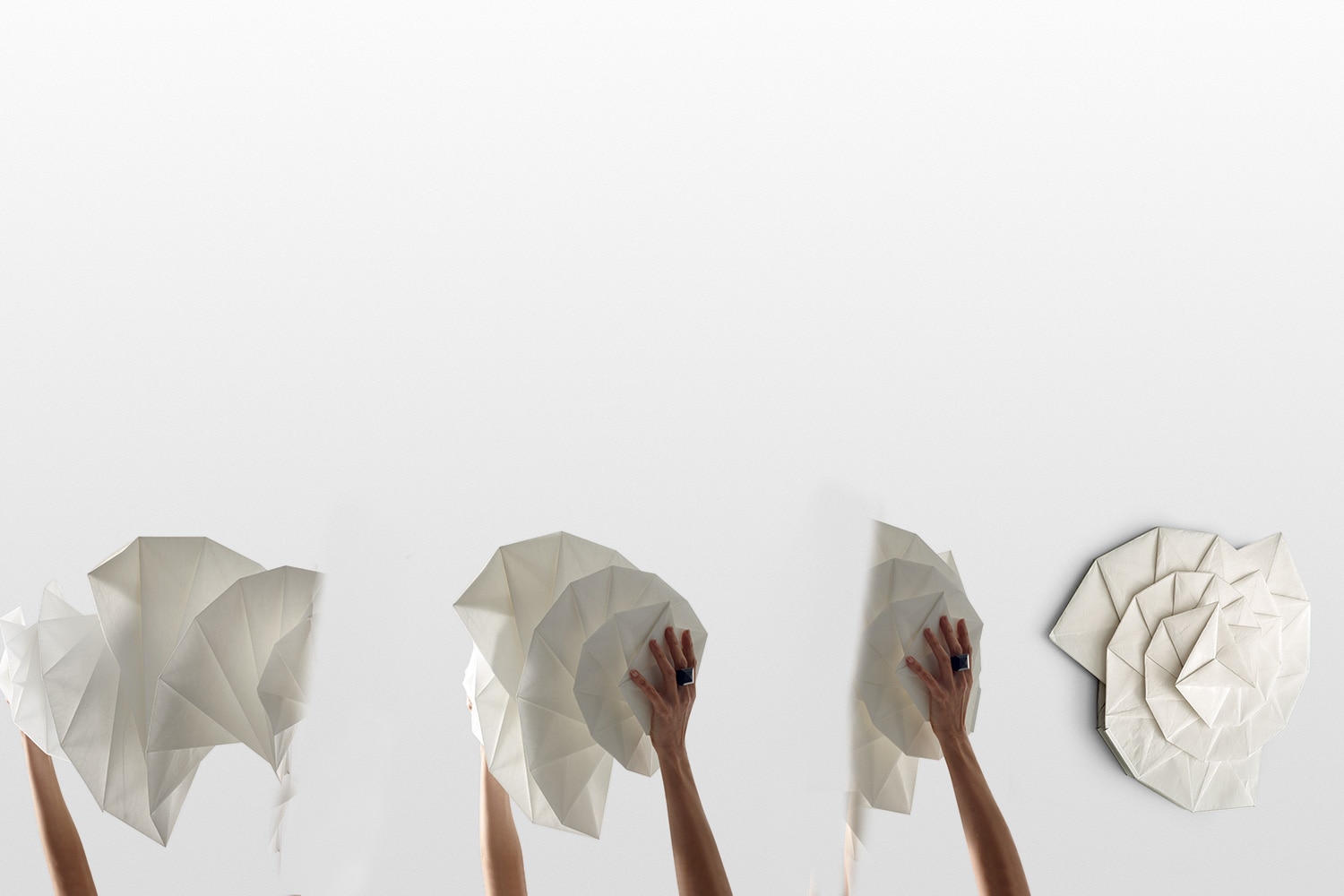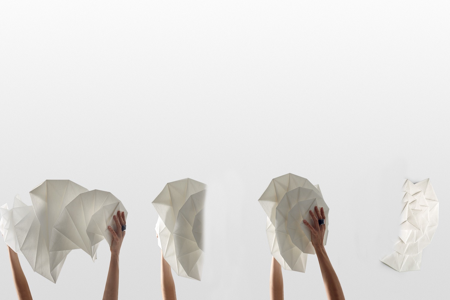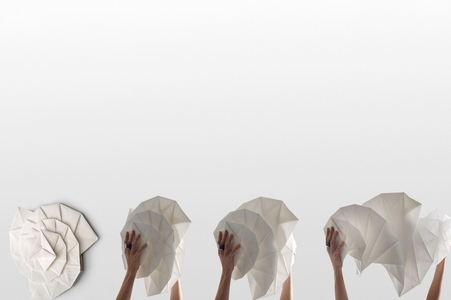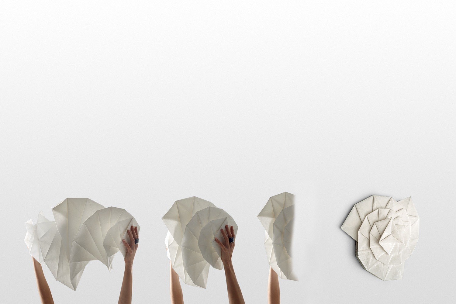 IN-EI MENDORI(陰翳)は、Issey Miyake (三宅 一生)が率いるリアリティ・ラボが着想・開発し、イタリアを代表する照明メーカーArtemide(アルテミデ)が製品化している照明器具です。シェードの折りたたまれた造形が螺旋状に回転しながら立体へ姿を変え、素材の特性によって構造体をもつことなく自立します。
