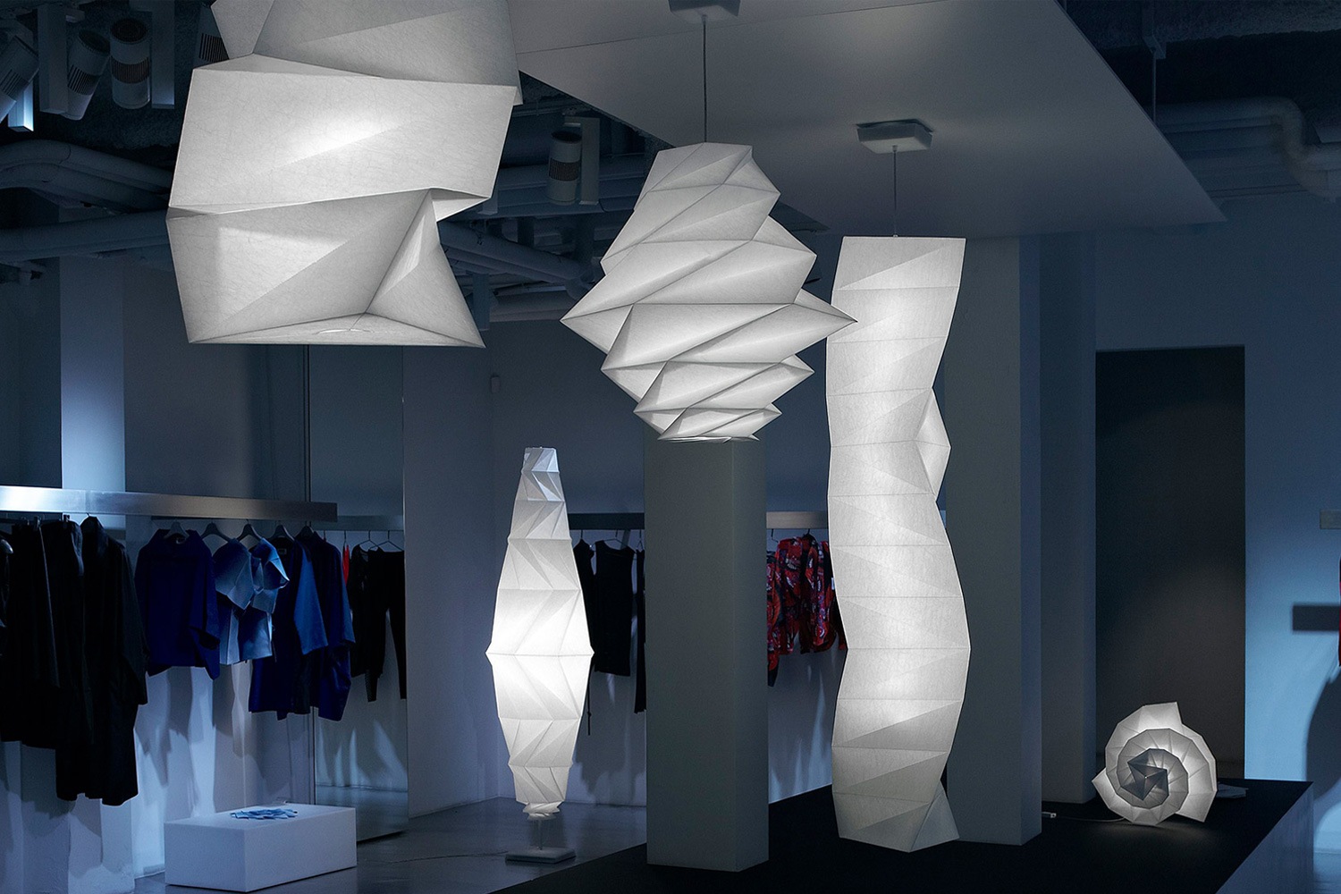 IN-EI TATSUNO-OTOSHIGO(陰翳)は、Issey Miyake (三宅 一生)が率いるリアリティ・ラボが着想・開発し、イタリアを代表する照明メーカーArtemide(アルテミデ)が製品化している照明器具です。シェードの折りたたまれた造形が螺旋状に回転しながら立体へ姿を変え、素材の特性によって構造体をもつことなく自立します。