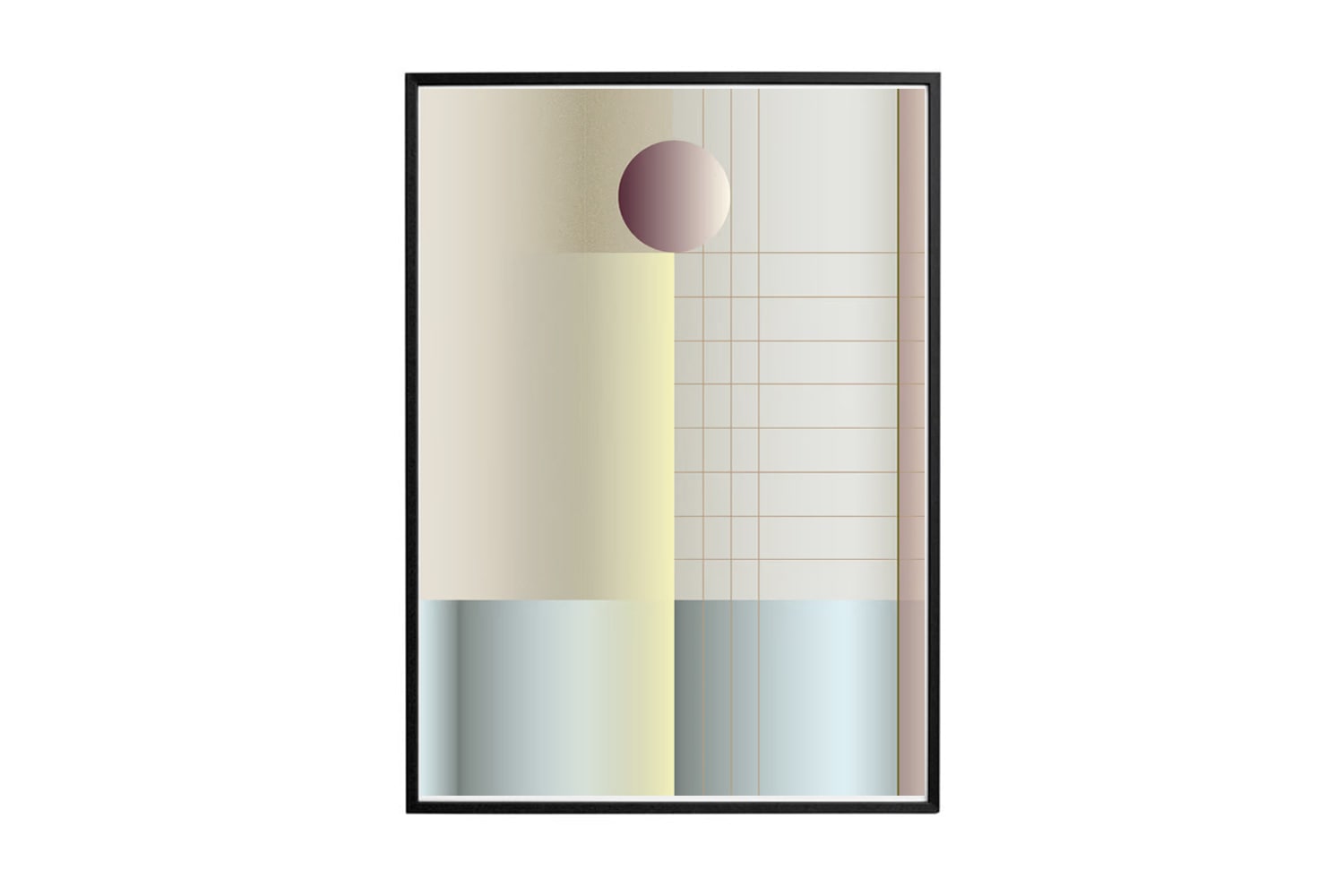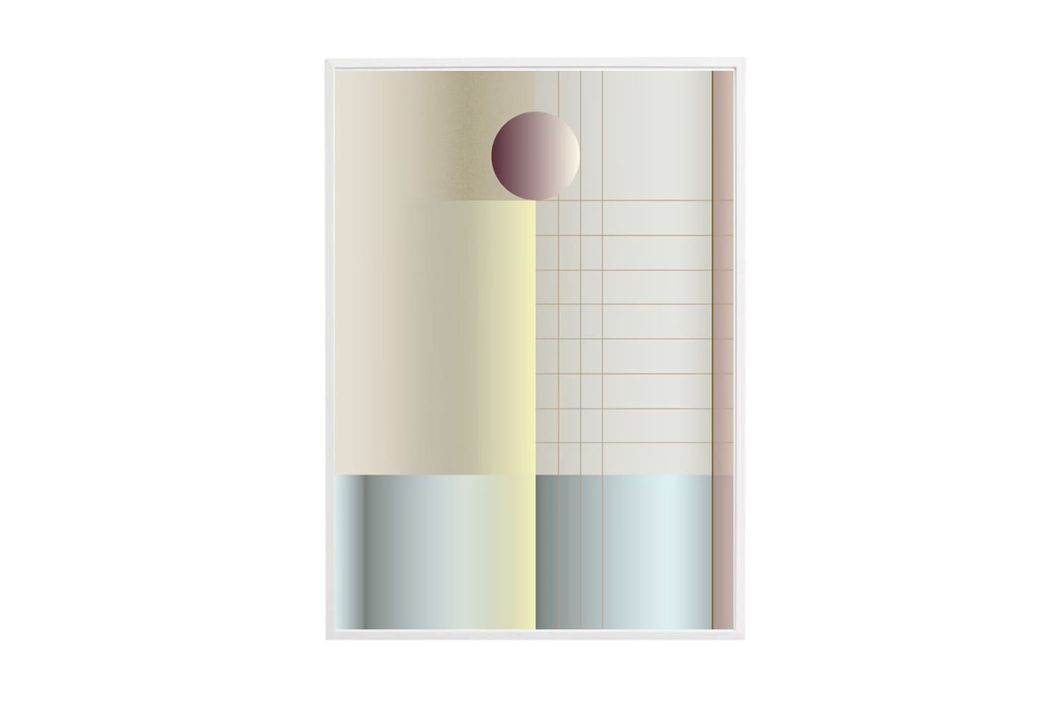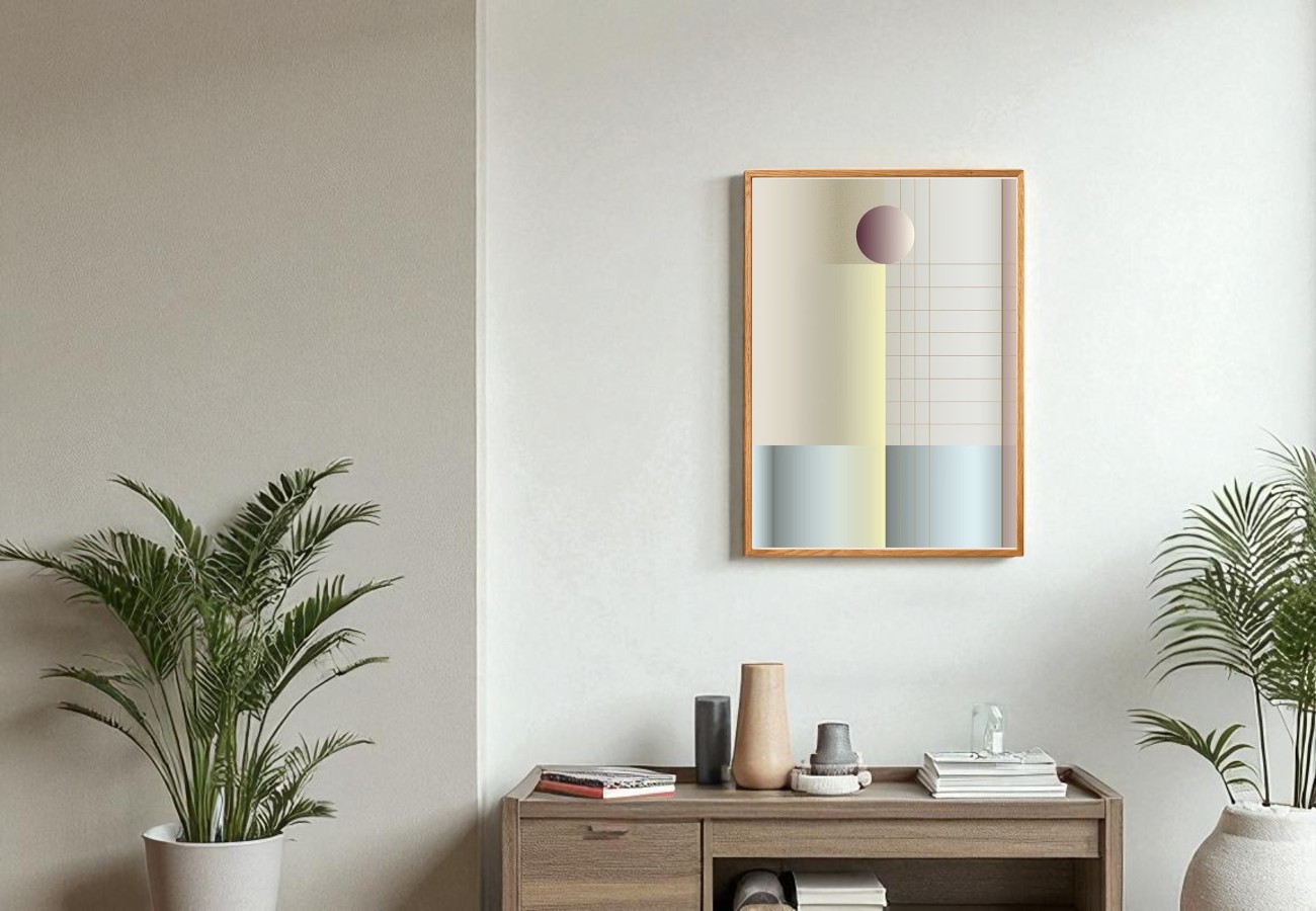 日本の屏風からインスパイアされた格子模様が、このアート・プリントにグラフィックのアイデンティティを与え、豊かなチェリー・トーンの球体のフォルムが特徴的です。
