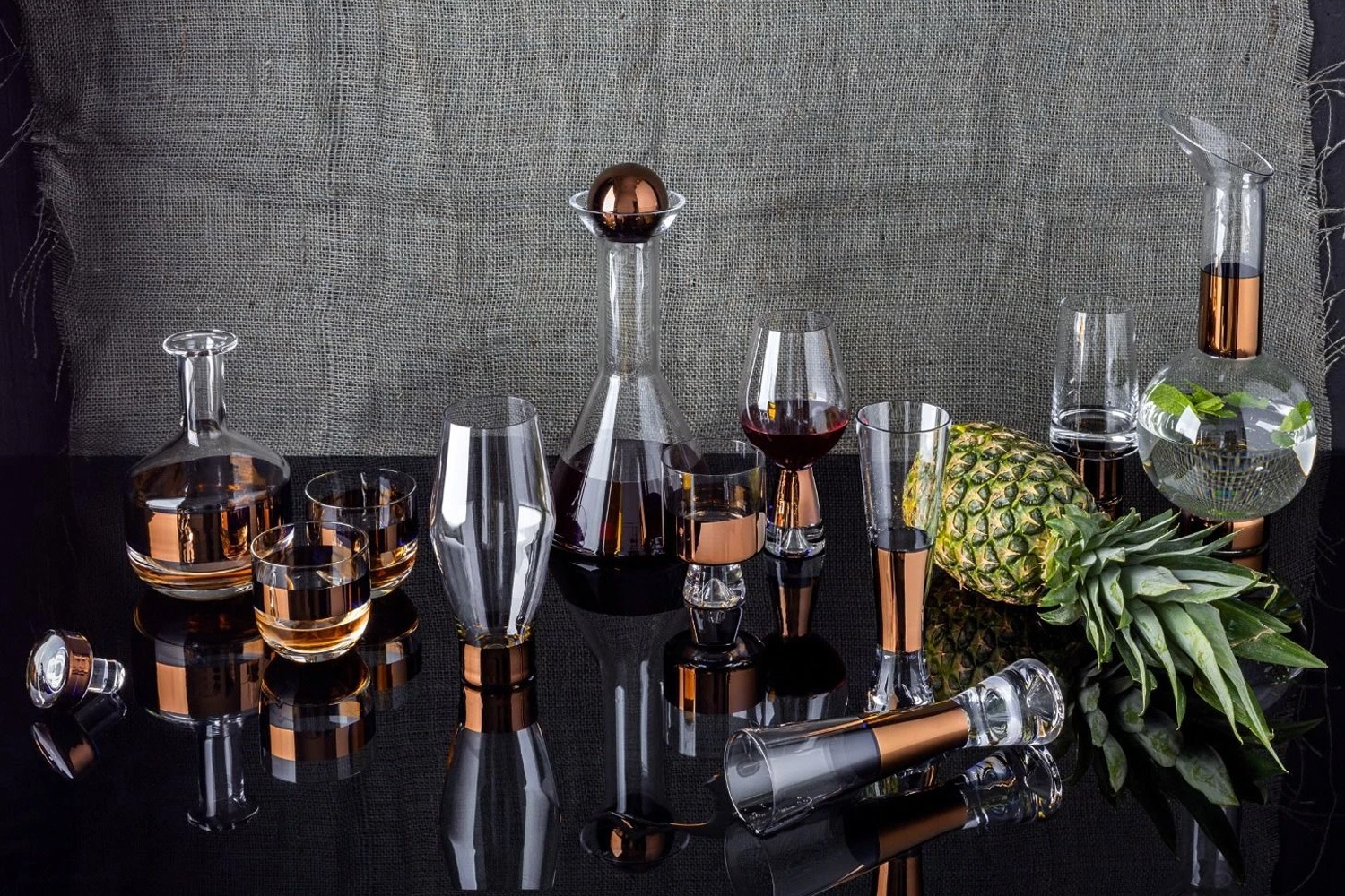 手描きの銅の帯が特徴のタンクは、科学的なガラス製の実験道具に見られる機能的な形状と重量感を持ちながらも、彫刻を思わせるような美しさを兼ね備えています。製造時の温度、湿度や職人の癖によって、形や重さ、塗装の濃淡などに個体差が発生しますが、それこそがハンドメイドの味わいですので、是非その違いをお楽しみください。