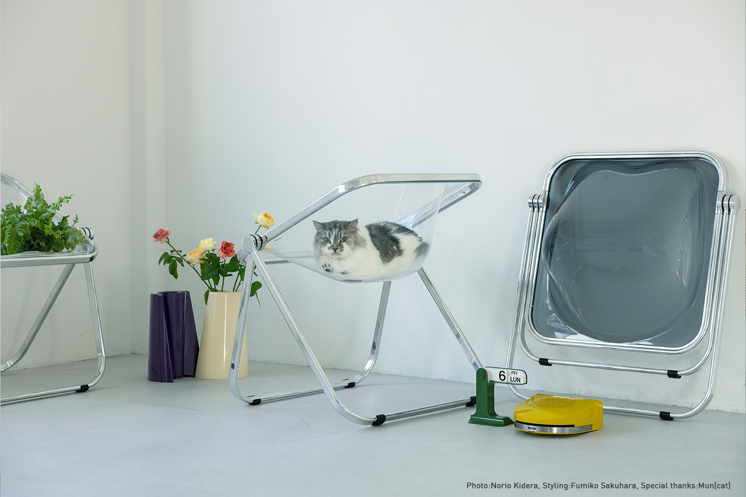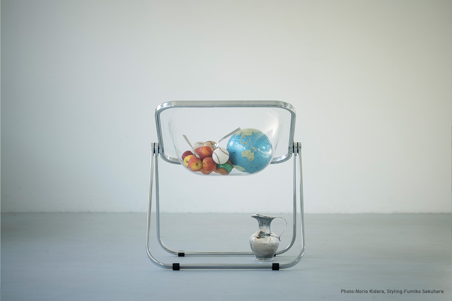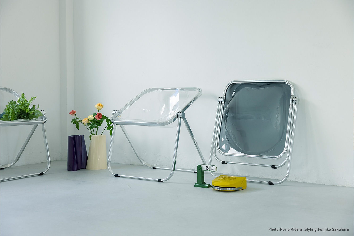 イタリアの名デザイナー、Giancarlo Piretti (ジャンカルロ・ピレッティ)が1970年に発表した折りたたみアームチェアは、1967年にデザインされた名作PLIA(プリアチェア)の構造を受け継ぎ、アルミニウム合金製の特殊な接合部によりスムーズな折りたたみを実現。スタッキングも可能で、省スペース性と高い機能性を兼ね備えています。座面には透明度と耐久性に優れたアクリル樹脂(PMMA)を採用。自動車ランプや大型水槽にも使用される素材で、天候や衝撃にも強く、長く美しさを保ちます。