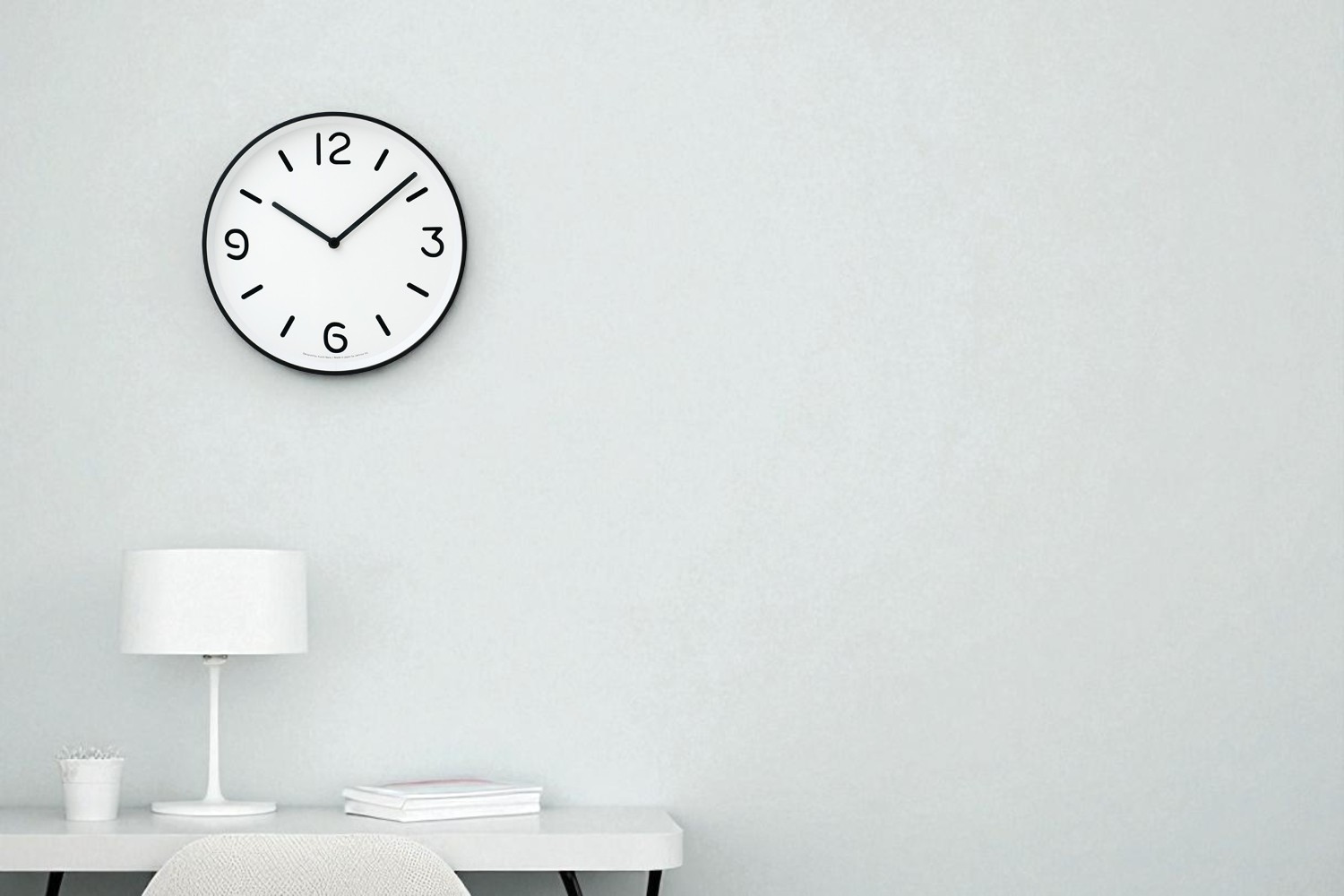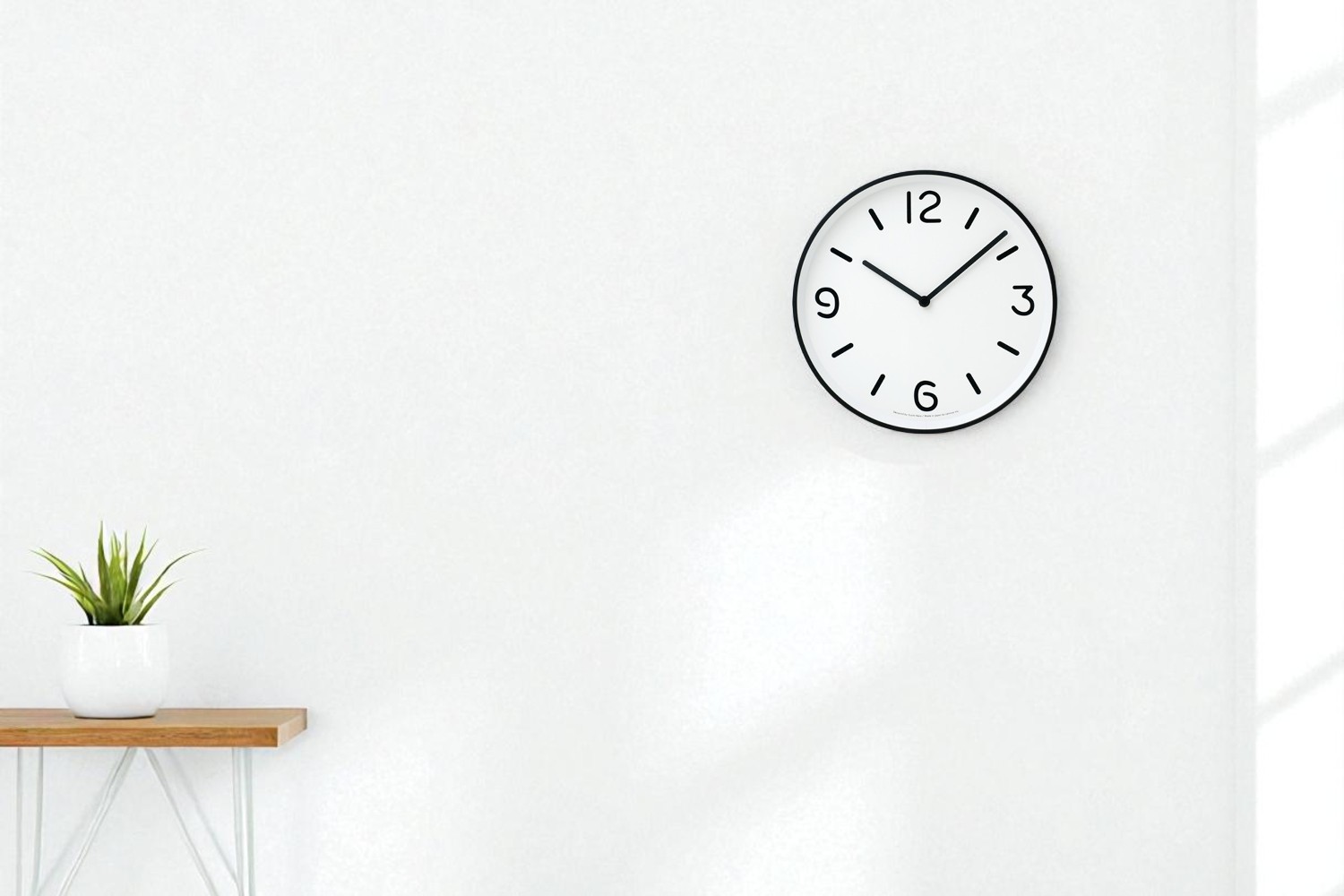 フレームの内側には、静かな白の余白が広がり、 その中央に、緊張感をたたえた黒の針と指標が整然と配置されています。 まるで白い紙の上に、繊細な線で描かれたグラフィックのように、 極限までそぎ落とされた構成が、時を視覚的に美しく伝えます。モノトーンのコントラストがつくる静謐なリズムは、 空間に凛とした表情を与えながらも、決して主張しすぎません。