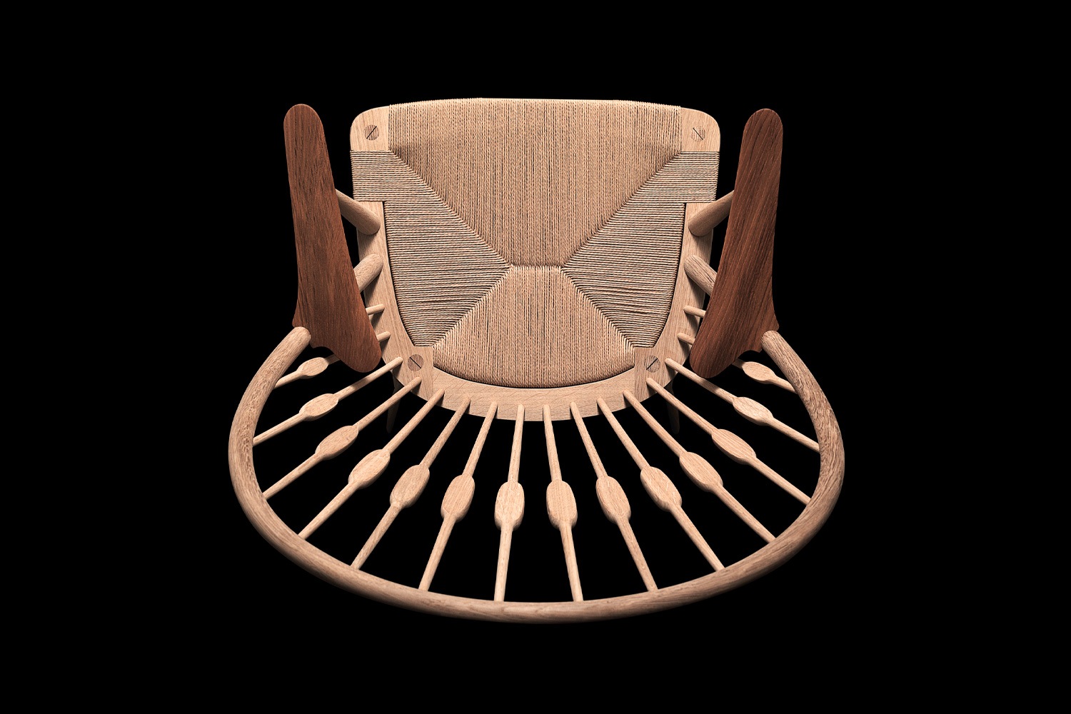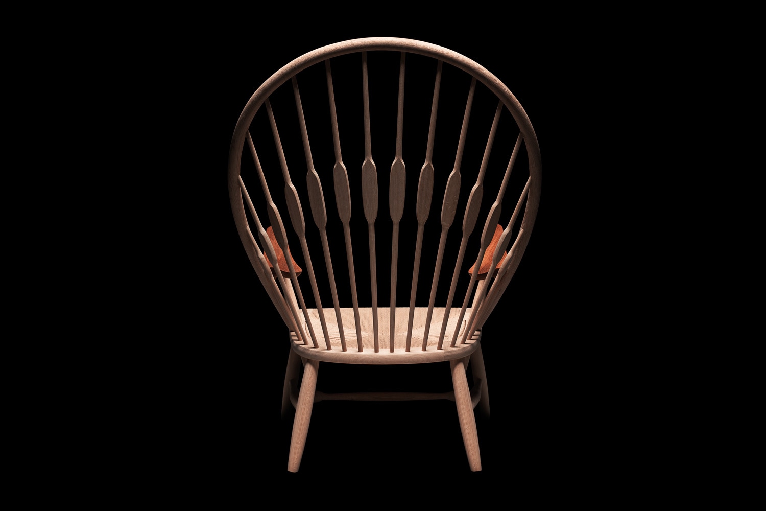 PP550 PEACOCK CHAIRは、大きく湾曲した背もたれが特徴的。座面とアーチを繋ぐように14本のパーツが組み込まれており、背もたれに寄りかかった際に肩甲骨のあたりが触れる位置に、平らな木部が設けられています。この部分こそ孔雀の羽を彷彿とさせ、優美さを印象付けますが、決して外観的な美しさの表現にとどまらず、人間工学的な機能性や快適な座り心地も同時に実現しているのです。