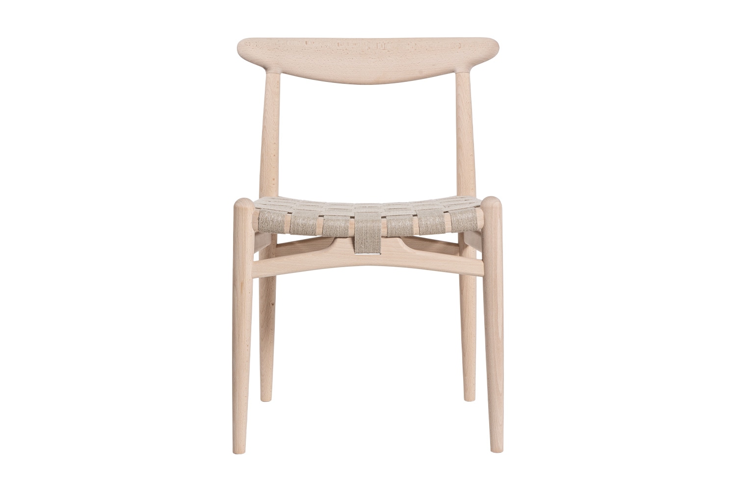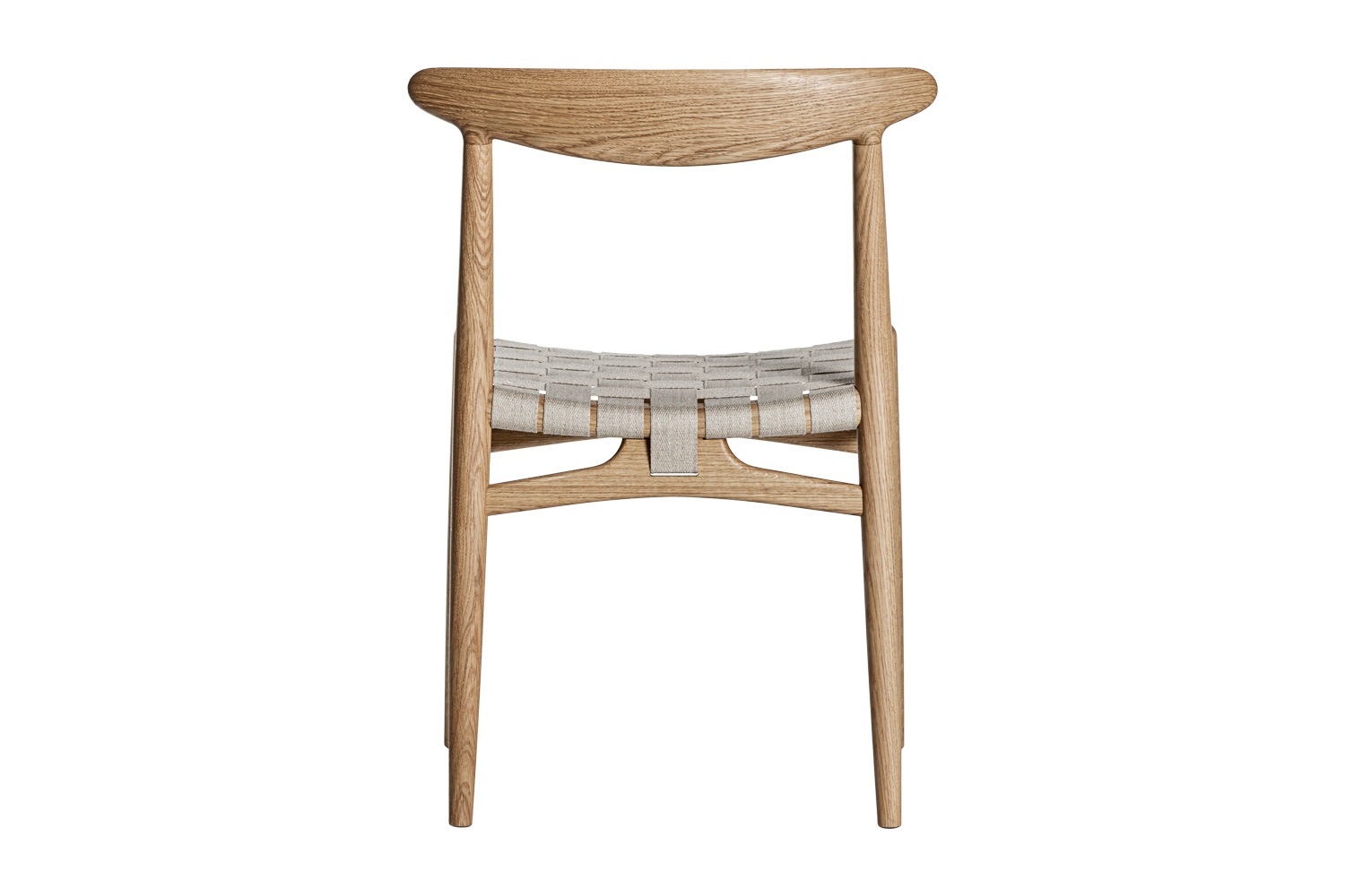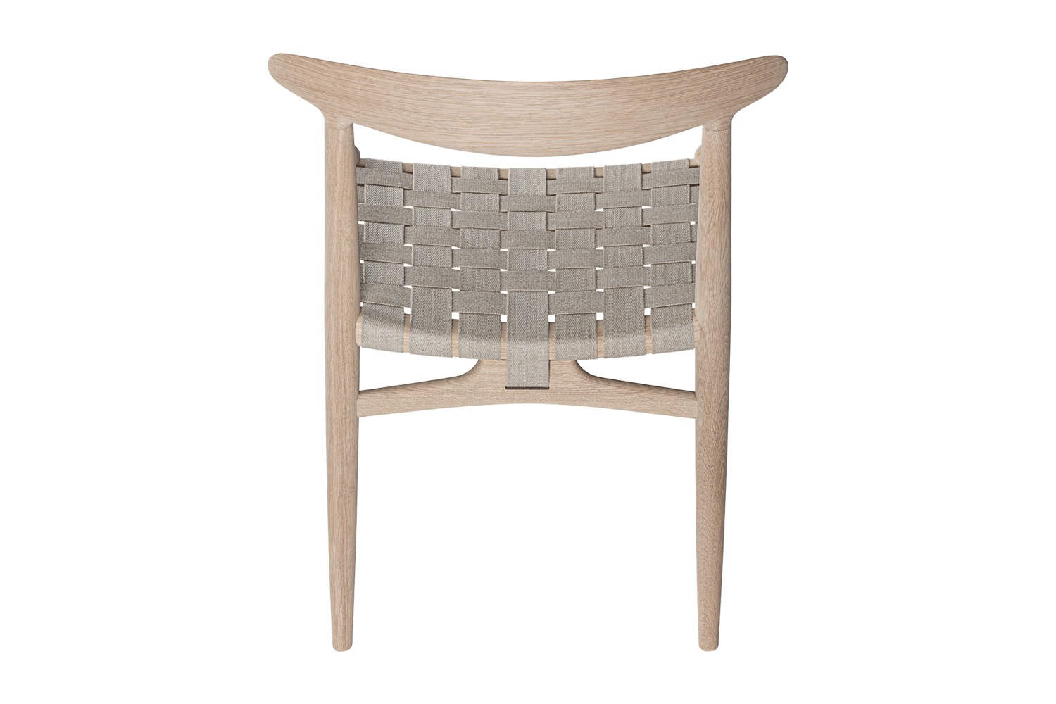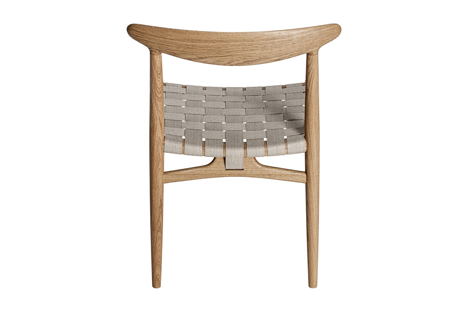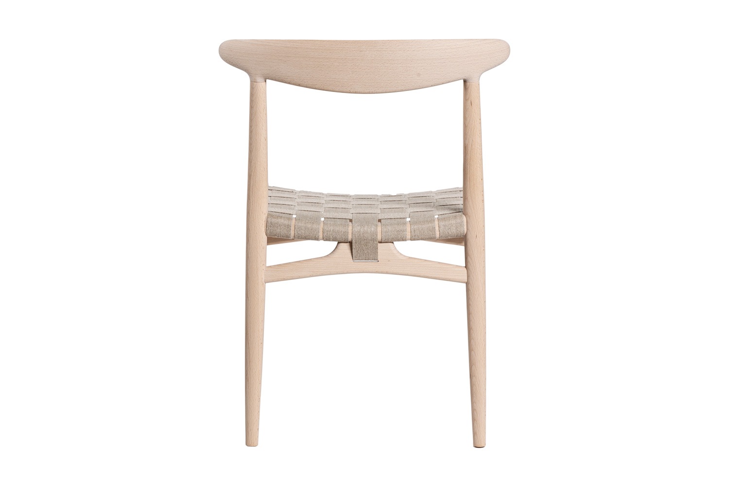 PP101チェアは、水平にカーブした背もたれや、リネンのウェビングで手織りされた座面、ウェビングの張力を維持するためにデザインされた優美なフロントレールが特徴的。ウェグナーの、プロポーションやディテールへのこだわりが見て取れます。