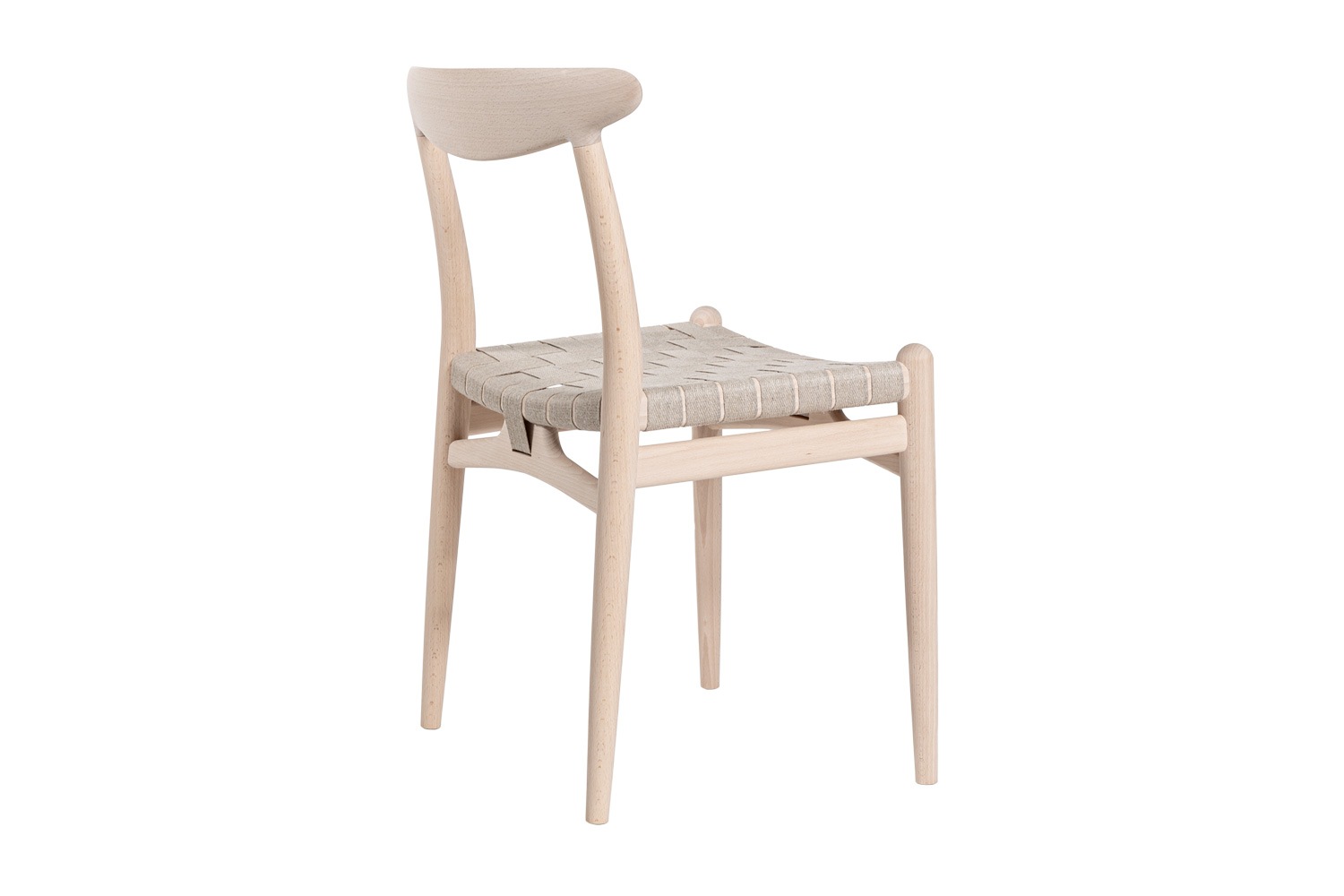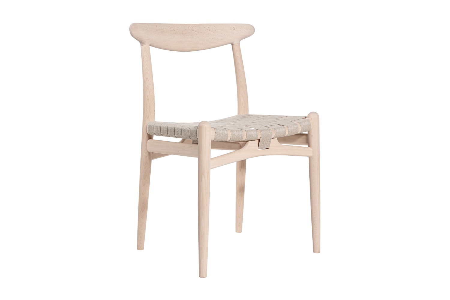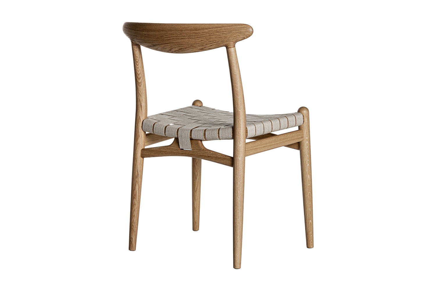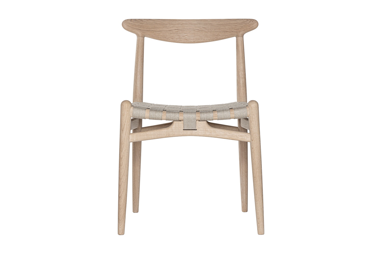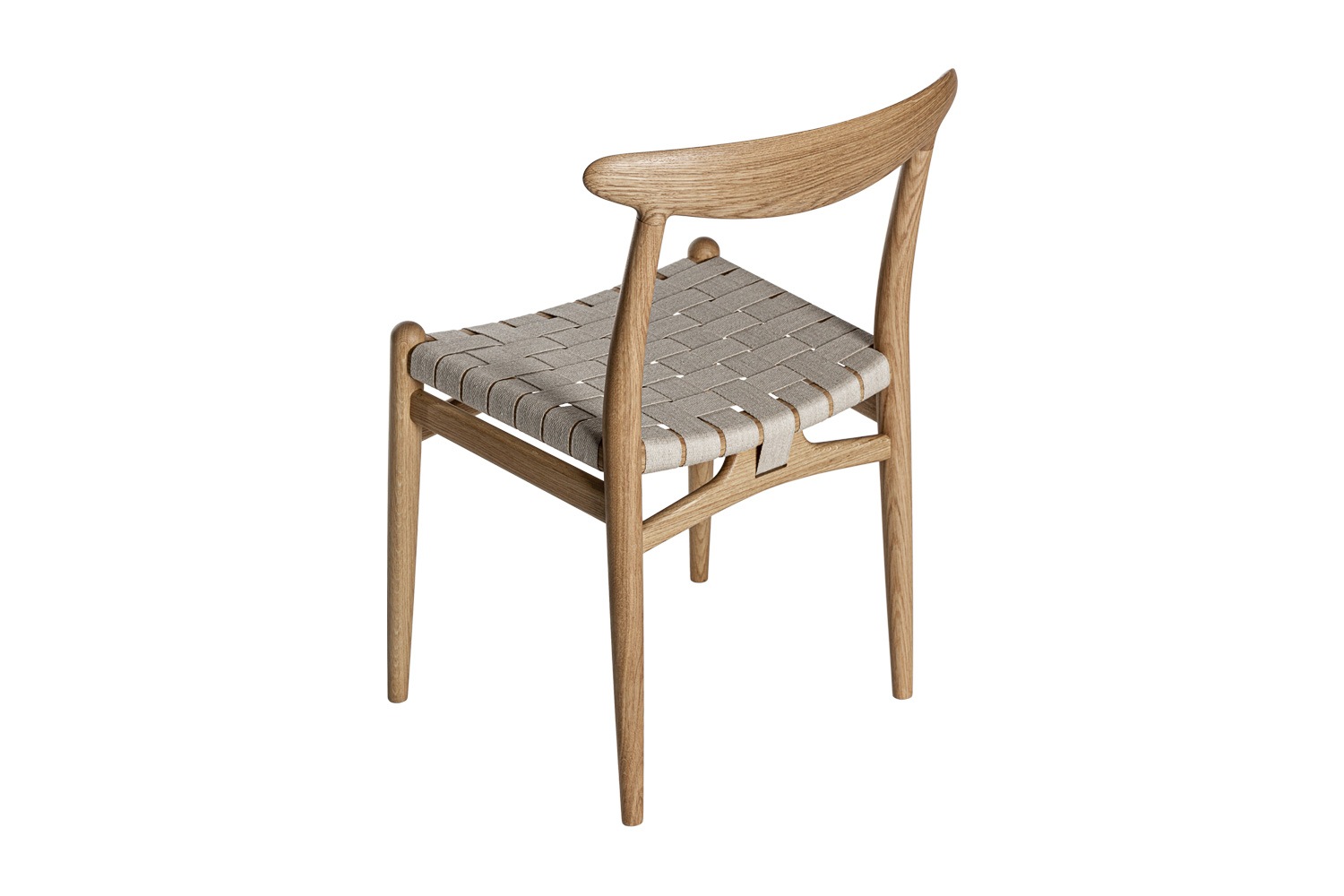 PP101チェアは、水平にカーブした背もたれや、リネンのウェビングで手織りされた座面、ウェビングの張力を維持するためにデザインされた優美なフロントレールが特徴的。ウェグナーの、プロポーションやディテールへのこだわりが見て取れます。